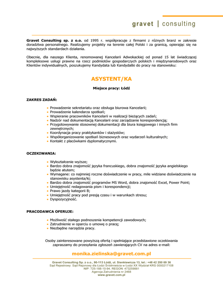 grave t consulting Gravet Consulting sp. z o.o. od 1995 r. współpracuje z firmami z różnych branż w zakresie doradztwa personalnego. Realizujemy projekty na terenie całej Polski i za granicą, opierając się na najwyższych standardach działania. Obecnie, dla naszego Klienta, renomowanej Kancelarii Adwokackiej od ponad 15 lat świadczącej kompleksowe usługi prawne na rzecz podmiotów gospodarczych polskich i międzynarodowych oraz Klientów indywidualnych, poszukujemy Kandydata lub Kandydatki do pracy na stanowisku: ASYSTENT/KA Miejsce pracy: Łódź ZAKRES ZADAŃ: Prowadzenie sekretariatu oraz obsługa biurowa Kancelarii; Prowadzenie kalendarza spotkań; Wspieranie pracowników Kancelarii w realizacji bieżących zadań; Nadzór nad dokumentacją Kancelarii oraz zarządzanie korespondencją; Przygotowywanie stosownej dokumentacji dla biura księgowego i innych firm zewnętrznych; • Koordynacja pracy praktykantów i stażystów; • Współorganizowanie spotkań biznesowych oraz wydarzeń kulturalnych; • Kontakt z placówkami dyplomatycznymi. • • • • • OCZEKIWANIA: • Wykształcenie wyższe; • Bardzo dobra znajomość języka francuskiego, dobra znajomość języka angielskiego będzie atutem; • Wymagane: co najmniej roczne doświadczenie w pracy, mile widziane doświadczenie na stanowisku asystenta/ki; • Bardzo dobra znajomość programów MS Word, dobra znajomość Excel, Power Point; • Umiejętność redagowania pism i korespondencji; • Prawo jazdy kategorii B; • Umiejętność pracy pod presją czasu i w warunkach stresu; • Dyspozycyjność. PRACODAWCA OFERUJE: • Możliwość stałego podnoszenia kompetencji zawodowych; • Zatrudnienie w oparciu o umowę o pracę; • Niezbędne narzędzia pracy. Osoby zainteresowane powyższą ofertą i spełniające przedstawione oczekiwania zapraszamy do przesyłania zgłoszeń zawierających CV na adres e-mail: [email protected] Gravet Consulting Sp. z o.o., 90-113 Łódź, ul. Sienkiewicza 13, tel.: +48 42 250 69 36 Sąd Rejestrowy: Sąd Rejonowy dla Łodzi Śródmieścia w Łodzi XX Wydział KRS 0000217108 NIP: 725-188-10-94, REGON: 473259881 Agencja Zatrudnienia nr 2468 www.gravet.com.pl grave t consulting W tytule wiadomości prosimy wpisać: AS/16 . Dziękując Państwu za zainteresowanie naszym projektem, informujemy, że skontaktujemy się wyłącznie z wybranymi Kandydatami. Prosimy o dopisanie w dokumentach aplikacyjnych następującej klauzuli: „Wyrażam zgodę na przetwarzanie moich danych osobowych i wprowadzenie ich do bazy danych firmy Gravet Consulting Sp. z o.o. z siedzibą w Łodzi, ul. Sienkiewicza 13, w celu przedstawiania mi ofert zatrudnienia, zgodnie z przepisami ustawy z 29.08.1997 o ochronie danych osobowych (Dz. U. z 2002 r. nr 101, poz. 926 z poźn. zm.). Przyjmuję do wiadomości, że przysługuje mi prawo wglądu do treści moich danych oraz ich poprawiania.” Gravet Consulting Sp. z o.o., 90-113 Łódź, ul. Sienkiewicza 13, tel.: +48 42 250 69 36 Sąd Rejestrowy: Sąd Rejonowy dla Łodzi Śródmieścia w Łodzi XX Wydział KRS 0000217108 NIP: 725-188-10-94, REGON: 473259881 Agencja Zatrudnienia nr 2468 www.gravet.com.pl