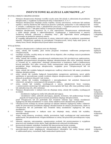 1/1/82 Zastrzega się pierwszeństwo tekstu oryginalnego INSTYTUTOWE KLAUZULE ŁADUNKOWE „A” RYZYKA OBJĘTE UBEZPIECZENIEM 1 Niniejsze ubezpieczenie obejmuje wszelkie ryzyka straty lub szkody w odniesieniu do przedmiotu ubezpieczenia, z wyjątkiem wymienionych niŜej w klauzulach 4, 5, 6 i 7. Niniejsze ubezpieczenie obejmuje awarię wspólną i koszty ratownictwa, rozliczone lub ustalone zgodnie z umową frachtową lub właściwym prawem i praktyką, poniesione w celu uniknięcia lub w związku z uniknięciem straty z jakiejkolwiek przyczyny, z wyjątkiem przyczyn wyłączonych w klauzulach 4,5,6 i 7 lub gdzie indziej w niniejszym ubezpieczeniu. Niniejsze ubezpieczenie rozszerza się w celu zapewnienia Ubezpieczonym odszkodowania z tytułu takiego udziału w odpowiedzialności, wynikającego z zamieszczonej w umowie frachtowej klauzuli „Zderzenia z obopólnej winy”, jaki odpowiada stracie podlegającej wyrównaniu na podstawie niniejszej umowy. W wypadku jakiegokolwiek rozszerzenia ze strony właścicieli statku na podstawie wspomnianej klauzuli, Ubezpieczeni zgadzają się powiadomić Ubezpieczycieli, którzy będą mieli prawo, na własny koszt, bronić ubezpieczonych przed takim roszczeniem. 2 3 Klauzula ryzyk Klauzula awarii wspólnej Klauzula „Zderzenia z obopólnej winy” WYŁĄCZENIA 4 4.1 4.2 4.3 4.4 4.5 4.6 4.7 5 5.1 5.2 6 6.1 6.2 6.3 7 7.1 Niniejsze ubezpieczenie w Ŝadnym razie nie obejmuje: straty, szkody lub wydatku, jakie moŜna przypisać świadomie wadliwemu postępowaniu Ubezpieczonych, zwykłego wycieku, zwykłej utraty na wadze lub na objętości, albo zwykłego zuŜycia przedmiotu objętego ubezpieczeniem, straty, szkody lub wydatku, spowodowanych niedostatecznym lub niewłaściwym opakowaniem, względnie przygotowaniem przedmiotu objętego ubezpieczeniem (dla celów niniejszej klauzuli 4.3 rozumie się, Ŝe „opakowanie” obejmuje zasztauowanie w kontenerze, bądź w podnoszonym krytym pojeździe, lecz tylko wówczas, kiedy zasztauowanie takie przeprowadzone jest przed początkiem biegu niniejszego ubezpieczenia, względnie przez Ubezpieczonych lub ich podwładnych), straty, szkody lub wydatku będących następstwem wadliwej właściwości lub natury przedmiotu objętego ubezpieczeniem, straty, szkody lub wydatku będących bezpośrednim następstwem opóźnienia, nawet gdyby opóźnienie to spowodowane zostało ryzykiem objętym ubezpieczeniem (z wyjątkiem wydatków płatnych na podstawie klauzuli 2 jak wyŜej), straty, szkody lub wydatku wynikających z niewypłacalności lub uchybień finansowych właścicieli, zarządców, czarterujących lub armatorów statku, straty, szkody lub wydatku, wynikających z uŜycia jakiejkolwiek broni wojennej, z zastosowaniem atomowego lub jądrowego rozszczepienia lub fuzji, albo innej podobnej reakcji lub radioaktywnej siły, albo substancji. Niniejsze ubezpieczenie w Ŝadnym razie nie obejmuje straty, szkody lub wydatku, wynikających na skutek: - niezdatności Ŝeglugowej statku lub jednostki pływającej, - niezdatności statku, jednostki pływającej, pojazdu, kontenera, lub podnoszonego krytego pojazdu do bezpiecznego przewiezienia przedmiotu objętego ubezpieczeniem, jeŜeli Ubezpieczeni lub ich podwładni byli świadomi istnienia tego rodzaju niezdatności Ŝeglugowej lub innej niezdatności w czasie, kiedy załadowywano ubezpieczony przedmiot. Ubezpieczyciele zrzekają się zarzutu opartego na rękojmi zdatności Ŝeglugowej statku i zdatności statku do przewiezienia przedmiotu objętego ubezpieczeniem do miejsca przeznaczenia, chyba Ŝe Ubezpieczeni lub ich podwładni byli świadomi takiej niezdatności Ŝeglugowej lub innej niezdatności. Niniejsze ubezpieczenie w Ŝadnym razie nie obejmuje straty, szkody lub wydatku, spowodowanych: wojną, wojną domową, rewolucją, rebelią, powstaniem, bądź wynikającymi stąd zamieszkami społecznymi, lub jakimkolwiek wrogim działaniem ze strony lub przeciwko prowadzącemu wojnę państwu, zaborem, zajęciem, zatrzymaniem, ograniczeniem swobody lub przetrzymaniem (z wyjątkiem piractwa) oraz skutkami tychŜe aktów, bądź jakichkolwiek usiłowań ich dokonania, porzuconymi minami, torpedami, bombami lub inną porzuconą bronią wojenną. Niniejsze ubezpieczenie w Ŝadnym razie nie obejmuje straty, szkody, lub wydatku: spowodowanych przez strajkujących, zlokautowanych robotników lub osoby biorące udział w zakłóceniach pracy, rozruchach, bądź zamieszkach społecznych, Klauzula ogólnych wyłączeń Klauzula wyłączenia niezdatności Ŝeglugowej i innej Klauzula wyłączenia wojny Klauzula wyłączenia strajku 1/1/82 7.2 7.3 wynikających ze strajków, lokautów, zakłóceń pracy, rozruchów, bądź zamieszek społecznych, spowodowanych przez jakiegokolwiek terrorystę lub jakąkolwiek osobę działającą z pobudek politycznych. CZAS TRWANIA 8 8.1 Niniejsze ubezpieczenie rozpoczyna się z chwilą, kiedy towary opuszczają magazyn lub miejsce składowania w miejscu wymienionym w niniejszej umowie jako miejsce rozpoczęcia przewozu, biegnie podczas zwykłego przebiegu przewozu i kończy się, bądź to: 8.1.1 z chwilą dostarczenia do magazynu lub miejsca składowania odbiorców, albo innego końcowego magazynu lub miejsca składowania, w miejscu przeznaczenia wymienionym w niniejszej umowie, 8.1.2 z chwilą dostarczenia do jakiegokolwiek innego magazynu lub miejsca składowania, czy to przed miejscem przeznaczenia, czy to w miejscu przeznaczenia wymienionym w niniejszej umowie, jakie Ubezpieczeni wybiorą w celu skorzystania z niego, bądź to: 8.1.2.1 - dla składowania innego, aniŜeli podczas zwykłego przebiegu przewozu, albo 8.1.2.2 - dla przydzielenia, albo rozprowadzenia, bądź to 8.1.3 z upływem 60 dni po zakończeniu wyładowania poza burtę towarów ubezpieczonych niniejszą umową, ze statku morskiego w końcowym porcie wyładunku, którakolwiek z tych okoliczności zdarzy się najpierw. 8.2 JeŜeli towary, po ich wyładowaniu poza burtę ze 