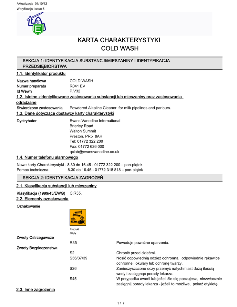 Aktualizacja 01/10/12 Weryfikacja Issue 5 KARTA CHARAKTERYSTYKI COLD WASH SEKCJA 1: IDENTYFIKACJA SUBSTANCJI/MIESZANINY I IDENTYFIKACJA PRZEDSIĘBIORSTWA 1.1. Identyfikator produktu Nazwa handlowa Numer preparatu Id Wewn COLD WASH R041 EV P.V32 Stwierdzone zastosowania Powdered Alkaline Cleaner for milk pipelines and parlours. Dystrybutor Evans Vanodine International Brierley Road Walton Summit Preston. PR5 8AH Tel: 01772 322 200 Fax: 01772 626 000 [email protected] 1.2. Istotne zidentyfikowane zastosowania substancji lub mieszaniny oraz zastosowania odradzane 1.3. Dane dotyczące dostawcy karty charakterystyki 1.4. Numer telefonu alarmowego Nowe karty Charakterystyki - 8.30 do 16.45 - 01772 322 200 – pon-piątek Pomoc techniczna 8.30 do 16.45 - 01772 318 818 – pon-piątek SEKCJA 2: IDENTYFIKACJA ZAGROŻEŃ 2.1. Klasyfikacja substancji lub mieszaniny Klasyfikacja (1999/45/EWG) 2.2. Elementy oznakowania C;R35. Oznakowanie Produkt żrący Zwroty Ostrzegawcze Zwroty Bezpieczenstwa R35 Powoduje poważne oparzenia. S2 S36/37/39 Chronić przed dziećmi. Nosić odpowiednią odzież ochronną, odpowiednie rękawice ochronne i okulary lub ochronę twarzy. Zanieczyszczone oczy przemyć natychmiast dużą ilością wody i zasięgnąć porady lekarza. W przypadku awarii lub jeżeli źle się poczujesz, niezwłocznie zasięgnij porady lekarza - jeżeli to możliwe, pokaż etykietę. S26 S45 2.3. Inne zagrożenia 1/ 7 COLD WASH SEKCJA 3: SKŁAD/INFORMACJA O SKŁADNIKACH 3.2. Mieszaniny WODOROTLENEK SODU Numer CAS: 1310-73-2 60-100% Numer WE: 215-185-5 Klasyfikacja (WE 1272/2008) Skin Corr. 1A - H314 Numer Rejestracyjny: 01-2119457892-27-xxxx Klasyfikacja (67/548/EWG) C;R35 SODIUM METASILICATE PENTAHYDRATE Numer CAS: 10213-79-3 10-20% Numer WE: Klasyfikacja (WE 1272/2008) Skin Corr. 1B - H314, H315 Skin Irrit. 2 - H314, H315 Eye Irrit. 2 - H319 Klasyfikacja (67/548/EWG) C;R34. Xi;R36/38. WĘGLAN SODU Numer CAS: 497-19-8 10-20% Numer WE: 207-838-8 Klasyfikacja (WE 1272/2008) Eye Irrit. 2 - H319 Klasyfikacja (67/548/EWG) Xi;R36 Pełny tekst zwrotów wskazujących rodzaj zagrożenia (zwrotów R) i określeń zagrożeń jest przedstawiony w sekcji 16. SEKCJA 4: ŚRODKI PIERWSZEJ POMOCY 4.1. Opis środków pierwszej pomocy Wdychanie Niezwłocznie wynieść/wyprowadzić osobę narażoną na wdychanie na świeże powietrze. W przypadku utrzymującego się dyskomfortu skontaktować się z lekarzem. Spożycie NIE WYWOŁYWAĆ WYMIOTÓW! Dokładnie wypłukać usta. Wypić kilka szklanek wody albo mleka. Natychmiast zapewnić opiekę lekarską! Kontakt ze skórą Natychmiast umyć skórę wodą z mydłem. Jeśli po myciu pojawią się objawy, niezwłocznie skontaktować się z lekarzem. Kontakt z oczami Niezwłocznie przemyć oczy dużą ilością wody, podnosząc powieki. Natychmiast skontaktować się z lekarzem. Kontynuować płukanie. 4.2. Najważniejsze ostre i opóźnione objawy oraz skutki narażenia Informacja ogólna Nasilenie opisanych objawów będzie różne, w zależności od stężenia substancji i długości okresu narażenia. Wdychanie Podrażnienie nosa, krtani i dróg oddechowych. Spozycie Może wywołać chemiczne poparzenia jamy ustnej i krtani. 2/ 7 COLD WASH Kontakt ze skórą Palący ból i poważne uszkodzenie skóry wskutek żarcia. Może spowodować poważne oparzenia chemiczne skóry. Kontakt z oczami Ostre podrażnienie oczu i śluzówek, uczucie palenia i łzawienie. Uszkodzenie rogówki. 4.3. Wskazania dotyczące wszelkiej natychmiastowej pomocy lekarskiej i szczególnego postępowania z poszkodowanym Leczyć objawowo. SEKCJA 5: POSTĘPOWANIE W PRZYPADKU POŻARU 5.1. Środki gaśnicze Środki gaśnicze Produkt nie jest łatwo palny. Przy doborze środków gaszenia pożaru uwzględnić ewentualną obecność innych środków chemicznych. 5.2. Szczególne zagrożenia związane z substancją lub mieszaniną Zagrożenia specyficzne Wskutek nagrzewania lub pożaru mogą wydzielać się szkodliwe pary/gazy. 5.3. Informacje dla straży pożarnej Środki ochrony personelu straży pożarnej W warunkach pożarowych stosować urządzenia oddechowe z własnym obiegiem powietrza i odzież ochronną na całe ciało. SEKCJA 6: POSTĘPOWANIE W PRZYPADKU NIEZAMIERZONEGO UWOLNIENIA DO ŚRODOWISKA 6.1. Indywidualne środki ostrożności, wyposażenie ochronne i procedury w sytuacjach awaryjnych Stosować odzież ochronną zgodnie z sekcją 8 niniejszej karty charakterystyki preparatu niebezpiecznego. Unikać wdychania pyłu. 6.2. Środki ostrożności w zakresie ochrony środowiska O wycieku i niekontrolowanym zrzucie do cieków wodnych należy NATYCHMIAST poinformować odpowiedni organ nadzoru rzecznego albo inne właściwe władze. 6.3. Metody i materiały zapobiegające rozprzestrzenianiu się skażenia i służące do usuwania skażenia Niewielkie ilości można spłukać do kanalizacji dużą ilością wody. Duże zanieczyszczenia: Zebrać za pomocą urządzenia próżniowego albo chłonną substancją stałą, przechowywać w zamkniętym pojemniku do usunięcia. 6.4. Odniesienia do innych sekcji W sprawie indywidualnych środków ochrony - patrz pkt 8. SEKCJA 7: POSTĘPOWANIE Z SUBSTANCJAMI I MIESZANINAMI ORAZ ICH MAGAZYNOWANIE 7.1. Środki ostrożności dotyczące bezpiecznego postępowania Chronić oczy przed kontaktem. Chronić skórę przed kontaktem. Unikać wdychania pyłu. Nie wolno wlewać wody bezpośrednio do preparatu, ponieważ grozi to gwałtowną reakcją i wrzeniem. W celu rozcieńczenia ostrożnie wlewać preparat do wody. 7.2. Warunki bezpiecznego magazynowania, łącznie z informacjami dotyczącymi wszelkich wzajemnych niezgodności Przechowywać w szczelnie zamkniętym oryginalnym opakowaniu w suchym, chłodnym miejscu z dobrą wentylacją. 7.3. Szczególne zastosowanie(-a) końcowe Stwierdzone zastosowania tego produktu są wyszczególnione w Sekcji 1.2. 3/ 7 COLD WASH Opis Uzytkowania See Product Information Sheet & Label for detailed use of this product. SEKCJA 8: KONTROL