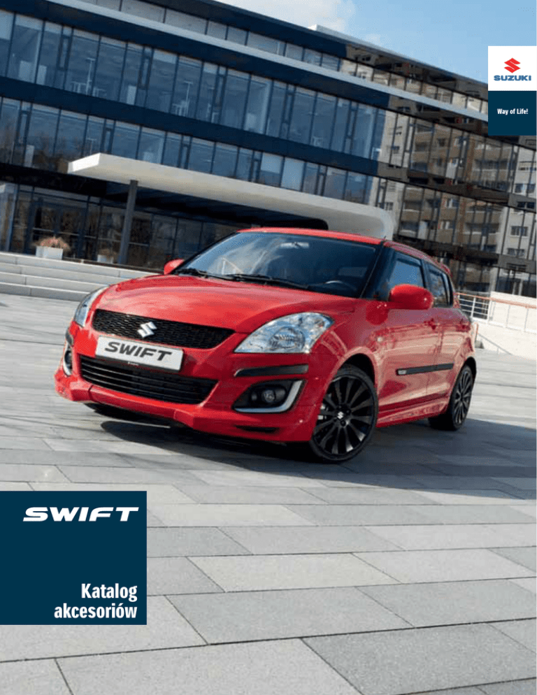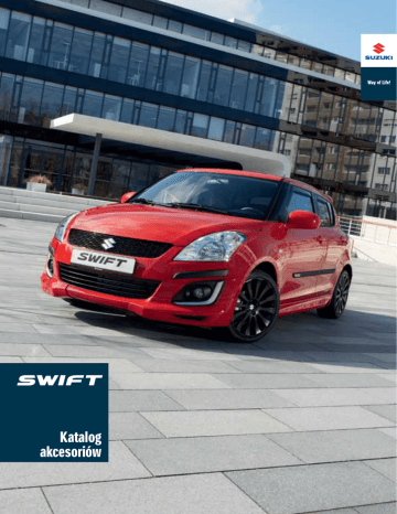Katalog akcesoriów Wyraź swoją indywidualność Twój Swift otrzymał osobisty rys już w fabryce, jednak nie powstrzymuje to pragnienia, aby jeszcze bardziej zindywidualizować swoje auto i zbliżyć je do wymarzonego ideału – zarówno pod względem wyglądu, jak i funkcjonalności. Tu właśnie z pomocą przychodzą oryginalne akcesoria Suzuki, pozwalające nadać Twemu autu ten jedyny, niepowtarzalny styl. Szeroki wybór wyposażenia i dodatków, począwszy od elementów dekoracyjnych po akcesoria zapewniające bezpieczeństwo czy też urządzenia audio i nawigacji, umożliwi Ci nadanie nadwoziu i wnętrzu auta własnych akcentów. To wszystko dla Swifta, który jest w 100% Twój. Uwaga: Niniejszy katalog ma zastosowanie do pojazdów Suzuki Swift począwszy od numeru VIN TSMNZ######400001. Szczegółowe informacje można uzyskać u autoryzowanego dealera Suzuki. www.suzuki.pl Niektóre ilustracje w niniejszej broszurze mogą przedstawiać wyposażenie specjalne lub dodatkowe. W celu zapoznania się z aktualną listą wyposażenia oraz cennikiem prosimy zwrócić się do autoryzowanego dealera Suzuki. 3 Nadwozie Pokaż swój indywidualny styl Jak sprawić, aby obserwator z zewnątrz był przekonany, że kierowca w środku jest ekspertem w stylowym wyposażeniu auta? Za pomocą akcesoriów nadwoziowych, które natychmiast przyciągają wzrok swoim wyglądem. Przedni spoiler, sportowe osłony progów, tylny spoiler, spoiler dachowy oraz szereg dodatków zewnętrznych – wszystko to zaprojektowano, aby wzbudzić emocje kierowcy oraz jego „widowni”. Do aut Suzuki Swift od numeru nadwozia TSMNZ######400001. Wykluczony montaż z przednimi osłonami przeciwbłotnymi sztywnymi (nr kat. 990E0-68L11-000) i elastycznymi (nr kat. 990E0-68L13-000). 3 Wykluczony montaż z tylnymi osłonami przeciwbłotnymi sztywnymi (nr kat. 990E0-68L12-000) i elastycznymi (nr kat. 990E0-68L14-000). 4 Wykluczony montaż z poszerzeniami błotników (nr kat. 990E0-68L09-000 i 990E0-68L10-000). 5 Wykluczony montaż z hakiem holowniczym (nr kat. 990E0-68L42-000 i 990E0-68L43-000). 1 2 4 2 | Lampy przeciwmgielne1 w komplecie reflektory, obramowania i wiązki instalacyjne Nr kat. 990E0-60P51-000 3 | Chromowana krata wlotu powietrza1 1 Nr kat. 99000-99064-E1A 2 3 1 | Ramki ozdobne reflektorów dodają blasku reflektorom w Twoim aucie, powierzchnia niezagruntowana, możliwość polakierowania w kolorze nadwozia, 2 sztuki Nr kat. 99000-99013-A3L 4 | Przedni spoiler1,4 nadaje bardziej dynamiczny i sportowy wygląd, powierzchnia zagruntowana, możliwość polakierowania w kolorze nadwozia, zestaw dwuczęściowy Nr kat. 990E0-60P02-000 5 | Spoilery progowe2,4 uzupełniają dynamiczny i sportowy wygląd, powierzchnia zagruntowana, możliwość polakierowania w kolorze nadwozia, 2 sztuki 4 5 Nr kat. 990E0-68L03-000 6 6 | Tylny spoiler3,4,5 nadaje bardziej dynamiczny i sportowy wygląd, powierzchnia zagruntowana, możliwość polakierowania w kolorze nadwozia Nr kat. 990E0-68L04-000 5 Nadwozie 7 7 | Tylny spoiler dachowy podkreśla sportowy wygląd tyłu Twojego Swifta, powierzchnia zagruntowana, możliwość polakierowania w kolorze nadwozia Nr kat. 990E0-68L05-000 Wykluczony montaż ze spoilerami progowymi (nr kat. 990E0-68L03-000). Wykluczony montaż ze sztywnymi osłonami przeciwbłotnymi – przednimi i tylnymi (nr kat. 990E0-68L11-000 i 990E0-68L12-000). 8 Wykluczony montaż z elastycznymi osłonami przeciwbłotnymi – przednimi i tylnymi (nr kat. 990E0-68L13-000 i 990E0-68L14-000). 9 Wykluczony montaż z przednim spoilerem (nr kat. 990E0-60P02-000). 10 Wykluczony montaż z tylnym spoilerem (nr kat. 990E0-68L04-000). 6 7 6 8 9 9 | Poszerzenia błotników7,8,9,10 w komplecie spoilery progowe, czarne, zestaw na całe auto 8 | Poszerzenia błotników6,7,8,9,10 czarne, zestaw na całe auto Nr kat. 990E0-68L09-000 Nr kat. 990E0-68L10-000 10 | Poszerzenia błotników7,8,9,10 w komplecie spoilery progowe, czarne, zestaw na całe auto Nr kat. 990E0-68L10-000 Listwa drzwi bagażnika pełni funkcję ozdobną chromowana Nr kat. 990E0-68L22-000 antracytowa Nr kat. 990E0-68L22-001 10 7 Nadwozie Z felgami ze stopu lekkiego Twoja chęć zaprezentowania swojej osobowości jest na dobrej drodze do realizacji. Zróżnicowane wzory – od sportowego, poprzez klasyczny, do ekskluzywnego – zadowolą każdy gust. Wszystkie cechują się wyjątkową jakością, potwierdzoną wszechstronnymi testami. 11 | Felga ze stopu lekkiego „Beat” 5J x 15” wzór 8-ramienny, do opon 175/65 R15, w komplecie osłona piasty z logo „Suzuki”, homologacja ECE-R 124 srebrna Nr kat. 990E0-68L72-001 czarna polerowana Nr kat. 990E0-68L74-001 w kolorze tytanowym Nr kat. 990E0-68L78-001 w kolorze tytanowym, polerowana Nr kat. 990E0-68L79-001 11 8 13 13 | Felga ze stopu lekkiego „2Beat” 5J x 15”11 wzór 8-ramienny, do opon 175/65 R15, w komplecie osłona piasty z logo „Suzuki”, homologacja ECE-R 124 czarna polerowana Nr kat. 990E0-68L84-000 12 12 | Felga ze stopu lekkiego „Samba” 5J x 15”11 wzór 8-ramienny, do opon 175/65 R15, w komplecie osłona piasty z logo „Suzuki”, homologacja ECE-R 124 11 Dostępna od października 2013. srebrna Nr kat. 990E0-68L82-000 czarna matowa polerowana Nr kat. 990E0-68L83-000 9 14 14 | Felga ze stopu lekkiego „Anthra” 6,5J x 16” wzór 7-ramienny, do opon 185/55 R16, w komplecie śruby mocujące oraz osłona piasty z logo „Suzuki”, wyłącznie do wersji 2WD 10 szara polerowana Nr kat. 990E0-68L77-000 czarna polerowana Nr kat. 990E0-68L73-000 Nadwozie 15 15 | Felga ze stopu lekkiego „Star” 7J x 17” wzór 5-ramienny (ramiona podwójne), do opon 205/40 R17, w komplecie śruby mocujące oraz osłona piasty z logo „Suzuki”, wyłącznie do wersji 2WD srebrna Nr kat. 990E0-68L76-000 16 16 | Felga ze stopu lekkiego „Chrono” 7J x 17”12 wzór 12-ramienny, do opon 205/40 R17, w komplecie śruby mocujące oraz osłona piasty z logo „Suzuki”, wyłącznie do wersji 2WD 12 czarna poler