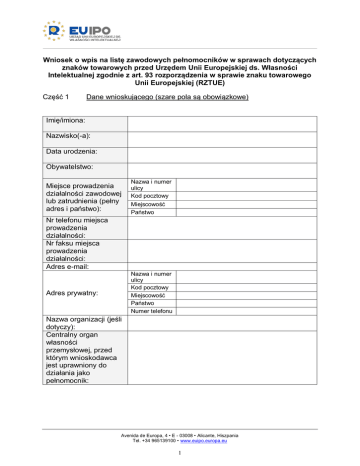 Wniosek o wpis na listę zawodowych pełnomocników w sprawach dotyczących znaków towarowych przed Urzędem Unii Europejskiej ds. Własności Intelektualnej zgodnie z art. 93 rozporządzenia w sprawie znaku towarowego Unii Europejskiej (RZTUE) Część 1 Dane wnioskującego (szare pola są obowiązkowe) Imię/imiona: Nazwisko(-a): Data urodzenia: Obywatelstwo: Miejsce prowadzenia działalności zawodowej lub zatrudnienia (pełny adres i państwo): Nazwa i numer ulicy Kod pocztowy Miejscowość Państwo Nr telefonu miejsca prowadzenia działalności: Nr faksu miejsca prowadzenia działalności: Adres e-mail: Nazwa i numer ulicy Kod pocztowy Miejscowość Państwo Numer telefonu Adres prywatny: Nazwa organizacji (jeśli dotyczy): Centralny organ własności przemysłowej, przed którym wnioskodawca jest uprawniony do działania jako pełnomocnik: Avenida de Europa, 4 • E - 03008 • Alicante, Hiszpania Tel. +34 965139100 • www.euipo.europa.eu 1 Część 2 Zgłoszenie i oświadczenie o spełnieniu warunków Niniejszym zwracam się o wpis na listę zawodowych pełnomocników występujących przed Urzędem Unii Europejskiej ds. Własności Intelektualnej zgodnie z art. 93 RZTUE. Spełniam następujące warunki określone w art. 93 ust. 2 RZTUE (proszę zaznaczyć odpowiednie pole): jestem obywatelem państwa członkowskiego EOG1; prowadzę działalność zawodową lub jestem zatrudniony w EOG; jestem uprawniony do reprezentowania osób fizycznych lub prawnych w sprawach znaków towarowych przed centralnym organem własności przemysłowej EOG. Właściwy krajowy urząd potwierdził spełnienie powyższych wymagań wydając (proszę zaznaczyć odpowiednie pole): załączone świadectwo indywidualne; świadectwo grupowe zgłoszone ………… . Moje uprawnienie do reprezentowania wynika z (proszę zaznaczyć odpowiednie pole): szczególnych kwalifikacji; regularnego działania jako pełnomoocnik przez okres ostatnich pięciu lat2; oficjalnie uznanych kwalifikacji zawodowych zgodnie z przepisami EOG. Część 3 Podpis Data: Podpis: 1 Na podstawie art. 93 ust. 4 lit. b) RZTUE dyrektor wykonawczy Urzędu może udzielić zwolnienia od wymogu posiadania obywatelstwa. W celu uzyskania ww. zwolnienia, w załączeniu należy przedstawić dokument określający podstawy, na których oparty jest wniosek. 2 Na podstawie art. 93 ust. 4 lit. a) RZTUE dyrektor wykonawczy Urzędu może udzielić zwolnienia od wymogu regularnego działania jako pełnomocnik. W celu uzyskania ww. zwolnienia, w załączeniu należy przedstawić dokument określający podstawy, na których oparty jest wniosek. Avenida de Europa, 4 • E - 03008 • Alicante, Hiszpania Tel. +34 965139100 • www.euipo.europa.eu 2 Imię i nazwisko: Avenida de Europa, 4 • E - 03008 • Alicante, Hiszpania Tel. +34 965139100 • www.euipo.europa.eu 3