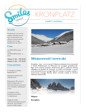KRONPLATZ | NARTY | AUSTRIA | Termin W zależności od terminu , rodzaju zakwaterowania ilości uczestników oraz zakresu proponowanych atrakcji ceny mogą kształtować się różnie. Cena od 330 EURO/osoba - 7 nocy od 290 EURO/osoba - 6 nocy skipass 5 dni - 256 EUR skipass 6 dni - 223 EUR Cena zawiera 5 noclegów w Hotelu Rastblicher*** skipass Kronplatz 4 dni (182,50 Euro) Miejscowość/ teren ski Kronplatz - (935 - 2275 m n.p.m.): Najnowocześniejszy teren narciarski w Tyrolu Południowym we Włoszech (19 wyciągów gondolowych). Jego trzon stanowi potężna, bezdrzewna góra z pokrywą śnieżną zalegającą od grudnia do kwietnia, na której wierzchołek z trzech stron prowadzą liczne wyciągi. Plan de Corones to bardzo szybkie i nowoczesne wyciągi. Bardzo dobre warunki znajdą tu również miłośnicy jednej deski. Wyżywienie HB: poranny bufet śniadaniowy i 4daniowa kolacja serwowana wraz z bufetem sałatkowym, w tym: 1x kolacja z menu Śródziemnomorskim 1x Gala Dinner Wstęp do strefy wellness:wewnętrzny basen, whirpool, sauna fińska i parowa, strefa relaksu Skipass Kronplatz free WIFI Cena nie zawiera Ubezpieczenia Lokalnego podatku płatnego na miejscu 1,5 E/ dzień/osoba Hotel Rastbichler*** Hotel Rastbichler położony jest w w odległości zaledwie 1,2 km od niewielkiej wioski górskiej Chienes. Oferuje on bezpłatny kryty basen oraz pokoje inspirowane zasadami Feng Shui. Na terenie obiektu znajduje się wykwintna restauracja z 2 tarasami oraz zaplecze odnowy biologicznej. We wnętrzach pokoi w hotelu Rastbichler dominuje wyraźny kolor. Każdy pokój dysponuje balkonem z widokiem na dolinę Puster, las lub dziedziniec. W większości pokoi podłogi zostały wyłożone wykładziną, a ściany zdobią oryginalne obrazy. Wyposażenie obejmuje telewizor z płaskim ekranem i dostępem do kanałów satelitarnych. Zapewniono także nowoczesną i barwną łazienkę. Śniadanie podawane jest w formie bufetu. Składa się ono z kiełbasek wiedeńskich, sera, dżemów domowej roboty, a także jogurtu i jajek na twardo. Restauracja oferuje specjalne czterodaniowe menu z deserem. W lokalu czasami odbywają się uroczyste kolacje oraz kolacje obejmujące potrawy typowe dla południowego Tyrolu. W barze serwowane są strudle, kanapki oraz lody. W recepcji Goście mogą zarezerwować sesje w saunie na podczerwień lub skorzystać z oferty bezpłatnych pieszych wycieczek. W obiekcie dostępna jest także bezpłatna sauna fińska oraz stół do ping ponga. Tereny narciarskie Kronplatz oddalone są od hotelu o 25 minut autobusem, a centrum miejscowości Brunico o 10 km.