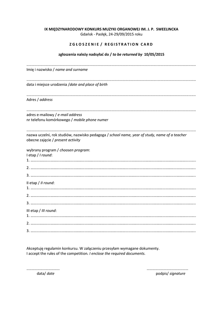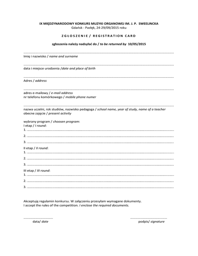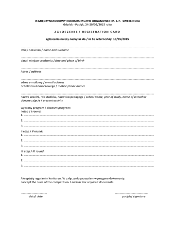 IX MIĘDZYNARODOWY KONKURS MUZYKI ORGANOWEJ IM. J. P. SWEELINCKA Gdańsk - Pasłęk, 24-29/09/2015 roku Z G Ł O S Z E N I E / REGISTRATION CARD zgłoszenia należy nadsyłać do / to be returned by 10/05/2015 ................................................................................................................................................................... Imię i nazwisko / name and surname ................................................................................................................................................................... data i miejsce urodzenia /date and place of birth ................................................................................................................................................................... Adres / address ................................................................................................................................................................... adres e-mailowy / e-mail address nr telefonu komórkowego / mobile phone numer ................................................................................................................................................................... nazwa uczelni, rok studiów, nazwisko pedagoga / school name, year of study, name of a teacher obecne zajęcie / present activity wybrany program / choosen program: I etap / I round: 1. ……………………………………………………………………………....……………………………………………………………………….. 2. ……………………………………………………………………….……………………………………………………………………………….. 3. ……………………………………………………………………………….……………………………………………………………………….. II etap / II round: 1. ……………………………………………………………………………....……………………………………………………………………….. 2. ……………………………………………………………………….……………………………………………………………………………….. 3. ……………………………………………………………………………….……………………………………………………………………….. III etap / III round: 1. ……………………………………………………………………………....……………………………………………………………………….. 2. ……………………………………………………………………….……………………………………………………………………………….. 3. ……………………………………………………………………………….……………………………………………………………………….. Akceptuję regulamin konkursu. W załączeniu przesyłam wymagane dokumenty. I accept the rules of the competition. I enclose the required documents. ................................ data/ date ........................................ podpis/ signature