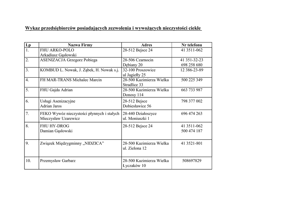 Wykaz przedsiębiorców posiadających zezwolenia i wywożących nieczystości ciekłe Lp 1. 2. Nazwa Firmy FHU ARKO-POLO Arkadiusz Gąsłowski ASENIZACJA Grzegorz Pobiega Adres 28-512 Bejsce 24 Nr telefonu 41 3511-062 28-506 Czarnocin Dębiany 20 KOMBUD L. Nowak, J. Ząbek, H. Nowak s.j. 32-100 Proszowice ul Jagiełły 25 FH MAR-TRANS Michalec Marcin 28-500 Kazimierza Wielka Stradlice 33 FHU Gajda Adrian 28-500 Kazimierza Wielka Donosy 114 Usługi Asenizacyjne 28-512 Bejsce Adrian Jaros Dobiesławice 56 41 351-32-23 698 258 680 12 386-23-89 7. FEKO Wywóz nieczystości płynnych i stałych 28-440 Działoszyce Mieczysław Uzarewicz ul. Moniuszki 1 696 474 263 8. FHU HY-DROG Damian Gąsłowski 28-512 Bejsce 24 41 3511-062 500 474 187 9. Związek Międzygminny „NIDZICA” 28-500 Kazimierza Wielka ul. Zielona 12 41 3521-801 10. Przemysław Garbarz 28-500 Kazimierza Wielka Łyczaków 10 508697829 3. 4. 5. 6. 500 225 349 663 733 987 798 377 002 Wykaz przedsiębiorców wpisanych do rejestru działalności regulowanej Lp Nazwa Przedsiębiorcy Adres Telefon 1. P.P.H.U. „TAMAX” Tadeusz Cieślak 28-340 Sędziszów ul. Dworcowa 46 41 38 11 581 2. „EKOM” Maciejczyk Spółka Jawna Małopolskie Przedsiębiorstwo Gospodarki Odpadami Spółka z o.o. Konrad Zych KAR Stacja Demontażu Pojazdów 25-004 Kielce Ul. Paderewskiego 18 30-307 Kraków Ul. Barska 12 41 386 20 60 3. 4. 28-100 Busko Zdrój Elżbiecin 17 41 383 02 85 41 376 13 24 Nr i data w rejestrze dział.regulowanej 1/2012 15.03.2012 4/2012 13.08.2012 1/2013 14.02.2013 2/2013 16.09.2013 UWAGI