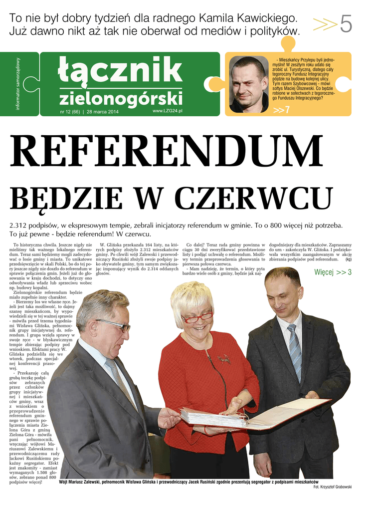 To nie był dobry tydzień dla radnego Kamila Kawickiego. Już dawno nikt aż tak nie oberwał od mediów i polityków. >>5 - Mieszkańcy Przylepu byli jednomyślni! W zeszłym roku udało się zrobić ul. Turystyczną, dlatego cały tegoroczny Fundusz Integracyjny pójdzie na budowę kolejnej ulicy. Tym razem Szybowcowej - mówi sołtys Maciej Olszewski. Co będzie robione w sołectwach z tegorocznego Funduszu Integracyjnego? nr 12 (66) | 28 marca 2014 >>7 REFERENDUM BĘDZIE W CZERWCU 2.312 podpisów, w ekspresowym tempie, zebrali inicjatorzy referendum w gminie. To o 800 więcej niż potrzeba. To już pewne - będzie referendum! W czerwcu. Co dalej? Teraz rada gminy powinna w dogodniejszy dla mieszkańców. Zapraszamy W. Glińska przekazała 164 listy, na któTo historyczna chwila. Jeszcze nigdy nie mieliśmy tak ważnego lokalnego referen- rych podpisy złożyło 2.312 mieszkańców ciągu 30 dni zweryfikować przedstawione do urn - zakończyła W. Glińska. I podziękodum. Teraz sami będziemy mogli zadecydo- gminy. Po chwili wójt Zalewski i przewod- listy i podjąć uchwałę o referendum. Możli- wała wszystkim zaangażowanym w akcję wać o losie gminy i miasta. To unikatowe niczący Rusiński złożyli swoje podpisy ja- wy termin przeprowadzenia głosowania to zbierania podpisów pod referendum. (kg) przedsięwzięcie w skali Polski, bo do tej po- ko obywatele gminy, tym samym zwiększa- pierwsza połowa czerwca. - Mam nadzieję, że termin, o który pyta ry jeszcze nigdy nie doszło do referendum w jąc imponujący wynik do 2.314 oddanych bardzo wiele osób z gminy, będzie jak najsprawie połączenia gmin. Jeżeli już do gło- głosów. sowania w kraju dochodzi, to dotyczy ono odwoływania władz lub sprzeciwu wobec np. budowy kopalni. Zielonogórskie referendum będzie miało zupełnie inny charakter. - Bierzemy los we własne ręce. Jeżeli jest taka możliwość, to dajmy szansę mieszkańcom, by wypowiedzieli się w tej ważnej sprawie - mówiła przed trzema tygodniami Wisława Glińska, pełnomocnik grupy inicjatywnej ds. referendum. I grupa wzięła sprawy w swoje ręce - w błyskawicznym tempie zbierając podpisy pod wnioskiem. Efektami pracy W. Glińska podzieliła się we wtorek, podczas specjalnej konferencji prasowej. - Przekazuję całą grubą teczkę podpisów zebranych przez członków grupy inicjatywnej i mieszkańców gminy, wraz z wnioskiem o przeprowadzenie referendum gminnego w sprawie połączenia miasta Zielona Góra z gminą Zielona Góra - mówiła pani pełnomocnik, wręczając wójtowi Mariuszowi Zalewskiemu i przewodniczącemu rady Jackowi Rusińskiemu pokaźny segregator. Efekt jest znakomity - zamiast wymaganych 1.508 głosów, zebrano ponad 800 podpisów więcej! Wójt Mariusz Zalewski, pełnomocnik Wisława Glińska i przewodniczący Jacek Rusiński zgodnie prezentują segregator z podpisami mieszkańców Więcej >> 3 Fot. Krzysztof Grabowski 2 łącznik zielonogórski | 28 marca 2014 W ZIELONEJ GÓRZE www.Lzg24.pl Pociąg „Harry” zatrzymał się u nas w drodze do Żagania. Zmierzał na 70. rocznicę Wielkiej Ucieczki z hitlerowskiego stalagu Luft III. O 9.30, w poniedziałek, „Harry” wjechał na pierwszy peron dworca w Zielonej Górze. Zabytkowy pociąg kilka godzin wcześniej odjechał z Poznania Głównego. Jeszcze w drodze do Żagania, w Zbąszyniu, dołączono do niego parowóz i wagony retro. Z tych ostatnich, już na zielonogórskim dworcu, wyszli pasażerowie, kombatanci i pasjonaci wojennej historii. Widzowie, którzy przybyli na dworzec, przez chwilę poczuli się jak w „epoce”. - Nasi koledzy, którzy organizują inscenizację w Żaganiu zapytali, czy przyjechalibyśmy na 70. rocznicę Wielkiej Ucieczki. Włożyliśmy więc mundury lotników amerykańskich, by jeszcze ubarwić całą sprawę i nadać jej większej rangi mówi Przemysław Maćkowiak z Towarzystwa Miłośników Miasta Lubonia. - A dla dzieci, które nam towarzyszą, to także spora atrakcja i lekcja historii. „Harry” to jeden z trzech pociągów, które zmierzały do Żagania (pojechały także „Tom” i „Dick”). Główne obchody 70. rocznicy „Wielkiej Ucieczki” odbyły się we wtorek. W programie był także przemarsz grupy oficerów RAF-u z Żagania do Poznania, na cmentarz wojskowy na poznańskiej Cytadeli. Marsz miał być hołdem dla 50 lotników, uczestników ucieczki, rozstrzelanych przez gestapo, a pochowanych na Cytadeli. W ZIELONEJ GÓRZE W ZIELONEJ GÓRZE Maszerujemy! Ciach prapremierowo MOSiR zaprasza w sobotę, 29 marca, na nordic walking. Zbiórka na parkingu przy amfiteatrze o 10.00. Maszerujemy pod opieką instruktora, trzeba mieć swoje kijki. Czas zajęć ok. 1,5 godziny, długość trasy ok. 5 km. Informacje na www.mosir.zgora.pl. (dsp) W niedzielę, 30 marca, o 18.00 w Hydro(za)gadce urodzinowa porcja nowych skeczy w wykonaniu jubilata (to już 20 lat!) - kabaretu Ciach. Program jeszcze ciepły. Nie widzieliście tego ani w telewizji, ani w internecie. Bilety po 25 zł w systemie abilet.pl. (dsp) Bez połączenia uschniemy niczym trawa na pustyni W RACULI W ZIELONEJ GÓRZE Panie grają Wykład o marketingu W sobotę, 29 marca, o 15.00, na orliku, odbędzie się turniej siatkówki czteroosobowych zespołów żeńskich (bez ograniczeń wiekowych). Jak czytamy na stronie www.racula.pl, zgłoszenia do 28 marca, u animatorów: Wiesława i Łukasza. Informacje, tel. 660 435 327. (dsp) W środę, 2 kwietnia, kolejny z cyklu wykładów otwartych dla studentów i uczniów szkół ponadgimnazjalnych. W auli UZ przy ul. Podgórnej 50, dr Janusz Śnihur, specjalista od PR i marketingu, opowie o zabiegach marketingowych. Cykl przygotowuje Parlament Studencki UZ. (dsp) Pociąg retro z lotnikami P I Ó R K I E M C E P E R A >>>>> (kg) Na zdjęciu Monika Warchalewska-Krol i jej synek Aleksander oraz Przemysław Maćkowiak. Dorośli należą do Towarzystwa Miłośników Miasta Lubonia. Fot. Krzysztof Grabowski - Stawką w grze nie jest tyl