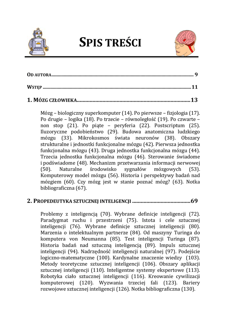 SPIS TREŚCI OD AUTORA ................................................................................................................... 9 WSTĘP ........................................................................................................................ 11 1. MÓZG CZŁOWIEKA................................................................................ 13 Mózg – biologiczny superkomputer (14). Po pierwsze – fizjologia (17). Po drugie – logika (18). Po trzecie – równoległość (19). Po czwarte – non stop (21). Po piąte – peryferia (22). Postscriptum (25). Iluzoryczne podobieństwo (29). Budowa anatomiczna ludzkiego mózgu (33). Mikrokosmos świata neuronów (38). Obszary strukturalne i jednostki funkcjonalne mózgu (42). Pierwsza jednostka funkcjonalna mózgu (43). Druga jednostka funkcjonalna mózgu (44). Trzecia jednostka funkcjonalna mózgu (46). Sterowanie świadome i podświadome (48). Mechanizm przetwarzania informacji nerwowej (50). Naturalne środowisko sygnałów mózgowych (53). Komputerowy model mózgu (56). Historia i perspektywy badań nad mózgiem (60). Czy mózg jest w stanie poznać mózg? (63). Notka bibliograficzna (67). 2. PROPEDEUTYKA SZTUCZNEJ INTELIGENCJI ......................................... 69 Problemy z inteligencją (70). Wybrane definicje inteligencji (72). Paradygmat ruchu i przestrzeni (75). Istota i cele sztucznej inteligencji (76). Wybrane definicje sztucznej inteligencji (80). Marzenia o intelektualnym partnerze (84). Od maszyny Turinga do komputera von Neumanna (85). Test inteligencji Turinga (87). Historia badań nad sztuczną inteligencją (89). Impuls sztucznej inteligencji (94). Nadrzędność inteligencji naturalnej (97). Podejście logiczno-matematyczne (100). Kardynalne znaczenie wiedzy (103). Metody teoretyczne sztucznej inteligencji (106). Obszary aplikacji sztucznej inteligencji (110). Inteligentne systemy ekspertowe (113). Robotyka ciało sztucznej inteligencji (116). Kreowanie cywilizacji komputerowej (120). Wyzwania trzeciej fali (123). Bariery rozwojowe sztucznej inteligencji (126). Notka bibliograficzna (130). 6 Spis treści 3. SZTUCZNE SIECI NEURONOWE........................................................... 133 Geneza i początki sztucznych sieci neuronowych (134). Idea sztucznych sieci neuronowych (138). Schemat przetwarzania informacji (143). Modelowy mechanizm działania neuronu (147). Klasyczne rodzaje sztucznych sieci neuronowych (150). Wyniki pracy sztucznych sieci neuronowych (153). Atrybuty użytkowe sztucznych sieci neuronowych (156). Przykładowe obszary aplikacji sieci neuronowych (159). Sztuczne sieci komórkowe (162). Komiwojażer – pogromca sieci (165). Meandry sztucznych sieci neuronowych (168). Notka bibliograficzna (172). 4. ALGORYTMY GENETYCZNE ................................................................ 175 Tajemnica powstania życia (176). Zarys teorii ewolucji Darwina (178). Mechanizm dziedziczenia i początki genetyki (182). Geneza i terminologia algorytmów genetycznych (186). Podstawy metodologiczne algorytmów genetycznych (191). Iteracyjna natura algorytmów genetycznych (193). Reprezentacja informacji problemowej w genotypie (196). Kodowanie wartości zmiennych decyzyjnych (198). Przykład obrazu genotypu gatunkowego (200). Standardowy algorytm genetyczny (202). Losowanie populacji (205). Ocena osobników (206). Selekcja i eliminacja osobników (207). Krzyżowanie osobników (209). Mutacja osobników (212). Zakończenie pętli ewolucyjnej (214). Suboptymalizacja domeną algorytmów genetycznych (215). Topologia metod ewolucyjnych (217). Komiwojażer – rycerz niepokonany (220). Kierunki wykorzystania algorytmów genetycznych (223). Notka bibliograficzna (227). 5. LOGIKA I ZBIORY ROZMYTE .............................................................. 229 Dwa tysiące lat logiki (230). Logika i algebra Boole’a (235). Przesłanki powstania logiki rozmytej (237). Założenia metodologiczne logiki rozmytej (242). Podstawy teorii zbiorów rozmytych (245). Zbiory klasyczne i rozmyte (247). Zmienne i wartości lingwistyczne (251). Wnioskowanie według zasad logiki rozmytej (256). Techniczne kierunki aplikacji logiki rozmytej (258). Rozmyte aplikacje komputerowe (261). Teoria zbiorów rozmytych a rachunek prawdopodobieństwa (265). Cała nadzieja w logice Fuzzy (267). Notka bibliograficzna (271). Sztuczna inteligencja. Nie tylko dla humanistów 7 6. SYSTEMY EKSPERTOWE .................................................................... 273 Idea systemów ekspertowych (274). Definicje systemu ekspertowego (276). Zasadnicze cechy systemu ekspertowego (281). Przykłady systemów ekspertowych (284). Struktura systemów ekspertowych (290). Pozyskiwanie i transformacja wiedzy eksperckiej (293). Organizacja i reprezentacja wiedzy (298). Sieci semantyczne (301). Trójki, reguły i ramy (303). Logika formalna (305). Dualizm procedur wnioskowania (306). Mechanizm wnioskowania (307). Wnioskowanie do przodu i do tyłu (309). Interfejs użytkownika (312). Moduł objaśniający (314). Narzędzia budowania systemów ekspertowych (316). Powłoki szkieletowe systemów ekspertowych (317). Baza wiedzy jako produkt Know-How (319). Inżynieria wiedzy w systemach ekspertowych (321). Projektowanie systemów ekspertowych (322). Problemy rozwojowe systemów ekspertowych (324). Japoński program maszyny eksperckiej (327). Amerykański projekt systemu ekspertowego CYC (330). Notka bibliograficzna (333). 7. ROBOTY I ROBOTYKA ........................................................................ 335 Golemy, cyborgi i roboty (336). Robot R.U.R. Karela Ćapka (339). Odwieczne tęsknoty za pomocnikiem (341). Arcydzieła sztuki zegarmistrzowskiej (342). Mechaniczne konstrukcje inżynierskie (343). Etyka i prawa robotów (344). Pojęcie robota i robotyki (346). Etapy rozwoju robotyki (350). Systemy klasyfikacyjne robotów (353). Przykładowe obszary aplikacji robotów (357). Homo ASIMO (362). Roboty przemys
