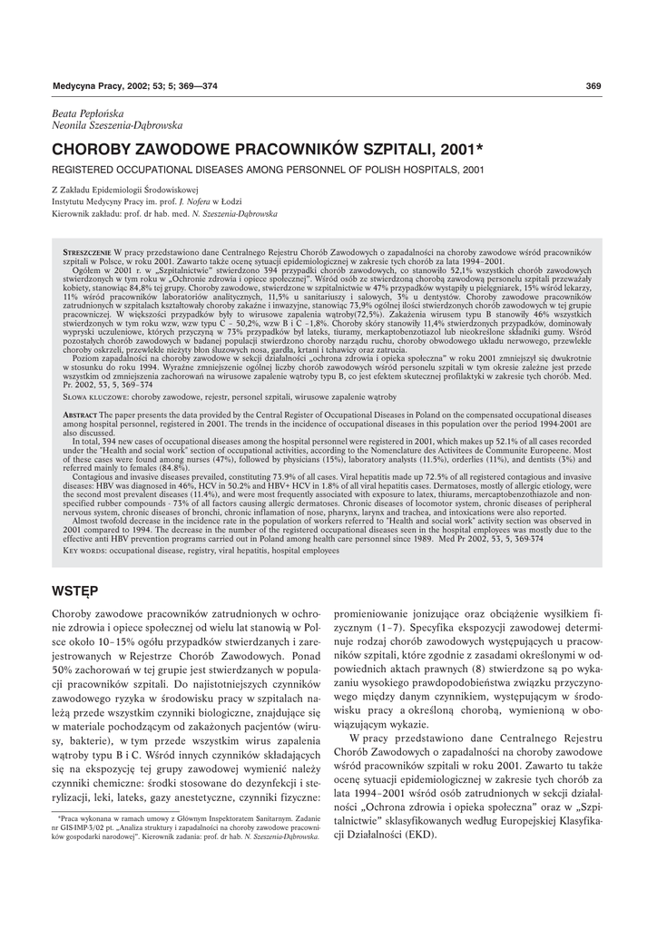 Medycyna Pracy, 2002; 53; 5; 369—374 369 Beata Pepłońska Neonila Szeszenia-Dąbrowska CHOROBY ZAWODOWE PRACOWNIKÓW SZPITALI, 2001* REGISTERED OCCUPATIONAL DISEASES AMONG PERSONNEL OF POLISH HOSPITALS, 2001 Z Zakładu Epidemiologii Środowiskowej Instytutu Medycyny Pracy im. prof. J. Nofera w Łodzi Kierownik zakładu: prof. dr hab. med. N. Szeszenia-Dąbrowska STRESZCZENIE W pracy przedstawiono dane Centralnego Rejestru Chorób Zawodowych o zapadalności na choroby zawodowe wśród pracowników szpitali w Polsce, w roku 2001. Zawarto także ocenę sytuacji epidemiologicznej w zakresie tych chorób za lata 1994–2001. Ogółem w 2001 r. w „Szpitalnictwie” stwierdzono 394 przypadki chorób zawodowych, co stanowiło 52,1% wszystkich chorób zawodowych stwierdzonych w tym roku w „Ochronie zdrowia i opiece społecznej”. Wśród osób ze stwierdzoną chorobą zawodową personelu szpitali przeważały kobiety, stanowiąc 84,8% tej grupy. Choroby zawodowe, stwierdzone w szpitalnictwie w 47% przypadków wystąpiły u pielęgniarek, 15% wśród lekarzy, 11% wśród pracowników laboratoriów analitycznych, 11,5% u sanitariuszy i salowych, 3% u dentystów. Choroby zawodowe pracowników zatrudnionych w szpitalach kształtowały choroby zakaźne i inwazyjne, stanowiąc 73,9% ogólnej ilości stwierdzonych chorób zawodowych w tej grupie pracowniczej. W większości przypadków były to wirusowe zapalenia wątroby(72,5%). Zakażenia wirusem typu B stanowiły 46% wszystkich stwierdzonych w tym roku wzw, wzw typu C – 50,2%, wzw B i C –1,8%. Choroby skóry stanowiły 11,4% stwierdzonych przypadków, dominowały wypryski uczuleniowe, których przyczyną w 73% przypadków był lateks, tiuramy, merkaptobenzotiazol lub nieokreślone składniki gumy. Wśród pozostałych chorób zawodowych w badanej populacji stwierdzono choroby narządu ruchu, choroby obwodowego układu nerwowego, przewlekłe choroby oskrzeli, przewlekłe nieżyty błon śluzowych nosa, gardła, krtani i tchawicy oraz zatrucia. Poziom zapadalności na choroby zawodowe w sekcji działalności „ochrona zdrowia i opieka społeczna” w roku 2001 zmniejszył się dwukrotnie w stosunku do roku 1994. Wyraźne zmniejszenie ogólnej liczby chorób zawodowych wśród personelu szpitali w tym okresie zależne jest przede wszystkim od zmniejszenia zachorowań na wirusowe zapalenie wątroby typu B, co jest efektem skutecznej profilaktyki w zakresie tych chorób. Med. Pr. 2002, 53, 5, 369–374 Słowa kluczowe: choroby zawodowe, rejestr, personel szpitali, wirusowe zapalenie wątroby ABSTRACT The paper presents the data provided by the Central Register of Occupational Diseases in Poland on the compensated occupational diseases among hospital personnel, registered in 2001. The trends in the incidence of occupational diseases in this population over the period 1994-2001 are also discussed. In total, 394 new cases of occupational diseases among the hospital personnel were registered in 2001, which makes up 52.1% of all cases recorded under the "Health and social work" section of occupational activities, according to the Nomenclature des Activitees de Communite Europeene. Most of these cases were found among nurses (47%), followed by physicians (15%), laboratory analysts (11.5%), orderlies (11%), and dentists (3%) and referred mainly to females (84.8%). Contagious and invasive diseases prevailed, constituting 73.9% of all cases. Viral hepatitis made up 72.5% of all registered contagious and invasive diseases: HBV was diagnosed in 46%, HCV in 50.2% and HBV+ HCV in 1.8% of all viral hepatitis cases. Dermatoses, mostly of allergic etiology, were the second most prevalent diseases (11.4%), and were most frequently associated with exposure to latex, thiurams, mercaptobenzothiazole and nonspecified rubber compounds - 73% of all factors causing allergic dermatoses. Chronic diseases of locomotor system, chronic diseases of peripheral nervous system, chronic diseases of bronchi, chronic inflamation of nose, pharynx, larynx and trachea, and intoxications were also reported. Almost twofold decrease in the incidence rate in the population of workers referred to "Health and social work" activity section was observed in 2001 compared to 1994. The decrease in the number of the registered occupational diseases seen in the hospital employees was mostly due to the effective anti HBV prevention programs carried out in Poland among health care personnel since 1989. Med Pr 2002, 53, 5, 369-374 Key words: occupational disease, registry, viral hepatitis, hospital employees WSTÊP Choroby zawodowe pracowników zatrudnionych w ochronie zdrowia i opiece społecznej od wielu lat stanowią w Polsce około 10–15% ogółu przypadków stwierdzanych i zarejestrowanych w Rejestrze Chorób Zawodowych. Ponad 50% zachorowań w tej grupie jest stwierdzanych w populacji pracowników szpitali. Do najistotniejszych czynników zawodowego ryzyka w środowisku pracy w szpitalach należą przede wszystkim czynniki biologiczne, znajdujące się w materiale pochodzącym od zakażonych pacjentów (wirusy, bakterie), w tym przede wszystkim wirus zapalenia wątroby typu B i C. Wśród innych czynników składających się na ekspozycję tej grupy zawodowej wymienić należy czynniki chemiczne: środki stosowane do dezynfekcji i sterylizacji, leki, lateks, gazy anestetyczne, czynniki fizyczne: *Praca wykonana w ramach umowy z Głównym Inspektoratem Sanitarnym. Zadanie nr GIS-IMP-3/02 pt. „Analiza struktury i zapadalności na choroby zawodowe pracowników gospodarki narodowej”. Kierownik zadania: prof. dr hab. N. Szeszenia-Dąbrowska. promieniowanie jonizujące oraz obciążenie wysiłkiem fizycznym (1–7). Specyfika ekspozycji zawodowej determinuje rodzaj chorób zawodowych występujących u pracowników szpitali, które zgodnie z zasadami określonymi w odpowiednich aktach prawnych (8) stwierdzone są po wykazaniu wysokiego prawdopodobieństwa związku przyczynowego między dany
