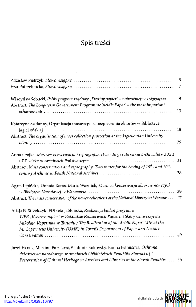 Spis tresci Zdzislaw Pietrzyk, Slowo wstppne 5 Ewa Potrzebnicka, Slowo wstgpne 7 Wladyslaw Sobucki, Polski program rzqdowy „Kwasny papier" - najwazniejsze osiqgnifcia . . . 9 Abstract: The Long-term Government Programme 'Acidic Paper' - the most important achievements 13 Katarzyna Szklanny, Organizacja masowego zabezpieczania zbiorow w Bibliotece Jagielloriskiej Abstract: The organisation o f mass collection protection a t the Jagiellonian University Library 15 29 A n n a Czajka, Masowa konserwacja i reprografia. Dwie drogi ratowania archiwaliow z X I X i X X wieku w Archiwach Panstwowych 31 Abstract, Mass conservation and reprography: Two routes f o r the Saving o f 19th- and 20 th century Archives in Polish National Archives 38 Agata Lipiriska, Donata Rams, Maria Wozniak, Masowa konserwacja zbiorow nowszych w Bibliotece Narodowej w Warszawie Abstract: The mass conservation o f the newer collections at the National Library in Warsaw . . . 39 47 Alicja B. Strzelczyk, Elzbieta Jabtoriska, Realizacja badan programu W P R „Kwasny papier" w Zakladzie Konserwacji Papieru i Skory Uniwersytetu Mikolaja Kopernika w Toruniu / The Realization o f the Acidic Paper' LGP at the M. Copernicus University (UMK) in Torun's Department o f Paper and Leather Conservation 49 Jozef Hanus, Martina Bajzikova,Vladimir Bukovsky, Emilia Hanusova, Ochrona dziedzictwa narodowego w archiwach i bibliotekach Republiki Slowackie) / Preservation o f Cultural Heritage in Archives and Libraries in the Slovak Republic . http://d-nb.info/1029610797 55 318 „ P R Z E S Z t O S C DLA PRZYSZLOSCI" Gerrit d e Bruin, Narddowe programy ochrony zbiorow w Holandii / National Preservation Programs in the Netherlands 75 Svetlana A. Dobrusina, Nadezhda A. Lobanova, Natalija S. Vovk, Ochrona zasobow ksiqzek w Rosji. Podejscia i odpowiedzi na problem / Preservation o f Book Stocks in Russia: Approaches and Answers to the Problem 81 Jana Kolar, Matija Strlic, Projekty PaperTreat oraz SurveNIR: nauka dla ochrony dziedzictwa pismienniczego / PaperTreat and SurveNIR Projects: Science f o r Preservation o f Our Written Heritage 97 Thierry Aubry, Nathalie Buisson, Brigitte Leclerc, Alain Lefebvre, Masowe odkwaszanie w Bibliotece Narodowej Francji. Spojrzenie historyczne oraz obecna praktyka / Mass deacidification at the BnF. Historical review a n d current practice 99 Tomasz tojewski, Trwalosc odkwaszonego papieru w zanieczyszczonym srodowisku 117 Abstract: The Durability o f Deacidifed Paper in a Polluted Environment 126 Andrzej Baranski, James Burd, Janusz Marek Lagan, Tomasz tojewski, Tomasz Zacharski, Bilans masy tlenku magnezu w instalacji Bookkeeper III do odkwaszania drukow / Mass Balance o f Magnesium Oxide in the Bookkeeper III Installation f o r Deacidification o f Prints 127 Agnes Bliiher, 300 ton i nie widac kohca? Masowe odkwaszanie w Szwajcarskiej Bibliotece Narodowej i w Szwajcarii / 300 Tons a n d N o End in Sight? Mass Deacidification at the Swiss National Library a n d in Switzerland 133 Michael Ramin, Jasmin Ossola, Markus Reist, Badanie rdzenia papieru / Insight into the core o f paper 149 Michal Durovic, Bohuslava Havlinova, Hana Paulusova, R o m a n Straka, Masowe odkwaszanie w Archiwach. Porownanie metod Bookkeeper i CSC Book Saver / Mass Deacidification in Archives. Comparison o f the Bookkeeper and CSC Book Saver Methods 151 Andrzej Baranski, O wspolpracy humanistow i przyrodnikow w zakresie ochrony dziedzictwa kultury / On the Cooperation o f Humanists a n d Naturalists in the Area o f Preserving Cultural Inheritance 177 Tomasz Kozielec, Przed, w czasie i p o odkwaszaniu. Co dalej? Kilka uwag na temat wlasciwosci odkwaszonych materialow archiwalnych i bibliotecznych na wybranych przykladach 179 SPIS T R E S C I 319 Abstract: The Process o f Deacidification - Before, During and After. W h a t Comes Next? A Few Remarks on The Properties o f Deacidified Archival and Library Materials Based on the Selected Examples 194 Jolanta Czuczko, Mafgorzata Pronobis-Gajdzis, XlX-wieczne oprawy ksiqzek w swietle zagadnien konserwatorskich i masowego odkwaszania Abstract: The Nineteenth-Century Book as a Work o f A r t o f the Artistic Crafts 197 202 Halina Rosa, Zniszczenia skorzanych opraw zabytkowego zbioru ksiqzek Biblioteki Klasztoru Franciszkanow w Glubczycach w porownaniu ze zniszczeniami opraw ksiqzek z X I X i poczqtku X X wieku / The Damage to the Leather Covers o f the Antique Book Collection at the Franciscan Monastery Library in Glubczyce When Compared to the Damage to Book Covers f r o m the Nineteenth and Beginning o f the Twentieth Century 205 Deborah Maxwell, Masowe odkwaszanie w Bibliotece i Archiwach Kanady. Dzialalnosc wlasna i uslugi zewn^trzne - porownanie / Mass Deacidification at Library a n d Archives Canada. Comparing Internal and External Approaches 207 A n n a Czajka, Konserwacja masowa w archiwach i bibliotekach - roznice i podobienstwa. Uwagi na zakonczenie WPR „Kwasny papier" 221 Abstract: Mass Conservation in Libraries and Archives - Similarities and Differences. Some Closing Remarks at the End o f the Acidic Paper' Program 228 A n n a Alena Endrefi, Masowe odkwaszanie zbiorow Glownego Archiwum Panstwowego Nadrenii Polnocnej-Westfalii w Niemczech / Experiences with Mass Deacidification in the Landesarchiv Nordrhein-Westfalen, Germany 229 Danuta Jarminska, Wladyslaw Sobucki, Donata Rams, Zakwaszenie ksiqzek z X I X i X X wieku w polskich bibliotekach Abstract: The Acidification o f 19th- and 20 th -Century Books in Polish Libraries 239 247 Marzenna Ciechariska, Konserwacja zbiorow XIX- i XX-wiecznych - specyficzne aspekty 243 Abstract: The Preservation o f 19 th -and 20 th -Century Collections - Specific Aspects 255 Alicja B. Strzelczyk, Joanna Karbowska-Berent, Rafal Gorny, Dorota Jarosinska, Krzysztof Zykubek, Zagrozenia biologiczne zbiorow bibliotecznych i zdrowia pracownikow na podstawie badan przeprowadzonych w ramach grantu „Kwasny papier" / The Biological Threats to Library Collections an