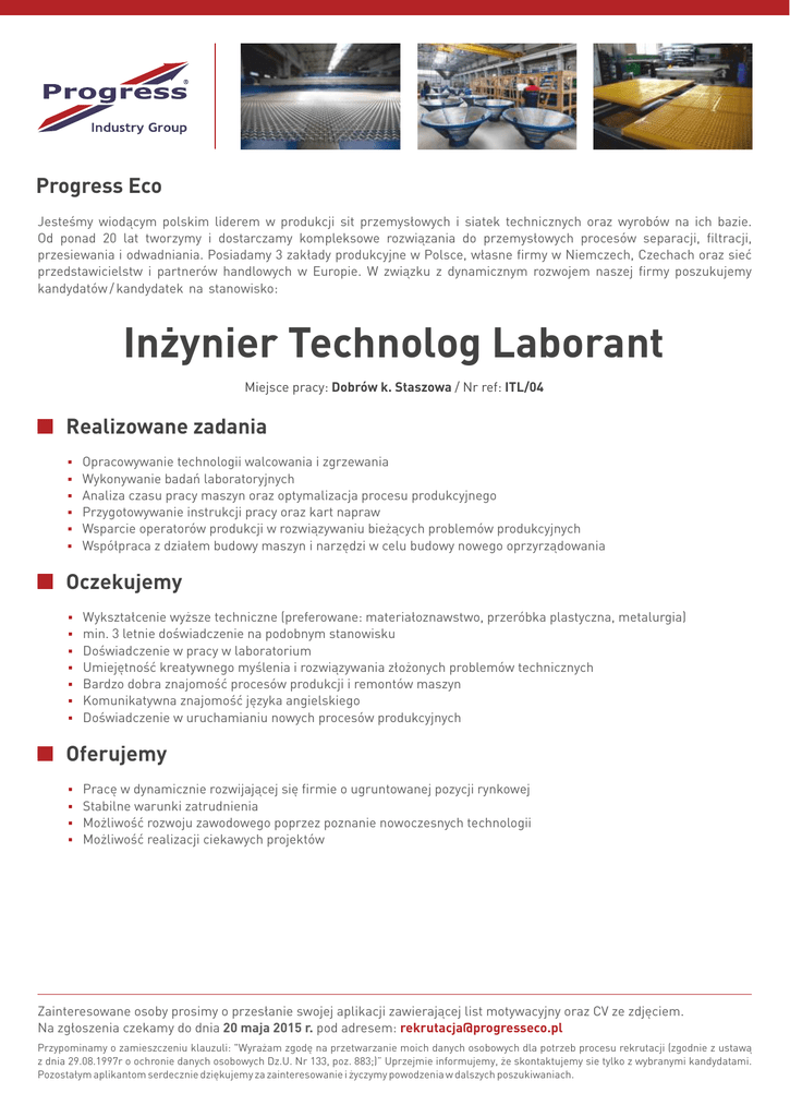 Progress Eco Jesteśmy wiodącym polskim liderem w produkcji sit przemysłowych i siatek technicznych oraz wyrobów na ich bazie. Od ponad 20 lat tworzymy i dostarczamy kompleksowe rozwiązania do przemysłowych procesów separacji, filtracji, przesiewania i odwadniania. Posiadamy 3 zakłady produkcyjne w Polsce, własne firmy w Niemczech, Czechach oraz sieć przedstawicielstw i partnerów handlowych w Europie. W związku z dynamicznym rozwojem naszej firmy poszukujemy kandydatów / kandydatek na stanowisko: Inżynier Technolog Laborant Miejsce pracy: Dobrów k. Staszowa / Nr ref: ITL/04 Realizowane zadania Opracowywanie technologii walcowania i zgrzewania Wykonywanie badań laboratoryjnych Analiza czasu pracy maszyn oraz optymalizacja procesu produkcyjnego Przygotowywanie instrukcji pracy oraz kart napraw Wsparcie operatorów produkcji w rozwiązywaniu bieżących problemów produkcyjnych Współpraca z działem budowy maszyn i narzędzi w celu budowy nowego oprzyrządowania Oczekujemy Wykształcenie wyższe techniczne (preferowane: materiałoznawstwo, przeróbka plastyczna, metalurgia) min. 3 letnie doświadczenie na podobnym stanowisku Doświadczenie w pracy w laboratorium Umiejętność kreatywnego myślenia i rozwiązywania złożonych problemów technicznych Bardzo dobra znajomość procesów produkcji i remontów maszyn Komunikatywna znajomość języka angielskiego Doświadczenie w uruchamianiu nowych procesów produkcyjnych Oferujemy Pracę w dynamicznie rozwijającej się firmie o ugruntowanej pozycji rynkowej Stabilne warunki zatrudnienia Możliwość rozwoju zawodowego poprzez poznanie nowoczesnych technologii Możliwość realizacji ciekawych projektów Zainteresowane osoby prosimy o przesłanie swojej aplikacji zawierającej list motywacyjny oraz CV ze zdjęciem. Na zgłoszenia czekamy do dnia 20 maja 2015 r. pod adresem: [email protected] Przypominamy o zamieszczeniu klauzuli: "Wyrażam zgodę na przetwarzanie moich danych osobowych dla potrzeb procesu rekrutacji (zgodnie z ustawą z dnia 29.08.1997r o ochronie danych osobowych Dz.U. Nr 133, poz. 883;)” Uprzejmie informujemy, że skontaktujemy sie tylko z wybranymi kandydatami. Pozostałym aplikantom serdecznie dziękujemy za zainteresowanie i życzymy powodzenia w dalszych poszukiwaniach.