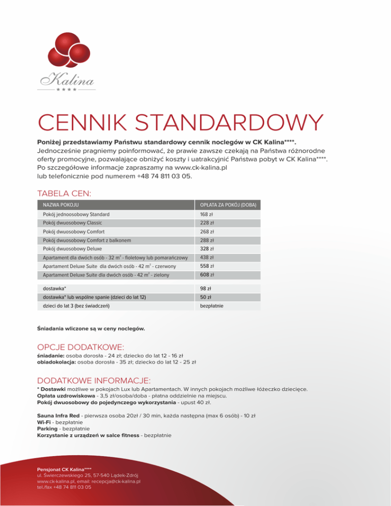 CENNIK STANDARDOWY Poniżej przedstawiamy Państwu standardowy cennik noclegów w CK Kalina****. Jednocześnie pragniemy poinformować, że prawie zawsze czekają na Państwa różnorodne oferty promocyjne, pozwalające obniżyć koszty i uatrakcyjnić Państwa pobyt w CK Kalina****. Po szczegółowe informacje zapraszamy na www.ck-kalina.pl lub telefonicznie pod numerem +48 74 811 03 05. TABELA CEN: NAZWA POKOJU OPŁATA ZA POKÓJ (DOBA) Pokój jednoosobowy Standard 168 zł Pokój dwuosobowy Classic 228 zł Pokój dwuosobowy Comfort 268 zł Pokój dwuosobowy Comfort z balkonem 288 zł Pokój dwuosobowy Deluxe 328 zł Apartament dla dwóch osób - 32 m2 - fioletowy lub pomarańczowy 2 Apartament Deluxe Suite dla dwóch osób - 42 m - czerwony 2 438 zł 558 zł Apartament Deluxe Suite dla dwóch osób - 42 m - zielony 608 zł dostawka* 98 zł dostawka* lub wspólne spanie (dzieci do lat 12) 50 zł dzieci do lat 3 (bez świadczeń) bezpłatnie Śniadania wliczone są w ceny noclegów. OPCJE DODATKOWE: śniadanie: osoba dorosła - 24 zł; dziecko do lat 12 - 16 zł obiadokolacja: osoba dorosła - 35 zł; dziecko do lat 12 - 25 zł DODATKOWE INFORMACJE: * Dostawki możliwe w pokojach Lux lub Apartamentach. W innych pokojach możliwe łóżeczko dziecięce. Opłata uzdrowiskowa - 3,5 zł/osoba/doba - płatna oddzielnie na miejscu. Pokój dwuosobowy do pojedynczego wykorzystania - upust 40 zł. Sauna Infra Red - pierwsza osoba 20zł / 30 min, każda następna (max 6 osób) - 10 zł Wi-Fi - bezpłatnie Parking - bezpłatnie Korzystanie z urządzeń w salce fitness - bezpłatnie Pensjonat CK Kalina**** ul. Świerczewskiego 25, 57-540 Lądek-Zdrój www.ck-kalina.pl, email: [email protected] tel./fax +48 74 811 03 05