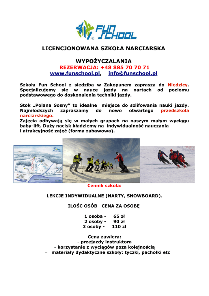LICENCJONOWANA SZKOŁA NARCIARSKA WYPOŻYCZALANIA REZERWACJA: +48 885 70 70 71 www.funschool.pl, [email protected] Szkoła Fun School z siedzibą w Zakopanem zaprasza do Niedzicy. Specjalizujemy się w nauce jazdy na nartach od poziomu podstawowego do doskonalenia techniki jazdy. Stok „Polana Sosny” to idealne miejsce do szlifowania nauki jazdy. Najmłodszych zapraszamy do nowo otwartego przedszkola narciarskiego. Zajęcia odbywają się w małych grupach na naszym małym wyciągu baby-lift. Duży nacisk kładziemy na indywidualność nauczania i atrakcyjność zajęć (forma zabawowa). Cennik szkoła: LEKCJE INDYWIDUALNE (NARTY, SNOWBOARD). ILOŚC OSÓB CENA ZA OSOBĘ 1 osoba 2 osoby 3 osoby - – 65 zł 90 zł 110 zł Cena zawiera: - przejazdy instruktora - korzystanie z wyciągów poza kolejnością materiały dydaktyczne szkoły: tyczki, pachołki etc Oszczędzaj w pakietach (1 osoba): Ilość godzin Cena Cena za 1 h w pakiecie 5h 300,00 zł 60,00 zł 7h 385,00 zł 55,00 zł 10 h 500,00 zł 50,00 zł Zajęcia pakietowe płatne z góry, do wykorzystania w dowolnym terminie po wcześniejszej rezerwacji telefonicznej +48 885 70 70 71. CENNIK WYPOŻYCZALNIA Rodzaj usługi Komplet nart Carving Narty Carving Buty Kijki Snowboard komplet Snowboard Kask 2h Następna godzina Doba 22,00 zł 5,00 zł 45,00 zł 15,00 zł 13,00 zł 6,00 zł 4,00 zł 3,00 zł 2,00 zł 30,00 zł 20,00 zł 10,00 zł 25,00 zł 5,00 zł 50,00 zł 15,00 zł 6,00 zł 4,00 zł 3,00 zł 35,00 zł 15,00 zł 5 DNIOWE KURSY FERYJNE DLA DZIECI Jeśli chcą Państwo by dzieci bawiły się na nartach wraz z rówieśnikami to najlepsza propozycja. Zajęcia odbywają się na naszym baby-lifcie, następnie na 2 wyciągach. Na terenie przedszkola znajdują się niezbędne figurki i zabawki do przeprowadzania zajęć. Na koniec kursu każde z dzieci staruje w zawodach, kibicowanie rodziców niezbędne ;-) Dla wszystkich uczestników przygotowaliśmy nagrody oraz dyplomy. Zapisz swoją pociechę już dziś ! Zajęcia rozpoczynają się w poniedziałek, kończą w piątek. Zapraszamy w poniższych terminach : TERMIN I: 14 styczeń (poniedziałek) - 18 styczeń 2013 r. (piątek) TERMIN II: 21 styczeń (poniedziałek) - 25 styczeń 2013 r. (piątek) TERMIN III: 28 styczeń (poniedziałek) - 1 luty 2013 r. (piątek) TERMIN IV: 4 luty (poniedziałek) - 8 luty 2013 r. (piątek) TERMIN V: 11 luty (poniedziałek) - 15 luty 2013 r. (piątek) TERMIN VI: 18 luty (poniedziałek) - 22 luty 2013 r. (piątek) Grupa poranna rozpoczyna zajęcia o 10:30- 12:30 Grupa popołudniowa rozpoczyna zajęcia o 13:30 – 15:30 Kurs 5 dniowy obejmuje 10 h szkolenia (2 godziny dzienne) w max. 5 osobowych grupach Cena: 350 zł – 5 dniowy kurs (10 godzin szkolenia) 600 zł - 10 dniowy kursy (dwa tygodnie ferii, 20 godzin szkolenia). Zapisz rodzeństwo/dzieci znajomych: 2 dzieci – 10 %, 3 dzieci – 15 % ZAPISY: Telefonicznie, osobiście lub mailowo. Prosimy o podanie: 1 – imienia i nazwiska dziecka 2 – tel. kontaktowego 3- poziomu zaawansowania 4- terminu kursu + nazwy stoku: NIEDZICA i wysłanie maila na adres [email protected] Do zakwalifikowania na kurs niezbędna wpłata za kurs w wysokości 100 zł na poniższe konto: ING Bank Śląski o Zakopane -73 1050 1474 1000 0090 9254 5491