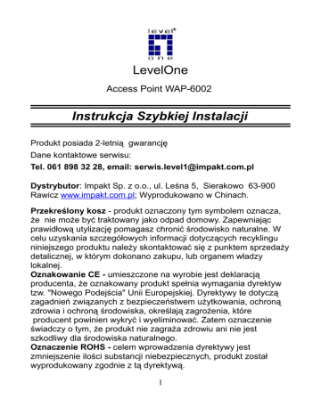 LevelOne Access Point WAP-6002 Instrukcja Szybkiej Instalacji Produkt posiada 2-letnią gwarancję Dane kontaktowe serwisu: Tel. 061 898 32 28, email: [email protected] Dystrybutor: Impakt Sp. z o.o., ul. Leśna 5, Sierakowo 63-900 Rawicz www.impakt.com.pl; Wyprodukowano w Chinach. Przekreślony kosz - produkt oznaczony tym symbolem oznacza, Ŝe nie moŜe być traktowany jako odpad domowy. Zapewniając prawidłową utylizację pomagasz chronić środowisko naturalne. W celu uzyskania szczegółowych informacji dotyczących recyklingu niniejszego produktu naleŜy skontaktować się z punktem sprzedaŜy detalicznej, w którym dokonano zakupu, lub organem władzy lokalnej. Oznakowanie CE - umieszczone na wyrobie jest deklaracją producenta, Ŝe oznakowany produkt spełnia wymagania dyrektyw tzw. "Nowego Podejścia" Unii Europejskiej. Dyrektywy te dotyczą zagadnień związanych z bezpieczeństwem uŜytkowania, ochroną zdrowia i ochroną środowiska, określają zagroŜenia, które producent powinien wykryć i wyeliminować. Zatem oznaczenie świadczy o tym, Ŝe produkt nie zagraŜa zdrowiu ani nie jest szkodliwy dla środowiska naturalnego. Oznaczenie ROHS - celem wprowadzenia dyrektywy jest zmniejszenie ilości substancji niebezpiecznych, produkt został wyprodukowany zgodnie z tą dyrektywą. 1 Zawartość opakowania • • • • • • • WAP-6002 N AP Antena Zasilacz (12VDC, 1A) Kabel Sieciowy RJ-45 Gumowe Stopki CD-ROM z Instrukcją Obsługi Instrukcja Szybkiej Instalacji Jeśli brakuje czegoś z listy, prosimy o kontakt ze sprzedawcą lub dystrybutorem. Zanim Zaczniesz Zanotuj listę ustawień domyślnych. Ustawienia Domyślne IAddres IP Nazwa UŜytkownika / Hasło Sieć Bezprzewodowa Nazwa Sieci Bezprzewodowej (SSID) Zabezpieczenie 192.168.0.1 admin / password Enable (Włączona) LevelOne None (Brak) Instrukcja Szybkiej Instalacji opisuje jedynie najwaŜniejsze ustawienia. Więcej szczegółów znajduje się na płycie CD z Instrukcją Obsługi. Proszę o przygotowanie loginu, hasła i informacji o innych ustawieniach od dostawcy Internetu. 2 Instalacja 1. Odłącz modem ADSL / Sieci Kablowej od prądu. 2. Podłącz znajdującą się w zestawie antenę do AP. 3. Podłącz łącze internetowe do portu WAN. Internet 5. Podłącz zasilacz. 3 6. Poczekaj aŜ dioda sygnalizująca zasilanie (Power) pozostanie włączona. To oznacza, Ŝe AP jest gotowy do pracy. 6. 7. Podłącz ponownie swój modem ADSL / Sieci Kablowej do prądu. Instalacja zakończona. MoŜesz przystąpić do Konfiguracji urządzenia. 4 Sprawdź Swoje Ustawienia Sieciowe (Windows XP / Vista) Naciśnij na Pasek Start i otwórz Panel Sterowania. 1. Windows XP 2. Windows XP, naciśnij dwukrotnie Otoczenie Sieciowe Windows Vista, naciśnij Centrum Sieci i Udostępniania, Windows Vista, naciśnijnastępnie Centrum Sieci i Udostępniania, Zmień ustawienia karty sieciowej następnie Zmień ustawienia karty sieciowej 3. Naciśnij prawym guzikiem na Połączenie Lokalne i wybierz Właściwości. Uwaga: Nazwa połączenia moŜe być inna w zaleŜności od ustawień sieci. 5 Windows Vista 4. Sprawdź czy są zaznaczone Klient Sieci Microsoft Networks, Udostępnianie Plików i Drukarek, i Protokół internetowy w wersji 4 (TCP/IPv4), jeśli nie, to je zaznacz. 5. Wybierz właściwości Protokołu internetowego w wersji 4 (TCP/IPv4). 6. Zaznacz te 2 opcje i kliknij OK. 6 Konfiguracja 1. Zrestartuj komputer. 2. Po ponownym uruchomieniu komputera, uruchom przeglądarkę internetową (Rekomendowany Internet Explorer). W pasku adresów wpisz następujący adres: http://192.168.0.1 Wpisz Nazwę UŜytkownika (User name) i Hasło (Password). Domyślnie: Nazwa UŜytkownika: admin Hasło: password 3. Aby skonfigurować Router, naciśnij na Setup Wizard w lewym menu. 4. Przygotuj informację o swoim loginie, haśle i innych ustawieniach. 5. Kontynuuj według instrukcji wyświetlanych na ekranie aŜ do zakończenia konfiguracji. 7 6. Aby zmienić ustawienia Sieci Bezprzewodowej naciśnij Wireless a później Options. 7. MoŜesz ustawić swoją nazwę sieci bezprzewodowej (SSID) i ustawić zabezpieczenie sieci. 8. LevelOne rekomenduje WPA2-PSK AES dla zachowania maksymalnego poziomu bezpieczeństwa. Proszę pamiętać o ustawieniu identycznych zabezpieczeń sieciowych na Routerze i u klienta. Wpisz klucz sieciowy w polu PSK. 8 Najczęstsze Problemy 1. Nie mogę podłączyć się do AP w celu konfiguracji. Sprawdź czy poprawnie podłączyłeś kabel między AP a komputerem. Sprawdź czy komputer jest ustawiony na automatyczne pobieranie adresu IP z serwera DHCP (patrz Sprawdź Swoje Ustawienia Sieciowe). 2. Nie mogę uzyskać połączenia z Internetem. Wyłącz swój modem ADSL / Sieci Kablowej i AP. Poczekaj 30 sekund i włącz ponownie urządzenia. Jeśli problem będzie dalej występował, zaloguj się do panelu konfiguracyjnego AP i sprawdź czy AP uzyskał Adres IP (Status Page). Jeśli AP nie uzyskał adresu IP, skontaktuj się ze swoim dostawcą Internetu. 3. Nie mogę podłączyć się do sieci bezprzewodowej. Sprawdź czy nazwa sieci bezprzewodowej SSID i ustawienia zabezpieczeń są identyczne na AP i komputerze. Jeśli problem dalej występuje, zrestartuj komputer i AP. Ostatnim rozwiązaniem jest przywrócenie ustawień domyślnych AP. Upewnij się, Ŝe dioda sygnalizująca Power na AP jest stała (nie miga). Naciśnij i przytrzymaj guziki WPS i WLAN przez przynajmniej10 sekund, do momentu aŜ dioda Power mignie 2 razy, następnie puść guziki. AP ma przywrócone domyślne ustawienia fabryczne. 9