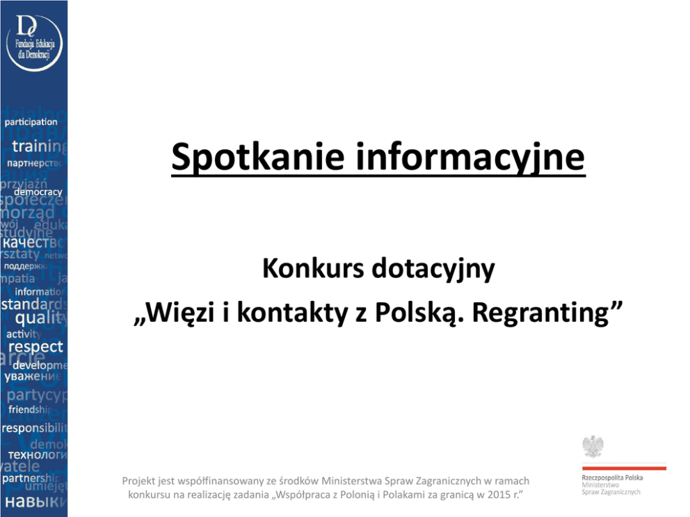 Spotkanie informacyjne Konkurs dotacyjny „Więzi i kontakty z Polską. Regranting” Projekt jest współfinansowany ze środków Ministerstwa Spraw Zagranicznych w ramach konkursu na realizację zadania „Współpraca z Polonią i Polakami za granicą w 2015 r.” Więzi i kontakty z Polską. Regranting Kim jesteśmy? Działamy od 1989 r. w Polsce oraz za granicą, przede wszystkim w Europie Wschodniej, Azji Środkowej i na Kaukazie. Prowadzimy działalność edukacyjną służącą krzewieniu idei demokracji oraz przygotowującą do funkcjonowania w społeczeństwie demokratycznym. Obszary tematyczne to m.in.: Samorządność uczniowska Edukacja obywatelska na Wschodzie Wspieranie przemian systemowych (Ukraina) Rozwój lokalny (np. Kluby Kobiet w Tadżykistanie, szlaki kulturowe w Polsce) Rozwój III sektora (Polska, Wschód, Tunezja) Edukacja globalna Współpraca z Polonią Programy grantodawcze: RITA – Przemiany w regionie Edukacja Globalna Na rzecz Polonii Program stypendialny: im. Lane’a Kirklanda Projekt jest współfinansowany ze środków Ministerstwa Spraw Zagranicznych w ramach konkursu na realizację zadania „Współpraca z Polonią i Polakami za granicą w 2015 r.” Więzi i kontakty z Polską. Regranting Działania FED dotyczące Polonii • Wsparcie finansowe, rzeczowe, merytoryczne polonijnych społecznych szkół uzupełniających w różnych krajach, pod szyldem Szkoła.PL (od 2011 r.) • Podnoszenie kompetencji nauczycieli polonijnych w tym m.in. poprzez szkolenia i konferencje edukacyjne • Szkolenia działaczy polonijnych na Wschodzie (głównie w l. 90-tych XX w.) • Konkursy regrantingowe dla polskich organizacji pozarządowych działających na rzecz środowisk polonijnych (od 2014 r.) Projekt jest współfinansowany ze środków Ministerstwa Spraw Zagranicznych w ramach konkursu na realizację zadania „Współpraca z Polonią i Polakami za granicą w 2015 r.” Więzi i kontakty z Polską. Regranting Konkursy z 2014 r.: „Wzmacnianie i aktywizacja środowisk polskich” i „ Wzmacnianie więzi i kontaktów z Polską” • 12 przyznanych dotacji; • Ponad 1600 bezpośrednich odbiorców działań; • Projekty na rzecz środowisk polonijnych z: Belgii, Białorusi, Estonii, Francji, Grecji, Irlandii, Łotwy, Norwegii, Rosji, Ukrainy, Wielkiej Brytanii, Włoch; • Projekty osiągnęły większość zakładanych celów. Projekt jest współfinansowany ze środków Ministerstwa Spraw Zagranicznych w ramach konkursu na realizację zadania „Współpraca z Polonią i Polakami za granicą w 2015 r.” Więzi i kontakty z Polską. Regranting Źródło finansowania konkursu Projekt jest współfinansowany ze środków Ministerstwa Spraw Zagranicznych w ramach konkursu na realizację zadania „Współpraca z Polonią i Polakami za granicą w 2015r.” Więzi i kontakty z Polską. Regranting Plan współpracy z Polonią i Polakami za granicą w 2015 r. KONKURS REALIZOWANY PRZEZ FED PLAN 2015 OTWARTY KONKURS OFERT MSZ JASNO DOPRECYZOWANE WYMOGI: TEMATYKA ZAKRES GEOGRAFICZNY UPRAWNIONE PODMIOTY WARUNKI FINANSOWE, ITD. Projekt jest współfinansowany ze środków Ministerstwa Spraw Zagranicznych w ramach konkursu na realizację zadania „Współpraca z Polonią i Polakami za granicą w 2015 r.” Więzi i kontakty z Polską. Regranting Cele i zakres tematyczny konkursu Punkt 2. Regulaminu konkursu 2.1. Rozwój kontaktów bezpośrednich z Polską – projekty sprzyjające nawiązywaniu oraz rozwojowi kontaktów bezpośrednich polskiej diaspory z Polską 2.2. Utrwalanie więzi z Polską – projekty sprzyjające umacnianiu więzi z Polską, długotrwałym pobytom w Polsce oraz powrotom do kraju Nie ma odgórnego podziału puli środków pomiędzy tematy. Projekt jest współfinansowany ze środków Ministerstwa Spraw Zagranicznych w ramach konkursu na realizację zadania „Współpraca z Polonią i Polakami za granicą w 2015 r.” Więzi i kontakty z Polską. Regranting Zasięg geograficzny konkursu • Projekty mogą dotyczyć wspierania polskiej diaspory z CAŁEGO ŚWIATA – bez priorytetów geograficznych lub podziału puli środków na regiony; • Głównym miejscem realizacji działań powinna być POLSKA. Wymóg ten nie dotyczy jedynie projektów, których głównym celem jest popularyzacja różnych inicjatyw wspierających rozwój Polonii w jej kręgach. Projekt jest współfinansowany ze środków Ministerstwa Spraw Zagranicznych w ramach konkursu na realizację zadania „Współpraca z Polonią i Polakami za granicą w 2015 r.” Więzi i kontakty z Polską. Regranting Wymogi merytoryczne • Polecamy pkt.6 Regulaminu Potrzeby odbiorców Trwałe rezultaty Projekt jest współfinansowany ze środków Ministerstwa Spraw Zagranicznych w ramach konkursu na realizację zadania „Współpraca z Polonią i Polakami za granicą w 2015 r.” Więzi i kontakty z Polską. Regranting Podmioty uprawnione do składania wniosku • • • • • • • stowarzyszenia, fundacje, organizacje stworzone w oparciu o umowę państwo-kościół (zgodnie z pkt. 3.1.3. Regulaminu Konkursu); stowarzyszenia jednostek samorządu terytorialnego; spółdzielnie socjalne; niepubliczne szkoły wyższe; spółki akcyjne i spółki z ograniczoną odpowiedzialnością oraz kluby sportowe będące spółkami działającymi na podstawie przepisów ustawy z dnia 25 czerwca 2010 r. o sporcie (Dz. U. Nr 127, poz. 857, z późn. zm.), które nie działają w celu osiągnięcia zysku oraz przeznaczają całość dochodu na realizację celów statutowych oraz nie przeznaczają zysku do podziału między swoich udziałowców, akcjonariuszy i pracowników. Projekt jest współfinansowany ze środków Ministerstwa Spraw Zagranicznych w ramach konkursu na realizację zadania „Współpraca z Polonią i Polakami za granicą w 2015 r.” Więzi i kontakty z Polską. Regranting Partnerzy • Obowiązkowy udział partnera polonijnego; • Rola w projekcie: wspólne planowanie, administr