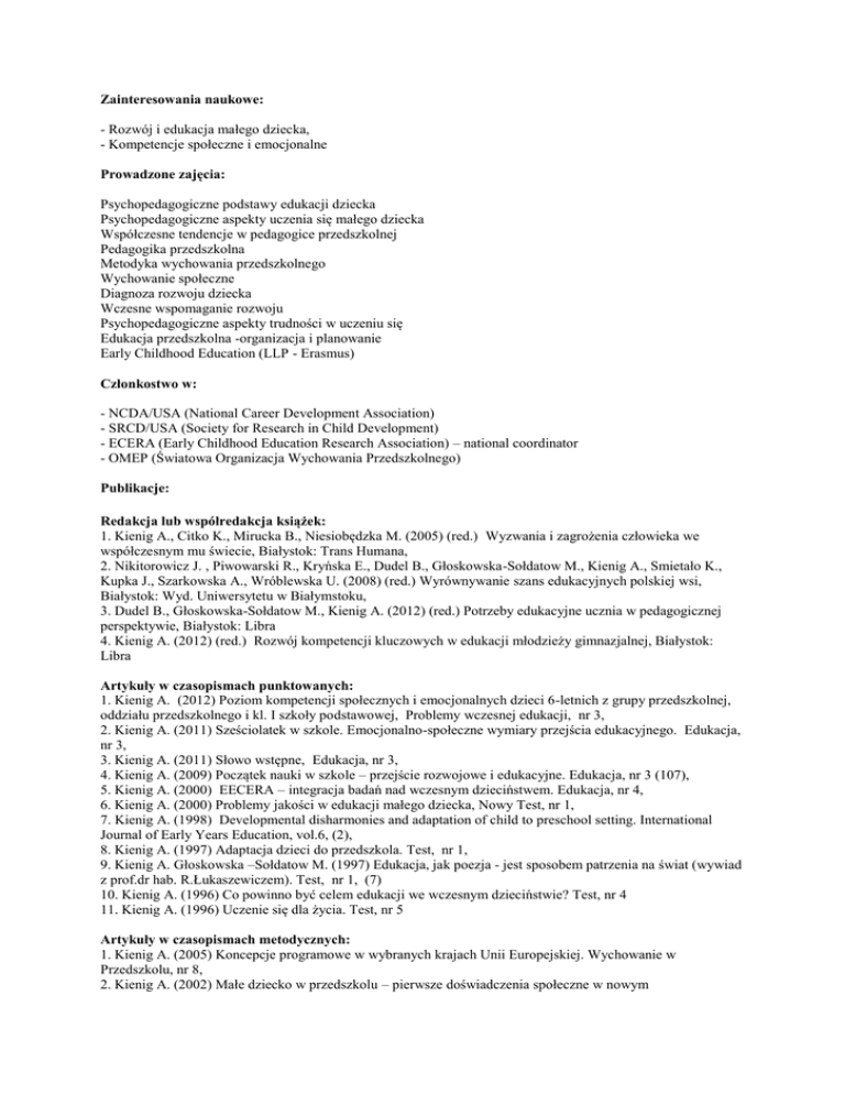 Zainteresowania naukowe: - Rozwój i edukacja małego dziecka, - Kompetencje społeczne i emocjonalne Prowadzone zajęcia: Psychopedagogiczne podstawy edukacji dziecka Psychopedagogiczne aspekty uczenia się małego dziecka Współczesne tendencje w pedagogice przedszkolnej Pedagogika przedszkolna Metodyka wychowania przedszkolnego Wychowanie społeczne Diagnoza rozwoju dziecka Wczesne wspomaganie rozwoju Psychopedagogiczne aspekty trudności w uczeniu się Edukacja przedszkolna -organizacja i planowanie Early Childhood Education (LLP - Erasmus) Członkostwo w: - NCDA/USA (National Career Development Association) - SRCD/USA (Society for Research in Child Development) - ECERA (Early Childhood Education Research Association) – national coordinator - OMEP (Światowa Organizacja Wychowania Przedszkolnego) Publikacje: Redakcja lub współredakcja książek: 1. Kienig A., Citko K., Mirucka B., Niesiobędzka M. (2005) (red.) Wyzwania i zagrożenia człowieka we współczesnym mu świecie, Białystok: Trans Humana, 2. Nikitorowicz J. , Piwowarski R., Kryńska E., Dudel B., Głoskowska-Sołdatow M., Kienig A., Smietało K., Kupka J., Szarkowska A., Wróblewska U. (2008) (red.) Wyrównywanie szans edukacyjnych polskiej wsi, Białystok: Wyd. Uniwersytetu w Białymstoku, 3. Dudel B., Głoskowska-Sołdatow M., Kienig A. (2012) (red.) Potrzeby edukacyjne ucznia w pedagogicznej perspektywie, Białystok: Libra 4. Kienig A. (2012) (red.) Rozwój kompetencji kluczowych w edukacji młodzieży gimnazjalnej, Białystok: Libra Artykuły w czasopismach punktowanych: 1. Kienig A. (2012) Poziom kompetencji społecznych i emocjonalnych dzieci 6-letnich z grupy przedszkolnej, oddziału przedszkolnego i kl. I szkoły podstawowej, Problemy wczesnej edukacji, nr 3, 2. Kienig A. (2011) Sześciolatek w szkole. Emocjonalno-społeczne wymiary przejścia edukacyjnego. Edukacja, nr 3, 3. Kienig A. (2011) Słowo wstępne, Edukacja, nr 3, 4. Kienig A. (2009) Początek nauki w szkole – przejście rozwojowe i edukacyjne. Edukacja, nr 3 (107), 5. Kienig A. (2000) EECERA – integracja badań nad wczesnym dzieciństwem. Edukacja, nr 4, 6. Kienig A. (2000) Problemy jakości w edukacji małego dziecka, Nowy Test, nr 1, 7. Kienig A. (1998) Developmental disharmonies and adaptation of child to preschool setting. International Journal of Early Years Education, vol.6, (2), 8. Kienig A. (1997) Adaptacja dzieci do przedszkola. Test, nr 1, 9. Kienig A. Głoskowska –Sołdatow M. (1997) Edukacja, jak poezja - jest sposobem patrzenia na świat (wywiad z prof.dr hab. R.Łukaszewiczem). Test, nr 1, (7) 10. Kienig A. (1996) Co powinno być celem edukacji we wczesnym dzieciństwie? Test, nr 4 11. Kienig A. (1996) Uczenie się dla życia. Test, nr 5 Artykuły w czasopismach metodycznych: 1. Kienig A. (2005) Koncepcje programowe w wybranych krajach Unii Europejskiej. Wychowanie w Przedszkolu, nr 8, 2. Kienig A. (2002) Małe dziecko w przedszkolu – pierwsze doświadczenia społeczne w nowym środowisku, Dziecko i jego świat, nr 2 3. Kienig A. (1996) Czy nauka czytania w przedszkolu może być łatwa i przyjemna? w: Wychowanie w Przedszkolu, nr 2 4. Kienig A. (1983) Wybrane problemy wieku przedszkolnego. Dojrzałość dzieci do przedszkola. Nowa Szkoła, nr 5 Rozdziały w monografiach: 1. Kienig A. (2012) Funkcjonowanie emocjonalno-społeczne dzieci 6-letnich w kl. I szkoły podstawowej (w:) Janina Uszyńska-Jarmoc, Andrzej Cichocki (red.) Edukacja elementarna w teorii i praktyce, Białystok: Trans Humana 2. Kienig A. (2012) Charakterystyka rozwoju w okresie dorastania, (w:) Kienig A. (red.) Rozwój kompetencji kluczowych w edukacji młodzieży gimnazjalnej, Białystok: Libra 3. Kienig A. (2012) Wspieranie rozwoju kompetencji kluczowych uczniów gimnazjum w projekcie „Rozwój przez kompetencje“ (w:) Kienig A. (red.) Rozwój kompetencji kluczowych w edukacji młodzieży gimnazjalnej, Białystok: Libra 4. Kienig A. (2010) Edukacja przedszkolna – wybrane problemy (w:). A. Krajewska (red.) Przemiany w kształceniu pedagogów, Olecko: Wydawnictwo WM, 5. Kienig A. (2009) Sytuacja psychospołeczna uczniów w trakcie przejścia między I a II etapem kształcenia w szkole podstawowej (w:) J. Izdebska, J. Szymanowska (red.) Wielowymiarowość przestrzeni życia współczesnego dziecka, Białystok: Trans Humana, 6. Kienig A. (2008) Proces wczesnej adaptacji do przedszkola – wspieranie kompetencji społecznych małego dziecka (w:) W. Puślecki (red.) Wspieranie rozwoju dzieci w procesie wczesnej edukacji, Wrocław: Wyd. Naukowe Dolnośląskiej Szkoły Wyższej, 7. Kienig A. (2008) Reklama telewizyjna w percepcji dzieci w wieku przedszkolnym (w:) J. Izdebska (red.) Media elektroniczne w życiu dziecka w kontekście wartości wychowawczych oraz zagrożeń, Białystok: Trans Humana, 8. Kienig A. (2008) Sytuacja w zakresie instytucjonalnej opieki nad dzieckiem w Polsce w świetle badań (w:) C. Sadowska- Snarska (red.) Równowaga. Praca –życie – rodzina, Białystok: Wyd. WSE, 9. Kienig A. (2008) Ocena systemu edukacji przedszkolnej na terenie miasta Białegostoku w świetle badań (w:) C. Sadowska – Snarska (red.) Kierunki zmian w systemie instytucjonalnej opieki nad dzieckiem w Polsce, Białystok: Wyd. WSE, 10. Kienig A. (2008) Metody diagnozowania zdolności i uzdolnień uczniów szkół podstawowych i ponadpodstawowych (w:) M. Wróblewska (red.) Kształcenie i promowanie uczniów zdolnych, Białystok: Trans Humana, 11. Kienig A. (2008) Przygotowanie dziecka do szkoły – zapobieganie trudnościom w nauce (w:) Wyrównywanie szans edukacyjnych polskiej wsi (praca zbiorowa), Białystok: Wyd. Uniwersytetu w Białymstoku, 12. Kienig A. (2007) Wychowanie we wczesnym dzieciństwie – prawa dziecka a rozwijanie poczucia odpowiedzialności (w:) E. Kryńska, Skreczko A. (red.) Wychowanie – ale jakie? Białystok: Trans Humana, 13. Kienig A. (2007) Transitions in the early childhood (w:) Harkonen, U. & Savolainen, E. (eds.) International views o