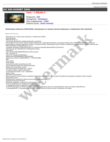 Informacje o produkcie Utworzono 03-03-2017 JVC KW-AV60BT 2DIN Cena : 1.599,00 zł Producent : JVC Dostępność : Dostępny Stan magazynowy : niski Średnia ocena : brak recenzji Multimedialny odtwarzacz DVD/CD/USB z wbudowanym 6,1-calowym ekranem dotykowym o rozdzielczości VGA z Bluetooth S p e c y f i k a c j a: w at er m ar k Wbudowany 6,1-calowy ekran dotykowy o rozdzielczości WVGA Panel dotykowy MOS-FET 50 W x 4 Technologia Bluetooth*1 (adapter Bluetooth w zestawie) (Phone Book Access Profile, transfer książki telefonicznej, zestaw głośnomówiący, przesyłanie plików audio, AVRCP, powiadomienie o SMS-ach przychodzących, głosowe wybieranie numeru, sterowanie radiem internetowym przez smartfon, alfabetyczne wyszukiwanie w książce telefonicznej) USB Audio/Video do iPoda/iPhone'a, itp. *2 2 sposoby sterowania iPodem/iPhone'em*3 (z poziomu jednostki głównej/iPoda lub iPhone'a) Tryb App Link dla iPoda/iPhona*2 (Obsługiwane Apps) iPoda out*2 Port USB (tył) (MP3/WMA/WAV/iPod & iPhone Audio) USB - zasilanie 1A Tryb Drive Change dla BlackBerry Odtwarzanie MP3/WMA/WAV (DVD/CD/USB) Odtwarzanie plików DivX/JPEG/MPEG 1, 2 (DVD/CD/USB) RDS Tuner HS-IVi Dolby Digital 3-pasmowy korektor parametryczny iEQ Filtr górnoprzepustowy/ filtr dolnoprzepustowy Wejście AUX na przednim panelu Terminale wejścia liniowego (AV + Video) 4V wyjście liniowe, wyjście subwoofera 3 terminale RCA (przód + tył + subwoofer) Wyjście video Sterowanie subwooferem Menu ekranowe w wielu językach (angielski/ hiszpański/ francuski/ niemiecki/ włoski/ holenderski/ portugalski/ szwedzki/ duński/ rosyjski) Zdejmowany panel Wielokolorowy wyświetlacz (płynna zmiana koloru podświetlenia) Automatyczne przyciemnienie Możliwość współpracy z fabrycznym sterowaniem audio Terminal dedykowany do podłączenia kamery cofania *1 Dostępność funkcji w zależności od modelu telefonu *2 KS-U30 wymagany do iPoda out/odtwarzania plików video/trybu App Link. Kompatybilność zależy od modelu iPoda/iPhone'a *3 Kompatybilność z 2-sposobami sterowania iPodem/iPhone'em może się różnić w zależności od modelu Wygenerowano w programie www.oscGold.com