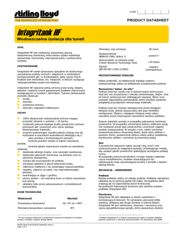CI/SfB PRODUCT DATASHEET Integritank HF Wodoszczelna izolacja dla tuneli OPIS Minimalny czas schnięcia 30 minut Integritank HF jest reaktywną, bezszwową, płynną, elastomerową membraną, która bardzo szybko twardnieje zapewniając wytrzymałą, nieprzepuszczalną i wodoszczelną powłokę. Wodoszczelność (BS8102:1990, tablica 1) poziom 4 ZASTOSOWANIE Palność (BS EN ISO 11925-2:2002) Integritank HF został opracowany specjalnie do skutecznego uszczelnienia podłoży suchych i wilgotnych w zamkniętych pomieszczeniach jak i w środowiskach, gdzie użycie innych środków jest niemożliwe, tzn. miejscach, w których występuje niebezpieczeństwo pożaru lub eksplozji. Integritank HF zapewnia pełną ochronę przed wodą, olejami, paliwem i wieloma innymi agresywnymi środkami chemicznymi występującymi w tunelach i zbiornikach. Typowe zastosowanie produktu obejmuje: tunele, zbiorniki, podziemne komory, zbiorniki z odpadami nuklearnymi. CECHY 100% skuteczność wodoszczelnej ochrony mogąca przenieść ciśnienie o wartości > 10 barów, możliwość pokrycia każdego profilu powierzchni zarówno pionowych jak i poziomych przy użyciu jednego tiksotropowego materiału, program gwarantujący wysokiej jakości izolację oraz jej wykonanie w warunkach budowlanych składający się z: dwie warstwy o kontrastujących barwach, kontrola grubości warstw w trakcie nanoszenia powłoki, kontrola jakości wykonanych powłok po naniesieniu materiału, doskonała adhezja między- oraz wewnątrz warstwowa, doskonała odporność chemiczna, na ścieranie oraz na uderzenia (obciążenia), wysoka siła przyczepności do podłoża, zmniejsza spękania w płycie betonowej mostu, całkowicie reaktywny i nie zawierający rozpuszczalników, niepalny, odporny na ogień i nie rozprzestrzeniający płomieni, twardniejący w ciągu 1 godziny, płynny system – nie wytwarza kurzu w trakcie nanoszenia pod ziemią, układany tylko przez autoryzowanych i przeszkolonych pracowników. Wytrzymałość na ciśnienie wody (Taylor Woodrow Technology Test) >10 barów niepalny (samogasnący) PRZYGOTOWANIE PODŁOŻA Należy podkreślić, że efektywność każdego systemu wodoszczelnego zależy od dokładności przygotowania podłoża. Nanoszenie i beton „In-situ” Podłoże musi być czyste oraz w dobrym stanie technicznym. Musi być ono oczyszczone z mleczka cementowego, olejów oraz od innych zanieczyszczeń osłabiających wiązanie. Beton musi posiadać odpowiednią wytrzymałość, która umożliwi uzyskanie pożądanej przyczepności nanoszonego materiału. Podłoże musi być również zabezpieczone przed dostępem bieżącej wody, jednak dopuszczalne jest jego niewielkie zawilgocenie. Miejsca z dostępem bieżącej wody należy uszczelnić przed rozpoczęciem nanoszenia warstwy podkładu. Zużycie materiału wzrasta w przypadku pokrywania nierównej powierzchni. W przypadku wzmocnienia betonu włóknami mogą one wystawać ponad jego powierzchnię i przerywać ciągłość powłoki wodoszczelnej. W związku z tym, należy wyrównać powierzchnię betonu drewnianą deską. Jeżeli użyto włókien o grubości 25mm, powierzchnie betonu należy pokryć dodatkową warstwą bez włókien i wyrównać ją drewnianą deską. Stal Z powierzchni stalowych należy usunąć rdzę, brud i inne zanieczyszczenia do osiągnięcia jasnego, połyskującego metalu, aby uzyskać jakość powierzchni spełniającej wymagania polskiej normy. W przypadku pokrycia konstrukcji z innego rodzaju materiału, użycia modyfikatorów, środków utwardzających lub zastosowania masy uszczelniającej prosimy o kontakt z działem obsługi klienta. APLIKACJA – NANOSZENIE Podkład Rodzaj podkładu zależy od rodzaju podłoża. Podkłady najczęściej układane są za pomocą pędzla lub wałka. Szczegółowe dane znajdują się na odpowiedniej karcie technicznej. Na podłożach betonowych konieczne jest ułożenie warstwy podkładu Integritank HF2. DANE TECHNICZNE Właściwość Temperatura stosowania1 Minimalna temperatura nanoszenia 1 Wartość Od -5oC do +40oC 8oC W celu uzyskania informacji o temperaturze stosowania materiału na zewnątrz prosimy o kontakt z działem obsługi klienta. MA202 Bond Coat SA1030 Datasheet Issue 5 Page 1 of 2 Membrana Integritank HF jest nakładany w dwóch warstwach o kontrastujących kolorach. Po naniesieniu pierwszej-żółtej warstwy, układana jest druga warstwa w kolorze białym. Integritank HF jest odmierzany, mieszany i nanoszony przy użyciu specjalistycznego sprzętu, który gwarantuje ułożenie 2 Podkład Integritank HF w trakcie nanoszenia jest mętny co ułatwia dokładne pokrycie nawierzchni w ciemnych pomieszczeniach. Po utwardzeniu jest gładki. CI/SfB PRODUCT DATASHEET Integritank HF Wodoszczelna izolacja dla tuneli mokrej warstwy materiału o grubości 1,7mm. Po wyschnięciu otrzymuje się suchą warstwę u grubości 1,5mm. WYDAJNOŚĆ MATERIAŁU Podkład Integritank HF Integritank HF (minimum) 0,05-0,1kg/m2 1,8kg/m2/warstwa Wydajność pokrywania zależy od struktury i porowatości powierzchni. CZYSZCZENIE Sprzęt użyty do wykonania izolacji Integritank HF należy opłukać SL Flushing Media. Wszystkie narzędzia oraz sprzęt mogą być wyczyszczone przy użyciu SL Flushing Media, jednak te użyte wyłącznie do nałożenia podkładu, przed rozpoczęciem twardnienia materiału, można wyczyścić pod bieżącą wodą. PAKOWANIE I PRZECHOWYWANIE Podkład Integritank HF – opakowania 25kg Integritank HF – zestawy 48kg i 400kg Wszystkie składniki systemu Eliminator powinny być przechowywane w chłodnych, suchych, zabezpieczonych pomieszczeniach, bez bezpośredniego dostępu promieni słonecznych oraz zgodnie z przepisami PZH. Temperatura przechowywania nie może przekraczać 25oC. Nie przechowywać w pobliżu otwartego ognia oraz artykułów spożywczych. Podkładu Integritank HF nie należy przechowywać w temperaturach ujemnych. Dopuszczalny czas magazynowania w zamkniętym pojemni