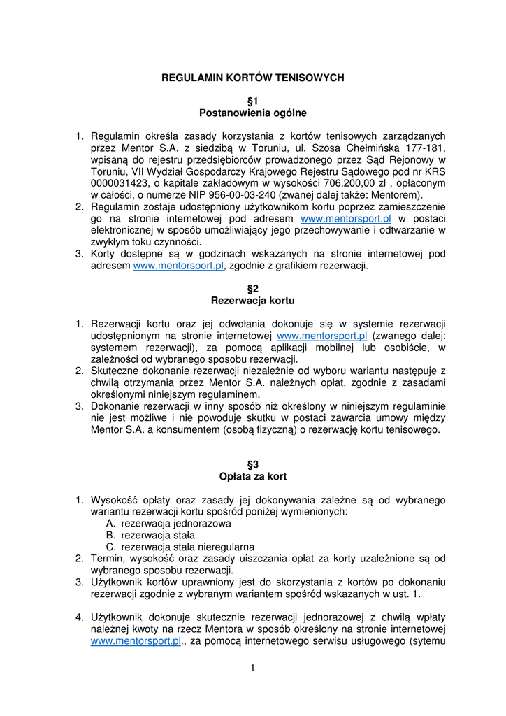 REGULAMIN KORTÓW TENISOWYCH §1 Postanowienia ogólne 1. Regulamin określa zasady korzystania z kortów tenisowych zarządzanych przez Mentor S.A. z siedzibą w Toruniu, ul. Szosa Chełmińska 177-181, wpisaną do rejestru przedsiębiorców prowadzonego przez Sąd Rejonowy w Toruniu, VII Wydział Gospodarczy Krajowego Rejestru Sądowego pod nr KRS 0000031423, o kapitale zakładowym w wysokości 706.200,00 zł , opłaconym w całości, o numerze NIP 956-00-03-240 (zwanej dalej także: Mentorem). 2. Regulamin zostaje udostępniony użytkownikom kortu poprzez zamieszczenie go na stronie internetowej pod adresem www.mentorsport.pl w postaci elektronicznej w sposób umożliwiający jego przechowywanie i odtwarzanie w zwykłym toku czynności. 3. Korty dostępne są w godzinach wskazanych na stronie internetowej pod adresem www.mentorsport.pl, zgodnie z grafikiem rezerwacji. §2 Rezerwacja kortu 1. Rezerwacji kortu oraz jej odwołania dokonuje się w systemie rezerwacji udostępnionym na stronie internetowej www.mentorsport.pl (zwanego dalej: systemem rezerwacji), za pomocą aplikacji mobilnej lub osobiście, w zależności od wybranego sposobu rezerwacji. 2. Skuteczne dokonanie rezerwacji niezależnie od wyboru wariantu następuje z chwilą otrzymania przez Mentor S.A. należnych opłat, zgodnie z zasadami określonymi niniejszym regulaminem. 3. Dokonanie rezerwacji w inny sposób niż określony w niniejszym regulaminie nie jest możliwe i nie powoduje skutku w postaci zawarcia umowy między Mentor S.A. a konsumentem (osobą fizyczną) o rezerwację kortu tenisowego. §3 Opłata za kort 1. Wysokość opłaty oraz zasady jej dokonywania zależne są od wybranego wariantu rezerwacji kortu spośród poniżej wymienionych: A. rezerwacja jednorazowa B. rezerwacja stała C. rezerwacja stała nieregularna 2. Termin, wysokość oraz zasady uiszczania opłat za korty uzależnione są od wybranego sposobu rezerwacji. 3. Użytkownik kortów uprawniony jest do skorzystania z kortów po dokonaniu rezerwacji zgodnie z wybranym wariantem spośród wskazanych w ust. 1. 4. Użytkownik dokonuje skutecznie rezerwacji jednorazowej z chwilą wpłaty należnej kwoty na rzecz Mentora w sposób określony na stronie internetowej www.mentorsport.pl., za pomocą internetowego serwisu usługowego (sytemu 1 płatności) prowadzonego przez Dotpay S.A. wskazując termin rezerwacji tj. datę i godzinę rezerwacji. 5. Dokonanie rezerwacji jednorazowej możliwe jest wyłącznie za pomocą systemu rezerwacji. 6. Dokonanie skutecznej rezerwacji jednorazowej (zwanej dalej także: rezerwacją pierwotną) w terminie wskazanym przez rezerwującego użytkownika oraz odwołanie jej nie później niż 24 godziny przed zarezerwowanym terminem, uprawnia użytkownika do skorzystania z kortu w innym dostępnym terminie do końca miesiąca, na który dokonana została rezerwacja jednorazowa. W przypadku gdy termin rezerwacji pierwotnej przypada w ostatnim tygodniu miesiąca, użytkownik uprawniony jest do skorzystania z kortu w pierwszym tygodniu następnego miesiąca. Nieskorzystanie z dodatkowego terminu nie uprawnia użytkownika do otrzymania zwrotu za dokonana rezerwację (opłacone wejście). 7. Dokonanie rezerwacji jednorazowej możliwe jest w terminie dostępnym w chwili rezerwacji w systemie rezerwacyjnym funkcjonującym na stronie internetowej www.mentorsport.pl . Użytkownik uprawniony jest do dokonania rezerwacji na jeden dostępny termin. Dokonanie następnej rezerwacji w tym trybie możliwe jest po skorzystaniu z kortu w zarezerwowanym pierwotnie terminie lub w terminie wybranym zastępczo przez użytkownika zgodnie z zasadami określonymi w ust. 6. Zarządzający kortami nie dopuszcza jednorazowej rezerwacji na kilka terminów (gier). 8. W przypadku nieodwołania rezerwacji lub odwołania jej w czasie krótszym niż 24 godziny przed zarezerwowanym terminem, Mentor S.A. uprawniony jest do naliczenia kary umownej w wysokości stawki jednorazowej rezerwacji kortu, w zależności od dnia tygodnia i godziny rezerwacji, zgodnie z cennikiem widniejącym na stronie internetowej. Mentor S.A. dokonuje potrącenia wskazanej kwoty z należnością wpłaconą przez użytkownika w chwili dokonania skutecznej rezerwacji kortu. 9. Każdy użytkownik kortów uprawniony jest do dokonania rezerwacji stałej polegającej na rezerwacji kortu na co najmniej jeden stały termin (na określoną godzinę w określonej dacie) w tygodniu na cały miesiąc. 10. Rezerwacja stała zostaje aktywowana z chwilą dokonania pierwszej wpłaty za miesiąc korzystania z kortów. Aktywowana w ten sposób rezerwacja zostaje utrzymana przez następne miesiące do końca sezonu pod warunkiem dokonywania regularnych wpłat do 20-tego miesiąca poprzedzającego miesiąc objęty rezerwacją. 11. W przypadku niedokonania wpłaty za rezerwację stałą w wyznaczonych terminach (niezależnie od regularności i terminów korzystania z kortu) nie następuje skuteczne dokonanie rezerwacji stałej, a tym samym użytkownik kortów zobowiązany jest do zapłaty kwot odpowiadających rezerwacji jednorazowej. 12. Odwołanie jednego z terminów rezerwacji stałej nie później niż 24 godziny przed zarezerwowanym terminem uprawnia użytkownika do skorzystania z kortu w innym dostępnym terminie do końca miesiąca następującego po tym, w którym odwołano rezerwację. W takim przypadku termin wybrany zastępczo zgodnie z zasadami określonymi powyżej nie może pokrywać się ze stałym terminem rezerwacji. Nieskorzystanie z dodatkowego terminu nie uprawnia użytkownika do otrzymania zwrotu za dokonana rezerwację (opłacone wejście). 2 13. W przypadku nieodwołania rezerwacji kortu przypadającej na konkretny termin określony zgodnie z harmonogramem rezerwacji stałej lub odwołania jej później niż 24 godziny przed terminem, użytkownik posiadający rezerwację stałą obciążony zostaje karą umowną w wysokości kwoty należnej za korzystanie z kortu w ww. konkretnym