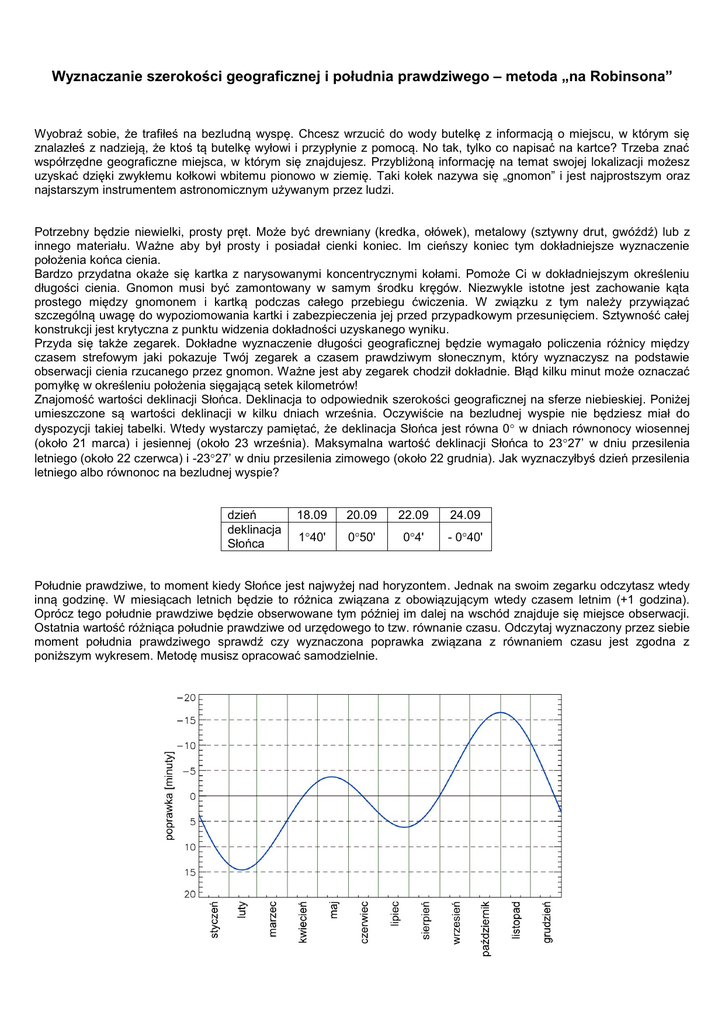 Wyznaczanie szerokości geograficznej i południa prawdziwego – metoda „na Robinsona” Wyobraź sobie, że trafiłeś na bezludną wyspę. Chcesz wrzucić do wody butelkę z informacją o miejscu, w którym się znalazłeś z nadzieją, że ktoś tą butelkę wyłowi i przypłynie z pomocą. No tak, tylko co napisać na kartce? Trzeba znać współrzędne geograficzne miejsca, w którym się znajdujesz. Przybliżoną informację na temat swojej lokalizacji możesz uzyskać dzięki zwykłemu kołkowi wbitemu pionowo w ziemię. Taki kołek nazywa się „gnomon” i jest najprostszym oraz najstarszym instrumentem astronomicznym używanym przez ludzi. Potrzebny będzie niewielki, prosty pręt. Może być drewniany (kredka, ołówek), metalowy (sztywny drut, gwóźdź) lub z innego materiału. Ważne aby był prosty i posiadał cienki koniec. Im cieńszy koniec tym dokładniejsze wyznaczenie położenia końca cienia. Bardzo przydatna okaże się kartka z narysowanymi koncentrycznymi kołami. Pomoże Ci w dokładniejszym określeniu długości cienia. Gnomon musi być zamontowany w samym środku kręgów. Niezwykle istotne jest zachowanie kąta prostego między gnomonem i kartką podczas całego przebiegu ćwiczenia. W związku z tym należy przywiązać szczególną uwagę do wypoziomowania kartki i zabezpieczenia jej przed przypadkowym przesunięciem. Sztywność całej konstrukcji jest krytyczna z punktu widzenia dokładności uzyskanego wyniku. Przyda się także zegarek. Dokładne wyznaczenie długości geograficznej będzie wymagało policzenia różnicy między czasem strefowym jaki pokazuje Twój zegarek a czasem prawdziwym słonecznym, który wyznaczysz na podstawie obserwacji cienia rzucanego przez gnomon. Ważne jest aby zegarek chodził dokładnie. Błąd kilku minut może oznaczać pomyłkę w określeniu położenia sięgającą setek kilometrów! Znajomość wartości deklinacji Słońca. Deklinacja to odpowiednik szerokości geograficznej na sferze niebieskiej. Poniżej umieszczone są wartości deklinacji w kilku dniach września. Oczywiście na bezludnej wyspie nie będziesz miał do dyspozycji takiej tabelki. Wtedy wystarczy pamiętać, że deklinacja Słońca jest równa 0 w dniach równonocy wiosennej (około 21 marca) i jesiennej (około 23 września). Maksymalna wartość deklinacji Słońca to 2327’ w dniu przesilenia letniego (około 22 czerwca) i -2327’ w dniu przesilenia zimowego (około 22 grudnia). Jak wyznaczyłbyś dzień przesilenia letniego albo równonoc na bezludnej wyspie? dzień deklinacja Słońca 18.09 20.09 22.09 24.09 140' 050' 04' - 040' Południe prawdziwe, to moment kiedy Słońce jest najwyżej nad horyzontem. Jednak na swoim zegarku odczytasz wtedy inną godzinę. W miesiącach letnich będzie to różnica związana z obowiązującym wtedy czasem letnim (+1 godzina). Oprócz tego południe prawdziwe będzie obserwowane tym później im dalej na wschód znajduje się miejsce obserwacji. Ostatnia wartość różniąca południe prawdziwe od urzędowego to tzw. równanie czasu. Odczytaj wyznaczony przez siebie moment południa prawdziwego sprawdź czy wyznaczona poprawka związana z równaniem czasu jest zgodna z poniższym wykresem. Metodę musisz opracować samodzielnie. Doświadczenie polega na oznaczaniu położenia końca cienia gnomonu oraz wyznaczeniu szerokości geograficznej miejsca obserwacji, momentu południa prawdziwego oraz kierunku południowego. Jak przekonasz się podczas wykonywania pomiarów południe prawdziwe nie wypada dokładnie o godzinie 12-tej. Według czasu wschodnioeuropejskiego, jakim posługujemy się w lecie, będzie to bliżej godziny 13-tej. W związku z tym rozpocznij obserwacje około 12:00 i zakończ około 14:00. Po rozpoczęciu doświadczenia zaznaczaj kolejne położenia końca cienia gnomonu i notuj dokładny czas. Wystarczy jeśli będziesz zaznaczać kropki co kilka minut. To wszystko. Punkty krytyczne. Doświadczenie nie uda się jeśli: - Gnomon nie będzie sztywno połączony z kartką z kołami - Tarcza nie zostanie wypoziomowana - Gnomon nie będzie prostopadły do kartki z kołami - Kartka zostanie poruszona podczas doświadczenia Przykład wyglądu stanowiska obserwacyjnego: Analiza obserwacji. Po zakończeniu pomiarów będziesz musiał je przeanalizować. Brzmi to jak coś skomplikowanego ale w rzeczywistości jest dość proste. W pierwszym kroku trzeba wyznaczyć długość cienia w momencie gdy był on najkrótszy. W tym celu zmierz odległość każdego zaznaczonego punktu od miejsca, w którym był wbity gnomon. Następnie wybierz najmniejszą z uzyskanych wartości. To będzie długość cienia gnomonu w południe prawdziwe (Dc). Przyda się do obliczenia wysokości Słońca nad horyzontem. Najpierw musisz policzyć tangens tej wysokości. Zrobisz to dzieląc przez siebie długość gnomonu (Dg) przez długość cienia (Dc). Następnie używając tablic matematycznych lub kalkulatora możesz policzyć arcus tangens z otrzymanej wartości. W ten sposób wyznaczysz wysokość Słońca nad horyzontem. Powinieneś otrzymać wartość wyrażoną w stopniach. Ostatnią czynnością jest podstawienie uzyskanej wysokości (h) i deklinacji Słońca (δ) do podanego poniżej wzoru. Długość gnomonu Dg_______ cm Długość cienia w południe prawdziwe Dc______ cm Tangens wysokości Slońca nad horyzontem Wysokość Słońca nad horyzontem Szerokość geograficzna miejsca obserwacji _________ __________ ____________ Wyznaczenie momentu południa prawdziwego to chyba najłatwiejsza część doświadczenia. Wystarczy podać, o której godzinie cień był najkrótszy. Pamiętając, że Twój zegarek podaje czas dla pewnej strefy czasowej, możesz wyznaczyć długość geograficzną miejsca obserwacji wykorzystując różnicę między czasem strefowym, a czasem południa prawdziwego. Wyznaczenie kierunku południowego. To trudny moment, bo będzie wymagał rysowania po kartce pomiarowej, która nie
