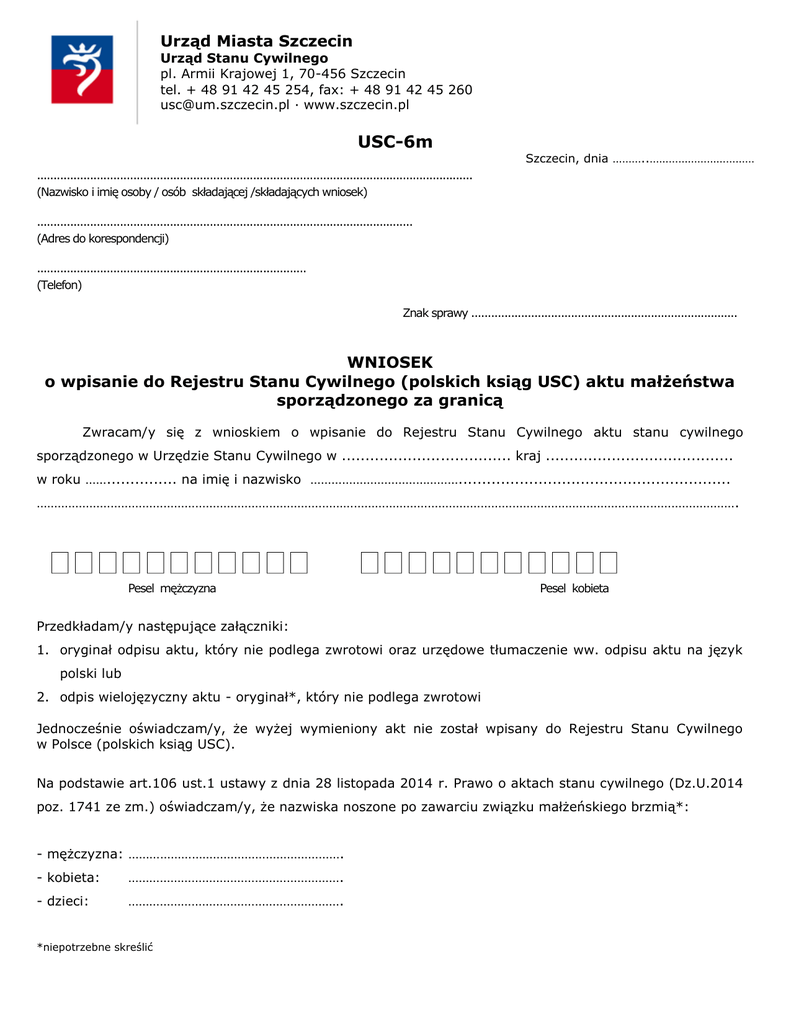 Urząd Miasta Szczecin Urząd Stanu Cywilnego pl. Armii Krajowej 1, 70-456 Szczecin tel. + 48 91 42 45 254, fax: + 48 91 42 45 260 [email protected] ∙ www.szczecin.pl USC-6m Szczecin, dnia ………..…………………………… ................................................................................................................................... (Nazwisko i imię osoby / osób składającej /składających wniosek) ................................................................................................................. (Adres do korespondencji) ................................................................................. (Telefon) Znak sprawy ................................................................................ WNIOSEK o wpisanie do Rejestru Stanu Cywilnego (polskich ksiąg USC) aktu małżeństwa sporządzonego za granicą Zwracam/y się z wnioskiem o wpisanie do Rejestru Stanu Cywilnego aktu stanu cywilnego sporządzonego w Urzędzie Stanu Cywilnego w .................................... kraj ........................................ w roku ……............... na imię i nazwisko …………………………………….......................................................... ………………………………………………………………………………………………………………………………………………………………………………. Pesel mężczyzna Pesel kobieta Przedkładam/y następujące załączniki: 1. oryginał odpisu aktu, który nie podlega zwrotowi oraz urzędowe tłumaczenie ww. odpisu aktu na język polski lub 2. odpis wielojęzyczny aktu - oryginał*, który nie podlega zwrotowi Jednocześnie oświadczam/y, że wyżej wymieniony akt nie został wpisany do Rejestru Stanu Cywilnego w Polsce (polskich ksiąg USC). Na podstawie art.106 ust.1 ustawy z dnia 28 listopada 2014 r. Prawo o aktach stanu cywilnego (Dz.U.2014 poz. 1741 ze zm.) oświadczam/y, że nazwiska noszone po zawarciu związku małżeńskiego brzmią*: - mężczyzna: ……………………………………………………. - kobieta: ……………………………………………………. - dzieci: ……………………………………………………. *niepotrzebne skreślić Wnioskuję/my o dostosowanie pisowni danych zawartych w zagranicznym dokumencie do reguł pisowni polskiej (zgodnie z art. 104 ust.7 ww. ustawy)*. Wnioskuję/my o uzupełnienie aktu małżeństwa (zgodnie z art.37 ww. ustawy) o brakujące dane na podstawie:* mężczyzna akt urodzenia nr …………………………………………….. sporządzony przez USC ……………………….……………* kobieta akt urodzenia nr……………………………………………… sporządzony przez USC ………………………………………* Jako pełnomocnika do doręczeń w ww. sprawie wyznaczam/y:* ………………………………………………………………………………………………………………………………………………………………………………. ………………………………..................................................... podpis wnioskodawcy/ów *niepotrzebne skreślić ADNOTACJE URZĘDOWE (wypełnia urzędnik): Okazano dowód osobisty................................................................................................................. wydany dnia.................................. przez ....................................................................................... na imię i nazwisko ......................................................................................................................... syn/córka..................................................................................................................................... urodzony(a) dnia.................................... w .................................................................................... zamieszkały(a)……………………………… ul. .............................................................................……………… PRZYPISKI: ................................................................................................................................................. ……………………………………………………………………………………………………………………………………………………………………………… ………………………………………………………...................................................................................................