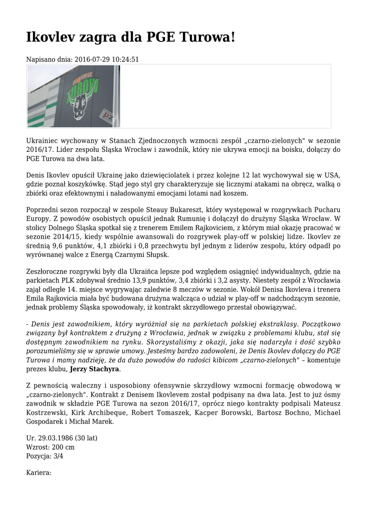 Ikovlev zagra dla PGE Turowa! Napisano dnia: 2016-07-29 10:24:51 Ukrainiec wychowany w Stanach Zjednoczonych wzmocni zespół „czarno-zielonych" w sezonie 2016/17. Lider zespołu Śląska Wrocław i zawodnik, który nie ukrywa emocji na boisku, dołączy do PGE Turowa na dwa lata. Denis Ikovlev opuścił Ukrainę jako dziewięciolatek i przez kolejne 12 lat wychowywał się w USA, gdzie poznał koszykówkę. Stąd jego styl gry charakteryzuje się licznymi atakami na obręcz, walką o zbiórki oraz efektownymi i naładowanymi emocjami lotami nad koszem. Poprzedni sezon rozpoczął w zespole Steauy Bukareszt, który występował w rozgrywkach Pucharu Europy. Z powodów osobistych opuścił jednak Rumunię i dołączył do drużyny Śląska Wrocław. W stolicy Dolnego Śląska spotkał się z trenerem Emilem Rajkoviciem, z którym miał okazję pracować w sezonie 2014/15, kiedy wspólnie awansowali do rozgrywek play-off w polskiej lidze. Ikovlev ze średnią 9,6 punktów, 4,1 zbiórki i 0,8 przechwytu był jednym z liderów zespołu, który odpadł po wyrównanej walce z Energą Czarnymi Słupsk. Zeszłoroczne rozgrywki były dla Ukraińca lepsze pod względem osiągnięć indywidualnych, gdzie na parkietach PLK zdobywał średnio 13,9 punktów, 3,4 zbiórki i 3,2 asysty. Niestety zespół z Wrocławia zajął odległe 14. miejsce wygrywając zaledwie 8 meczów w sezonie. Wokół Denisa Ikovleva i trenera Emila Rajkovicia miała być budowana drużyna walcząca o udział w play-off w nadchodzącym sezonie, jednak problemy Śląska spowodowały, iż kontrakt skrzydłowego przestał obowiązywać. - Denis jest zawodnikiem, który wyróżniał się na parkietach polskiej ekstraklasy. Początkowo związany był kontraktem z drużyną z Wrocławia, jednak w związku z problemami klubu, stał się dostępnym zawodnikiem na rynku. Skorzystaliśmy z okazji, jaka się nadarzyła i dość szybko porozumieliśmy się w sprawie umowy. Jesteśmy bardzo zadowoleni, że Denis Ikovlev dołączy do PGE Turowa i mamy nadzieję, że da dużo powodów do radości kibicom „czarno-zielonych" – komentuje prezes klubu, Jerzy Stachyra. Z pewnością waleczny i usposobiony ofensywnie skrzydłowy wzmocni formację obwodową w „czarno-zielonych". Kontrakt z Denisem Ikovlevem został podpisany na dwa lata. Jest to już ósmy zawodnik w składzie PGE Turowa na sezon 2016/17, oprócz niego kontrakty podpisali Mateusz Kostrzewski, Kirk Archibeque, Robert Tomaszek, Kacper Borowski, Bartosz Bochno, Michael Gospodarek i Michał Marek. Ur. 29.03.1986 (30 lat) Wzrost: 200 cm Pozycja: 3/4 Kariera: 2003-2005: Ellsworth (NCAA II) 2005-2007: Nevada (NCAA) 2007/2008: BC Odessa (Ukraina) 2008/2009: Ferro Zaporozhye (Ukraina) 2009-2011: Budivelnik Kijów (Ukraina) 2011/2012: Khimik Jużne (Ukraina) 2012/2013: Cherkasy Monkeys (Ukraina) 2013/2014: BC Donetsk (Ukraina) 2014/2015: WKS Śląsk Wrocław 2015: Steaua CSM EximBank Bukareszt (Rumunia) 2015/2016: WKS Śląsk Wrocław 2016- PGE Turów Zgorzelec Źródło: Biuro prasowe KKS Turów Zgorzelec S.A.