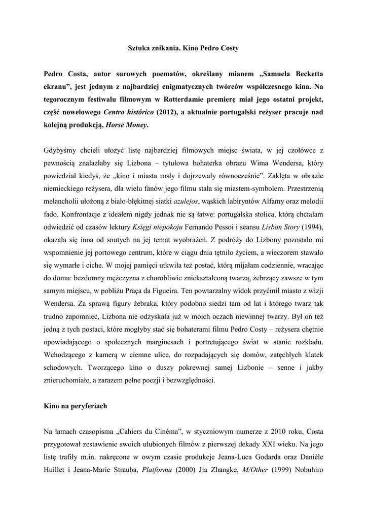 Sztuka znikania. Kino Pedro Costy Pedro Costa, autor surowych poematów, określany mianem „Samuela Becketta ekranu”, jest jednym z najbardziej enigmatycznych twórców współczesnego kina. Na tegorocznym festiwalu filmowym w Rotterdamie premierę miał jego ostatni projekt, część nowelowego Centro histórico (2012), a aktualnie portugalski reżyser pracuje nad kolejną produkcją, Horse Money. Gdybyśmy chcieli ułożyć listę najbardziej filmowych miejsc świata, w jej czołówce z pewnością znalazłaby się Lizbona – tytułowa bohaterka obrazu Wima Wendersa, który powiedział kiedyś, że „kino i miasta rosły i dojrzewały równocześnie”. Zaklęta w obrazie niemieckiego reżysera, dla wielu fanów jego filmu stała się miastem-symbolem. Przestrzenią melancholii ułożoną z biało-błękitnej siatki azulejos, wąskich labiryntów Alfamy oraz melodii fado. Konfrontacje z ideałem nigdy jednak nie są łatwe: portugalska stolica, którą chciałam odwiedzić od czasów lektury Księgi niepokoju Fernando Pessoi i seansu Lisbon Story (1994), okazała się inna od snutych na jej temat wyobrażeń. Z podróży do Lizbony pozostało mi wspomnienie jej portowego centrum, które w ciągu dnia tętniło życiem, a wieczorem stawało się wymarłe i ciche. W mojej pamięci utkwiła też postać, którą mijałam codziennie, wracając do domu: bezdomny mężczyzna z chorobliwie zniekształconą twarzą, żebrzący zawsze w tym samym miejscu, w pobliżu Praça da Figueira. Ten powtarzalny widok przyćmił miasto z wizji Wendersa. Za sprawą figury żebraka, który podobno siedzi tam od lat i którego twarz tak trudno zapomnieć, Lizbona nie odzyskała już w moich oczach niewinnej twarzy. Był on też jedną z tych postaci, które mogłyby stać się bohaterami filmu Pedro Costy – reżysera chętnie opowiadającego o społecznych marginesach i portretującego świat w stanie rozkładu. Wchodzącego z kamerą w ciemne ulice, do rozpadających się domów, zatęchłych klatek schodowych. Tworzącego kino o duszy pokrewnej samej Lizbonie – senne i jakby znieruchomiałe, a zarazem pełne poezji i bezwzględności. Kino na peryferiach Na łamach czasopisma „Cahiers du Cinéma”, w styczniowym numerze z 2010 roku, Costa przygotował zestawienie swoich ulubionych filmów z pierwszej dekady XXI wieku. Na jego listę trafiły m.in. nakręcone w owym czasie produkcje Jeana-Luca Godarda oraz Danièle Huillet i Jeana-Marie Strauba, Platforma (2000) Jia Zhangke, M/Other (1999) Nobuhiro Suwy. Wymienił też Come and Go (2003) – autotematyczny obraz João Césara Monteiro, portugalskiego filmowca nazywanego „perwersyjnym poetą kina”, którego twórczość wydaje się w pewnym sensie patronować jego dziełom. Zmarły dziesięć lat temu reżyser był ekscentrykiem i prowokatorem, genialnym samoukiem, który – tak jak Costa – funkcjonował jako autor osobny, nie należał do żadnego ruchu i trzymał się na uboczu filmowego światka. Dojrzewając w kraju rządzonym twardą ręką Antónia Salazara, Monteiro tworzył dzieła stojące w opozycji wobec jego konserwatywnych rządów – sympatyzował w nich z „niepożądanymi społecznie” jednostkami: zagubionymi artystami, prostytutkami, szaleńcami. Podobną galerię bohaterów znajdziemy w obrazach Costy, który swoje surowe, ascetyczne kadry wypełnia najczęściej postaciami z marginesów. Nieprzypadkowo też, obok ostatniego filmu Monteiro, na liście reżysera znaleźli się inni twórcy. Wspomnianej parze francuskich awangardzistów Costa złożył swoisty hołd, kręcąc quasi-biograficzny dokument Danièle Huillet/Jean-Marie Straub: Où gît votre sourire enfoui? (2001). Obraz poświęcony jest pracy reżyserskiego duetu nad filmem Sicilia! (1999), a ściślej – etapowi montażu owego dzieła. Nietrudno zauważyć, że za wymienionymi w zestawieniu nazwiskami kryje się bezkompromisowe kino i odważne estetyczne wybory, wiele mówiące także o twórczości samego Costy – chropowatej, niełatwej w odbiorze, przy pierwszym kontakcie często nużącej, przez wielu uważanej za hermetyczną. Pozornie prostej do szpiku kości, a pod rzekomą prostotą kryjącej przemyślany język filmowy i precyzyjnie wyrażaną wizję świata. Mistrz minimalistycznych przypowieści o życiu na peryferiach istnienia patrzy na rzeczywistość z perspektywy nizin społecznych, chętnie oddając głos tym, których rzadko ktoś chce wysłuchać. Fetyszyzuje życiowe zaułki i zakręty, przygląda się ciemnym zakamarkom codzienności. Jak sam wyznał w jednym z wywiadów, nie należy bowiem do twórców, którzy pragną przenosić na ekran piękno czy wzniosłe uczucia. Wręcz przeciwnie: znacznie ciekawsze jest dla niego odwrócenie romantyzmu i uczynienie go ponurym. Nawet sztuka wydaje się u niego gorzka i posępna. Tak jest choćby w jego ostatnim pełnometrażowym filmie, dokumentalnym Nie zmienia się nic (2009), w którym reżyser sportretował francuską piosenkarkę Jeanne Balibar. Utrzymany w czarno-białej tonacji obraz Costy stanowi rejestrację prób i występów artystki oraz grających z nią muzyków. Muzyczny dokument z każdą kolejną sceną zamienia się w filmowy esej – ascetyczny, hipnotyzujący i mroczny. Ze względu na głęboko realistyczną naturę oraz socjologiczne zacięcie, dzieła tego twórcy zestawia się często z nurtem Novo Cinema, który rozkwitał nad Tagiem od 1963 roku do połowy lat 70. Przedstawicielami formacji byli m.in. Fernando Lopes, Paulo Rocha i António da Cunha Telles, a kres jej rozwojowi położyła w 1974 roku rewolucja goździków. Costa przyszedł na świat kilka lat przed wybuchem tego zjawiska, w 1959 roku w Lizbonie. W trakcie studiów z zakresu historii na lizbońskim uniwersytecie rozpoczął kurs filmowy w Escola Superior de Teatro e Cinema, gdzie kształcił się pod kierunkiem m.in. takich twórców jak Alberto Seixas Santos i António Reis. Reżyserskie szlify zdob