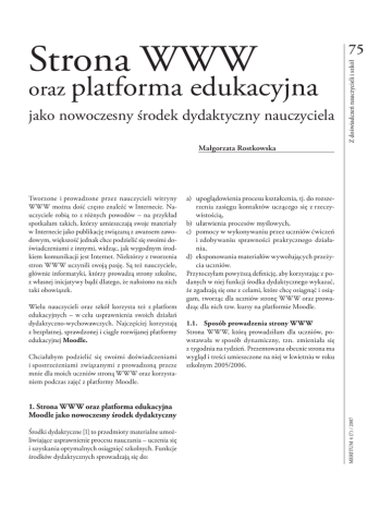 oraz platforma edukacyjna jako nowoczesny środek dydaktyczny nauczyciela Z doświadczeń nauczycieli i szkół Strona WWW 75 Małgorzata Rostkowska Wielu nauczycieli oraz szkół korzysta też z platform edukacyjnych – w celu usprawnienia swoich działań dydaktyczno-wychowawczych. Najczęściej korzystają z bezpłatnej, sprawdzonej i ciągle rozwijanej platformy edukacyjnej Moodle. Chciałabym podzielić się swoimi doświadczeniami i spostrzeżeniami związanymi z prowadzoną przeze mnie dla moich uczniów stroną WWW oraz korzystaniem podczas zajęć z platformy Moodle. 1. Strona WWW oraz platforma edukacyjna Moodle jako nowoczesny środek dydaktyczny Środki dydaktyczne [1] to przedmioty materialne umożliwiające usprawnienie procesu nauczania – uczenia się i uzyskania optymalnych osiągnięć szkolnych. Funkcje środków dydaktycznych sprowadzają się do: a) upoglądowienia procesu kształcenia, tj. do rozszerzenia zasięgu kontaktów uczącego się z rzeczywistością, b) ułatwienia procesów myślowych, c) pomocy w wykonywaniu przez uczniów ćwiczeń i zdobywaniu sprawności praktycznego działania, d) eksponowania materiałów wywołujących przeżycia uczniów. Przytoczyłam powyższą definicję, aby korzystając z podanych w niej funkcji środka dydaktycznego wykazać, że zgadzają się one z celami, które chcę osiągnąć i osiągam, tworząc dla uczniów stronę WWW oraz prowadząc dla nich tzw. kursy na platformie Moodle. 1.1. Sposób prowadzenia strony WWW Strona WWW, którą prowadziłam dla uczniów, powstawała w sposób dynamiczny, tzn. zmieniała się z tygodnia na tydzień. Prezentowana obecnie strona ma wygląd i treści umieszczone na niej w kwietniu w roku szkolnym 2005/2006. MERITUM 4 (7) / 2007 Tworzone i prowadzone przez nauczycieli witryny WWW można dość często znaleźć w Internecie. Nauczyciele robią to z różnych powodów – na przykład spotkałam takich, którzy umieszczają swoje materiały w Internecie jako publikację związaną z awansem zawodowym, większość jednak chce podzielić się swoimi doświadczeniami z innymi, widząc, jak wygodnym środkiem komunikacji jest Internet. Niektórzy z tworzenia stron WWW uczynili swoją pasję. Są też nauczyciele, głównie informatyki, którzy prowadzą strony szkolne, z własnej inicjatywy bądź dlatego, że nałożono na nich taki obowiązek. Z doświadczeń nauczycieli i szkół 76 Rysunek 1. Strona główna mojej strony WWW. MERITUM 4 (7) / 2007 Stronę tę – http://mrostkow.home.staszic.waw.plm – zaczęłam prowadzić w roku szkolnym 2002/2003. Wówczas uczyłam dwie pierwsze klasy informatyczne nowego liceum oraz klasę IV, także informatyczną, starego liceum. Poza tym zgłaszali się do mnie uczniowie innych klas maturalnych w związku z maturą z informatyki. Klasy pierwsze w pierwszym semestrze uczyły się głównie algorytmiki i programowania, zaś w drugim ich głównym zadaniem było tworzenie własnych edukacyjnych stron WWW. Zawartość merytoryczna strony stale się zmieniała, dochodziły ciągle nowe treści. Pewne tematy z początku roku szkolnego musiały zostać przesunięte w stosunku do tych, które były aktualne pod koniec roku szkolnego. Np. pokazy z algorytmiki były w pewnym czasie na początku witryny – jako najbardziej aktualne – potem zostały przesunięte; odnośnik do strony WSiP-u z wymaganiami dla absolwentów gimnazjów, od czego zaczęłam zajęcia z pierwszymi klasami, został potem przesunięty do pomocy do zajęć. Pod względem graficznym strona jest bardzo skromna i poza słoniem na szczęście nie ma na niej żadnych atrakcji wizualnych. Patrząc od strony technicznej, jest pisana głównie w HTML-u, ale są również fragmenty tworzone w różnych edytorach, a nawet jedna strona utworzona w Wordzie i zapisana w HTML-u. Miało to cel dydaktyczny – chciałam pokazać uczniom różnice w źródle strony tak stworzonej od tej napisanej w Notatniku i przekonwertowanej na HTML. Stronę o komputerach i sieci XIV LO stworzyłam w taki sposób, aby pokazać i poćwiczyć z uczniami zasadność stosowania kaskadowych arkuszy styli podczas tworzenia stron WWW. Wiele materiałów jest dołączonych do strony po prostu jako prezentacje w PowerPoincie lub dokumenty Worda. 1.2. Cele i korzyści prowadzenia strony WWW dla uczniów 1) Uczniowie mają zawsze dostępne materiały do lekcji, a nauczyciel nie musi nic drukować ani nagrywać. W prezentacjach z algorytmiki, które zostały umieszczone jako prezentacje w PowerPoincie, w notatkach zostały jeszcze umieszczone dodatkowe wyjaśnienia dla ucznia, który zechce pobrać tę prezentację. Ponieważ większość moich uczniów ma dostęp do Internetu w domu, 77 Z doświadczeń nauczycieli i szkół jakie będą kryteria oceniania. Już od napisania pierwszego scenariusza własnej strony uczniowie musieli go opublikować pod swoim adresem. Ja miałam utworzone linki do witryn uczniów i po każdych zajęciach, na których oni tworzyli strony i umieszczali pliki na kontach, mogłam sprawdzać, co zrobili i jaki jest postęp ich pracy. Mogłam także na lekcji od razu zgłaszać uczniom uwagi związane z ich pracą. Uczniowie mieli również łatwy sposób sięgania do stron kolegów i ewentualnego podpatrywania tego, co robią inni. Nie bez znaczenia jest też fakt, że nie nastąpiło zgubienie przez uczniów plików, nad którymi pracowali, gdyż zawsze aktualne były na ich koncie na serwerze. Na zakończenie projektu, gdy nastąpiło wzajemne sprawdzanie stron przez uczniów, było dla wszystkich wygodne, że są one dostępne w jednym miejscu. Wszyscy uczniowie skorzystali również z zaproponowanego przeze mnie schematu prezentacji własnej strony przed klasą. 1.3. Dlaczego, nie rezygnując ze strony WWW, zaczęłam prowadzić zajęcia na Moodle? Widziałam już od dłuższego czasu, że z platform edukacyjnych korzysta coraz więcej szkół i nauczycieli. Prowadząc stronę WWW dla uczni