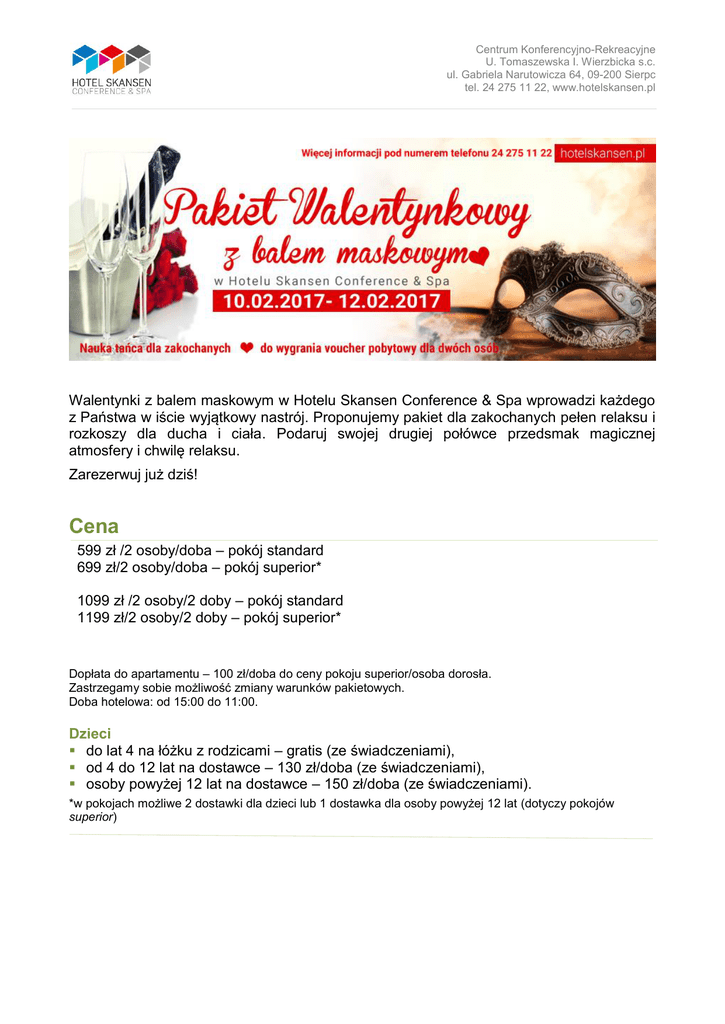 Centrum Konferencyjno-Rekreacyjne U. Tomaszewska I. Wierzbicka s.c. ul. Gabriela Narutowicza 64, 09-200 Sierpc tel. 24 275 11 22, www.hotelskansen.pl Walentynki z balem maskowym w Hotelu Skansen Conference & Spa wprowadzi każdego z Państwa w iście wyjątkowy nastrój. Proponujemy pakiet dla zakochanych pełen relaksu i rozkoszy dla ducha i ciała. Podaruj swojej drugiej połówce przedsmak magicznej atmosfery i chwilę relaksu. Zarezerwuj już dziś! Cena 599 zł /2 osoby/doba – pokój standard 699 zł/2 osoby/doba – pokój superior* 1099 zł /2 osoby/2 doby – pokój standard 1199 zł/2 osoby/2 doby – pokój superior* Dopłata do apartamentu – 100 zł/doba do ceny pokoju superior/osoba dorosła. Zastrzegamy sobie możliwość zmiany warunków pakietowych. Doba hotelowa: od 15:00 do 11:00. Dzieci do lat 4 na łóżku z rodzicami – gratis (ze świadczeniami), od 4 do 12 lat na dostawce – 130 zł/doba (ze świadczeniami), osoby powyżej 12 lat na dostawce – 150 zł/doba (ze świadczeniami). *w pokojach możliwe 2 dostawki dla dzieci lub 1 dostawka dla osoby powyżej 12 lat (dotyczy pokojów superior) Centrum Konferencyjno-Rekreacyjne U. Tomaszewska I. Wierzbicka s.c. ul. Gabriela Narutowicza 64, 09-200 Sierpc tel. 24 275 11 22, www.hotelskansen.pl Pakiet obejmuje: Pobyt w przestronnych, klimatyzowanych pokojach z łazienką, TV; Śniadania bufetowe, Obiadokolacje bufetowe*. Disco z karaoke, Bal maskowy dla zakochanych z nagrodą* Nauka tańca dla zakochanych, Nieograniczony dostęp do strefy basenowej, strefy sauny suchej, łaźni parowej oraz do słonecznej łączki, Możliwość nieodpłatnego korzystania z konsoli XBOX ONE, Dostęp do pokoju zabaw dla najmłodszych, Internet bezprzewodowy *Nagroda: Voucher na dwudniowy pobyt w Hotelu Skansen dla najlepiej przebranej pary Dodatkowo płatne *Dla Niej/ Dla Niego: Możliwość wykupienia masażu, zabiegów kosmetycznych i relaksacyjnych z kieliszkiem wina musującego. *Dla Nich: Masaż dla dwojga, Zabiegi kosmetyczno- relaksacyjne z kieliszkiem wina musującego. Parking 20/samochód/ doba możliwość gry w kręgle, bilard, cymbergaj, wypożyczalnia rowerów oraz gokartów dla dzieci, zabiegi odnowy biologicznej oraz szeroki wybór masaży*, za symboliczną opłatą istnieje możliwość przejazdu wozem po terenie Muzeum Wsi Mazowieckiej w Sierpcu, zwiedzanie Muzeum Wsi Mazowieckiej w Sierpcu z przewodnikiem*, i wiele innych. * obowiązuje uprzednia rezerwacja. Informacje dostępne przy dokonywaniu rezerwacji. *Hotel zastrzega sobie możliwość zmiany cen pakietowych bez konieczności powiadomienia gości o takowej zmianie oraz wykluczenia z oferty niektórych terminów w przypadku braku dostępności miejsc noclegowych. *Hotel zastrzega sobie możliwość zmiany agendy w trakcie trwania pakietu „Przedstawiona oferta cenowa ma charakter informacyjny, nie stanowi oferty handlowej w rozumieniu Art.66 par.1 Kodeksu Cywilnego” Serdecznie zapraszamy do skorzystania z oferty rezerwacje indywidualne tel. 24 275 11 22 [email protected] rezerwacje grupowe tel. 24 275 11 22 [email protected]