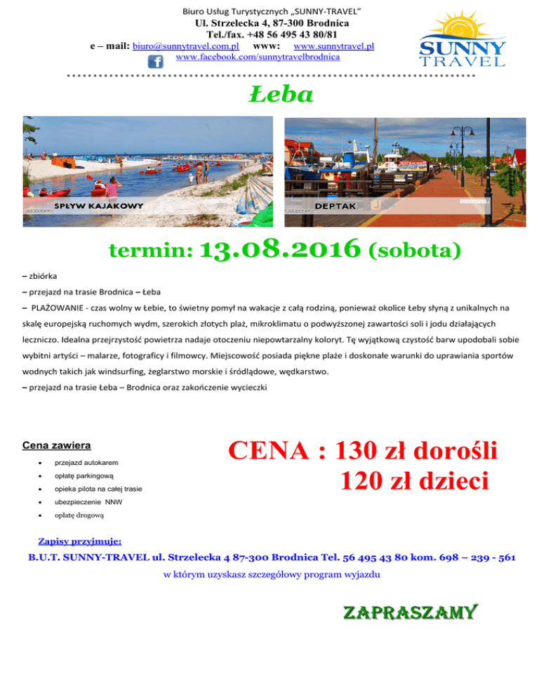 Biuro Usług Turystycznych „SUNNY-TRAVEL” Ul. Strzelecka 4, 87-300 Brodnica Tel./fax. +48 56 495 43 80/81 e – mail: [email protected] www: www.sunnytravel.pl www.facebook.com/sunnytravelbrodnica ***************************************************************************** Łeba termin: 13.08.2016 (sobota) – zbiórka – przejazd na trasie Brodnica – Łeba – PLAŻOWANIE - czas wolny w Łebie, to świetny pomył na wakacje z całą rodziną, ponieważ okolice Łeby słyną z unikalnych na skalę europejską ruchomych wydm, szerokich złotych plaż, mikroklimatu o podwyższonej zawartości soli i jodu działających leczniczo. Idealna przejrzystość powietrza nadaje otoczeniu niepowtarzalny koloryt. Tę wyjątkową czystość barw upodobali sobie wybitni artyści – malarze, fotograficy i filmowcy. Miejscowość posiada piękne plaże i doskonałe warunki do uprawiania sportów wodnych takich jak windsurfing, żeglarstwo morskie i śródlądowe, wędkarstwo. – przejazd na trasie Łeba – Brodnica oraz zakończenie wycieczki Cena zawiera przejazd autokarem opłatę parkingową opieka pilota na całej trasie ubezpieczenie NNW opłatę drogową CENA : 130 zł dorośli 120 zł dzieci Zapisy przyjmuje: B.U.T. SUNNY-TRAVEL ul. Strzelecka 4 87-300 Brodnica Tel. 56 495 43 80 kom. 698 – 239 - 561 w którym uzyskasz szczegółowy program wyjazdu ZAPRASZAMY
