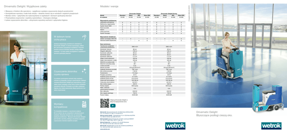 • • • • • Modele i wersje Maszyna z fotelem dla operatora – wyjątkowo wydajne czyszczenie dużych powierzchni Kompaktowe wymiary i małe koło skrętu – idealnie mieści się w windach i wąskich przejściach Bardzo cicha – optymalna do wykorzystania w szpitalach i domach spokojnej starości Przemyślana ergonomia i czytelny wyświetlacz – intuicyjna obsługa Łatwe czyszczenie zbiornika – utrzymanie wysokiej wartości i optymalna higiena W dobrym tonie: cicha praca Izolacja zasysanego powietrza to standard w Drivematic Delight. A zestaw wyciszający ‚Silent Kit‘ jest bardzo przydatnym dodatkiem. Pozwala bowiem jeszcze bardziej obniżyć emisję hałasu maszyny – to duża zaleta szczególnie w szpitalach i domach spokojnej starości. Czyszczenie zbiornika: czysta sprawa U podstaw zachowania wartości leży czystość – również w przypadku maszyn czyszczących. Dlatego maszyna Drivematic Delight jest wyposażona w specjalny otwór rewizyjny, przez który można dokładnie wyczyścić zbiornik. Pozwala to nie tylko zwiększyć higienę, lecz także gwarantuje długą żywotność maszyny czyszczącej. Model Nr artykułu Standard 50.092 Drivematic Delight Silent SDL 50.093 50.094 Wyposażenie podstawowe Ładowarka wewnętrzna Elektryczny napęd jezdny System Quick Refill Panel szczotek Ssawa Listwy gumowe System dozujący – – Wyposażenie dodatkowe Zestaw wyciszający Silent Kit Obrotowe światło bezpieczeńst. – – – Dane techniczne Teoretyczna wydajność czyszczenia powierzchni Szerokość robocza Długość całkowita Szerokość całkowita Szerokość ssania Wysokość całkowita Waga (z akumulatorami) Waga (z akumulatorami i wodą) Zbiornik na czystą wodę Zbiornik na brudną wodę Liczba szczotek Nacisk szczotek Prędkość obrotowa szczotek Moc silnika szczotek Podciśnienie Przepływ powietrza Prędkość jazdy do przodu Prędkość jazdy do tyłu Pojemność akumulatora Czas pracy akumulatora Moc turbiny ssącej Rodzaj napędu Maks. zdolność pokonywania wzniesień Moc całkowita Moc napędu jezdnego Poziom hałasu – – Silent SDL 50.095 Standard 50.096 Drivematic Delight Dosing Silent SDL Silent SDL 50.097 50.098 50.099 © Copyright by Wetrok AG, 05/2015 Drivematic Delight: Wyjątkowe zalety – – – – – 3960 m2/h 3960 m2/h 66 cm 138 cm 68 cm 85 cm 117 cm 335 kg 405 kg 70 l 80 l 2 szt. 40 kg (0,36 N/cm2) 180 1/min 1100 W 110 mbar 32 l/s 0-7 km/h 0-2,5 km/h 105/180 Ah do 3,5 h 350 W Silnik jazdy 66 cm 138 cm 68 cm 85 cm 117 cm 335 kg 405 kg 70 l 80 l 2 szt. 40 kg (0,36 N/cm2) 180 1/min 1100 W 110 mbar 32 l/s 0-7 km/h 0-2,5 km/h 105/180 Ah do 3,5 h 350 W Silnik jazdy 12% 12% 2240 W 750 W 63/59 dB 2240 W 750 W 63/59 dB Obejrzyj Drivematic Delight w akcji na naszej stronie www. Wymiary: kompaktowe Ta niewielka maszyna o szerokości jedynie 85 cm mieści się we wszystkich standardowych windach. Również obszary kas nie sprawiają żadnych problemów. Maszyna Drivematic Delight jest bardzo zwrotna, dlatego umożliwia wygodne czyszczenie również wąskich przejść. Wetrok AG Steinackerstrasse 62, CH-8302 Kloten/SZWAJCARIA Tel. +41 43 255 51 51, faks +41 43 255 53 79 Wetrok Austria GmbH Kolpingstrasse 18, A-1230 Wien/AUSTRIA Tel. 0800 20 48 68, faks 0800 20 48 78 Wetrok GmbH Maybachstrasse 35, D-51381 Leverkusen/NIEMCY Tel. +49 2171 398-0, faks +49 2171 398-100 Wetrok Polska S.A. ul. Łączyny 4, PL-02-820 Warszawa Tel. +48 22 331 20 50, faks +48 22 331 20 60 Wetrok AB Bergkällavägen 32, SE-192 79 Sollentuna/SZWECJA Tel. +46 8 444 34 00, faks +46 8 444 34 01 www.wetrok.com Drivematic Delight Błyszczące podłogi cieszą oko. Drivematic Delight: Inteligentna technika, przyjemna praca. Pracownicy są zadowoleni z intuicyjnej obsługi, a szefowie z większej wydajności i szybszej pracy. Drivematic Delight pozwala jeszcze szybciej i dokładniej wyczyścić duże powierzchnie. Kompaktowe wymiary i małe koło skrętu zapewniają uniwersalne zastosowanie – również łatwy wjazd do windy i sprzątanie przy kasach. Ergonomiczne siedzenie umożliwia szybkie rozpoczęcie pracy – bez zmiany jakichkolwiek ustawień. Ergonomia: korzyści dla wszystkich. Wyświetlacz: po prostu logiczny Ready, steady, go – tak działa Drivematic Delight. Wyświetlacz naszej maszyny jest absolutnie intuicyjny i łatwy w obsłudze z tylko kilkoma przyciskami. Użytkownik po prostu wsiada, zapina pas i rozpoczyna pracę. System dozujący: ważna jest właściwa mieszanka 1,65 m Koło skrętu Perfekcyjna ergonomia – jedna z głównych zalet maszyny Drivematic Delight. Maszyna wyróżnia się niskim poziomem wejścia, obszernym miejscem na nogi i wygodnym siedzeniem, które niezależnie od wzrostu użytkownika gwarantuje optymalną pozycję podczas pracy. To wygodne i naprawdę praktyczne rozwiązanie. 12% różnicy poziomów Inteligentne oszczędzanie – dzięki optymalnemu systemowi dozującemu. Wyróżnia się jakością i w pełni zautomatyzowaną pracą. Dodatkowo pozwala również oszczędzać wodę i środki chemiczne – i to każdego dnia. To jasne: system dozujący się opłaca. Pod względem ekologii i własnego budżetu. System quick-refill: wygodne napełnianie zbiornika wodą Wyjątkowo komfortowy i praktyczny – dzięki systemowi quickrefill i wbudowanemu złączu do węża maszynę Drivematic Delight można napełniać zwykłym wężem ogrodowym. Po napełnieniu zbiornika na czystą wodę o pojemności 70 litrów następuje automatyczne zatrzymanie dopływu wody. 5 sekund Bardzo zwrotna Wyjątkowo małe koło skrętu pozwala na bardzo szybką i sprawną pracę. Również w wąskich pomieszczeniach i korytarzach skręcanie nie sprawia problemu. Ciasne przejścia i szerokie powierzchnie, korytarze czy piwnice z narożnikami i rampami: Drivematic Delight nadaje się do każdego pomieszczenia. Wzniesienia: zawsze w górę Rampy, wzniesienia, podejścia – Drivematic Delight potrafi to, z czym nie radzą sobie inne maszyny. Ma ona bowiem do