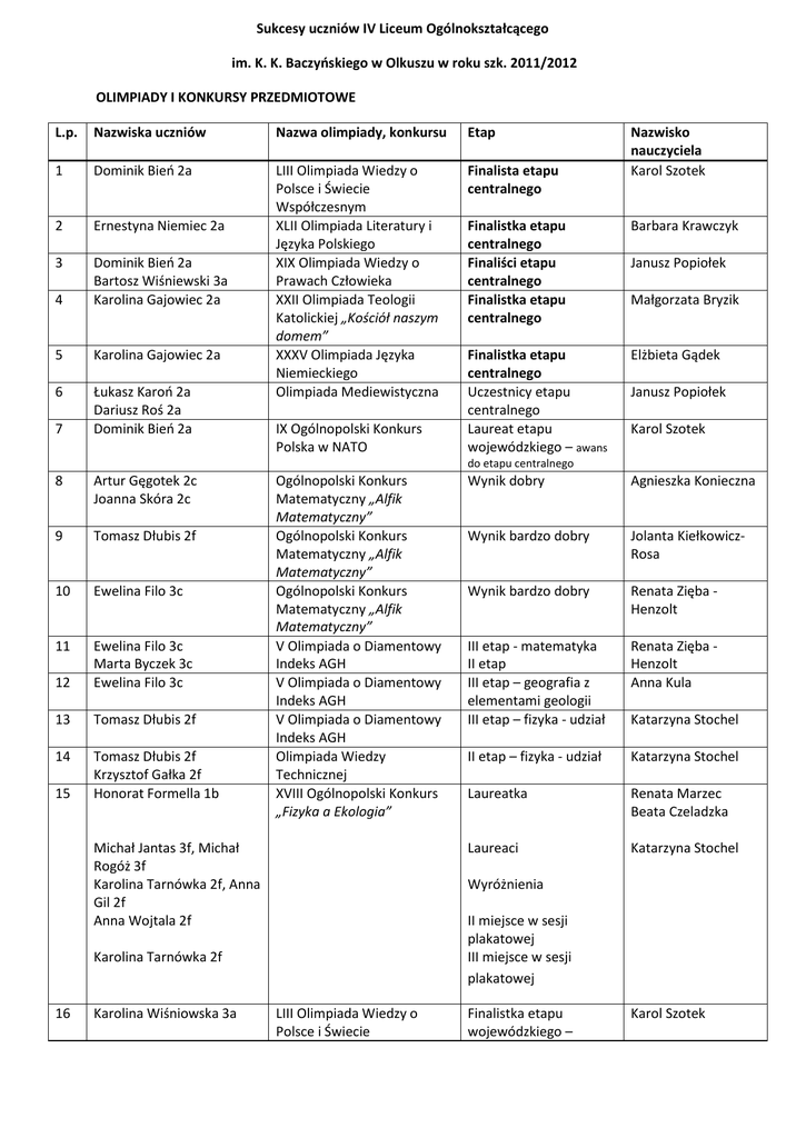 Sukcesy uczniów IV Liceum Ogólnokształcącego im. K. K. Baczyńskiego w Olkuszu w roku szk. 2011/2012 OLIMPIADY I KONKURSY PRZEDMIOTOWE L.p. Nazwiska uczniów Nazwa olimpiady, konkursu Etap 1 Dominik Bień 2a Finalista etapu centralnego 2 Ernestyna Niemiec 2a 3 4 Dominik Bień 2a Bartosz Wiśniewski 3a Karolina Gajowiec 2a 5 Karolina Gajowiec 2a 6 Łukasz Karoń 2a Dariusz Roś 2a Dominik Bień 2a LIII Olimpiada Wiedzy o Polsce i Świecie Współczesnym XLII Olimpiada Literatury i Języka Polskiego XIX Olimpiada Wiedzy o Prawach Człowieka XXII Olimpiada Teologii Katolickiej „Kościół naszym domem” XXXV Olimpiada Języka Niemieckiego Olimpiada Mediewistyczna 7 IX Ogólnopolski Konkurs Polska w NATO Nazwisko nauczyciela Karol Szotek Finalistka etapu centralnego Finaliści etapu centralnego Finalistka etapu centralnego Barbara Krawczyk Finalistka etapu centralnego Uczestnicy etapu centralnego Laureat etapu wojewódzkiego – awans Elżbieta Gądek Janusz Popiołek Małgorzata Bryzik Janusz Popiołek Karol Szotek do etapu centralnego 8 Artur Gęgotek 2c Joanna Skóra 2c 9 Tomasz Dłubis 2f 10 Ewelina Filo 3c 11 12 Ewelina Filo 3c Marta Byczek 3c Ewelina Filo 3c 13 Tomasz Dłubis 2f 14 Tomasz Dłubis 2f Krzysztof Gałka 2f Honorat Formella 1b 15 Ogólnopolski Konkurs Matematyczny „Alfik Matematyczny” Ogólnopolski Konkurs Matematyczny „Alfik Matematyczny” Ogólnopolski Konkurs Matematyczny „Alfik Matematyczny” V Olimpiada o Diamentowy Indeks AGH V Olimpiada o Diamentowy Indeks AGH V Olimpiada o Diamentowy Indeks AGH Olimpiada Wiedzy Technicznej XVIII Ogólnopolski Konkurs „Fizyka a Ekologia” Michał Jantas 3f, Michał Rogóż 3f Karolina Tarnówka 2f, Anna Gil 2f Anna Wojtala 2f Karolina Wiśniowska 3a Agnieszka Konieczna Wynik bardzo dobry Jolanta KiełkowiczRosa Wynik bardzo dobry Renata Zięba Henzolt III etap - matematyka II etap III etap – geografia z elementami geologii III etap – fizyka - udział Renata Zięba Henzolt Anna Kula II etap – fizyka - udział Katarzyna Stochel Laureatka Renata Marzec Beata Czeladzka Laureaci Katarzyna Stochel Katarzyna Stochel Wyróżnienia II miejsce w sesji plakatowej III miejsce w sesji plakatowej Karolina Tarnówka 2f 16 Wynik dobry LIII Olimpiada Wiedzy o Polsce i Świecie Finalistka etapu wojewódzkiego – Karol Szotek Współczesnym 17 18 Dominika Świeboda 2a Bartosz Wiśniewski 3a Karolina Gajowiec 2a 19 Karolina Gajowiec 2a 20 Łukasz Karoń 2a Dagmara Bobak 2a Dariusz Roś 2a Honorata Formella 1b XXVIII Olimpiada Historyczna Michał Kądziołka 3e Filip Terlecki 3e Maria Maj 3f Szymon Bień 2e Maciej Kocjan 2e Agnieszka Kyzioł 2e Olimpiada Biologiczna Agnieszka Kyzioł 2e Szymon Bień 2e Maciej Kocjan 2e Małgorzata Zięba 2e Aleksandra Lach 2f Anna Malinowska 2a Wioletta Spolankiewicz 2a Anna Malinowska 2a Sebastian Gorgoń 2b Wojewódzki Konkurs Chemiczny 21 22 23 24 25 26 27 28 29 Karolina Gajowiec 2a Dagmara Bobak 2a Katarzyna Śliwka 2a 30 Piotr Gorynowicz 1a Karol Piłka 2b Maksymilian Pilch 3a 31 Bartosz Wiśniewski 3a Karolina Gajowiec 2a Karol Piłka 2b 32 Maja Kubat 3b Monika Koch 3c Emilia Kuźniak 3b Michał Rogóż 3f Kajetan Oleksy 3g Maria Kamionka 2e, Monika Koch 3c, Paulina Haberka 3d, Katarzyna Chwast 3e, Tomasz Dłubis 3f 33 XIX Olimpiada Wiedzy o Prawach Człowieka Ogólnopolski konkurs Historyczny „ PRL krajem stanu wyjątkowego” XXVIII Olimpiada Historyczna Uczestniczka etapu centralnego Laureaci etapu wojewódzkiego Laureat II miejsce w etapie centralnym Janusz Popiołek Janusz Popiołek Laureat etapu wojewódzkiego Finaliści etapu wojewódzkiego Janusz Popiołek Finalistka etapu wojewódzkiego Finaliści etapu okręgowego Finaliści etapu okręgowego Barbara Krawczyk Finalistka etapu okręgowego Wyróżnienia Beata Czeladzka Wojewódzki Konkurs Chemiczny XVIII Sesja Sejmu Dzieci i Młodzieży Ogólnopolski konkurs Historia i Kultura Żydów Polskich Ogólnopolski konkurs Historia i Kultura Żydów Polskich Finalistki Michalina Gajowiec Posłanki – finalistki Karol Szotek Wyróżnienia na etapie centralnym Janusz Popiołek Finaliści etapu centralnego Janusz Popiołek IV Olimpiada Tematyczna „Losy żołnierza i dzieje oręża polskiego w latach 17681864. Za wolność Waszą i naszą” Ogólnopolski konkurs „W kalejdoskopie pamięci – Polska i Polacy w latach 1939-1989. W kraju czy poza krajem? Dylematy Polaków” VI Rajd Szlakami Żołnierzy Wyklętych mjr. Józefa Kurasia „Orła”, „Ognia” szlakiem 5 kampanii „Skały” Etap wojewódzki 17m, 13m, 21m Michał Masłowski II etap Michał Masłowski I miejsce Michał Masłowski XX Ogólnopolskie Mistrzostwa Pierwszej Pomocy Polskiego Czerwonego Krzyża I miejsce – etap wojewódzki Michał Masłowski Olimpiada Filozoficzna Olimpiada Biologiczna Olimpiada Ekologiczna Janusz Popiołek Anna Żuber Beata Czeladzka Michalina Gajowiec 34 35 Filip Kwinta 3f, Paulina Haberka 3d, Ewelina Gąsior 2e, Kinga Grzywa b i Tomasz Dłubis 2f Maciej Kocjan 2e, Violeta Bac 2a Tymoteusz Hagno 3d, Anna Jantas 2c 36 Tymoteusz Hagno 3d, Violeta Bac 1c 37 Saratowicz Gabriel 1f, Gorynowicz Piotr 1a, Palska Aleksandra 1a, Grzywa Kinga 2b, Bryła Przemysław 1f, Damian Trzaska 1a, Smentek Marcin 2a, Cupiał Kamil 1a Tomasz Dłubis 2f, Wioleta Spolankiewicz 2a, Katarzyna Śliwka 2a, Dominika Świeboda 2a, Karol Piłka 2b , Magda Kolczyk 1e, Radosław Brodowski 1e, Michał Brożek 2f, Sebastian Gorgoń 2b Maja Kubat 3b, Wojciech Kowalski 3b, Bartosz Wiśniewski 3a, Magdalena Głowadzka 3b, Kajetan Oleksy 3g, Monika Koch 3c, Michał Kądziołka 3e Dagmara Bobak 3a Iwetta Tyńska 1a Anna Malinowska 2a Honorata Formella 1b Katarzyna Śliwka 2a Monika Koch 3c 38 39 40 41 42 43 44 Katarzyna Chwast 2e, Maciej Kocjan 2e Marcin Smentek 2e, Anna Roś 2e, Kinga Matusiak 2b 45 Kinga Matusiak 2b XX Ogólnopolskie Mistrzostwa Pierwszej Pomocy Polskiego Czerwonego Krzyża L Finał Ogólnopolskiego Konkursu Marynistycznego „Polska Marynarka Wojenna a Historia 