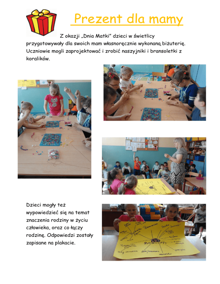 Prezent dla mamy Z okazji „Dnia Matki” dzieci w świetlicy przygotowywały dla swoich mam własnoręcznie wykonaną biżuterię. Uczniowie mogli zaprojektować i zrobić naszyjniki i bransoletki z koralików. Dzieci mogły też wypowiedzieć się na temat znaczenia rodziny w życiu człowieka, oraz co łączy rodzinę. Odpowiedzi zostały zapisane na plakacie.