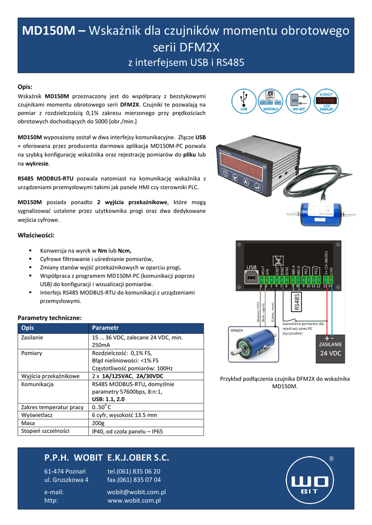 MD150M – Wskaźnik dla czujników momentu obrotowego serii DFM2X z interfejsem USB i RS485 Opis: Wskaźnik MD150M przeznaczony jest do współpracy z bezstykowymi czujnikami momentu obrotowego serii DFM2X. Czujniki te pozwalają na pomiar z rozdzielczością 0,1% zakresu mierzonego przy prędkościach obrotowych dochodzących do 5000 [obr./min.] MD150M wyposażony został w dwa interfejsy komunikacyjne. Złącze USB + oferowana przez producenta darmowa aplikacja MD150M-PC pozwala na szybką konfigurację wskaźnika oraz rejestrację pomiarów do pliku lub na wykresie. RS485 MODBUS-RTU pozwala natomiast na komunikację wskaźnika z urządzeniami przemysłowymi takimi jak panele HMI czy sterowniki PLC. MD150M posiada ponadto 2 wyjścia przekaźnikowe, które mogą sygnalizowad ustalone przez użytkownika progi oraz dwa dedykowane wejścia cyfrowe. Właściwości: Konwersja na wynik w Nm lub Ncm, Cyfrowe filtrowanie i uśrednianie pomiarów, Zmiany stanów wyjśd przekaźnikowych w oparciu progi, Współpraca z programem MD150M-PC (komunikacji poprzez USB) do konfiguracji i wizualizacji pomiarów. Interfejs RS485 MODBUS-RTU do komunikacji z urządzeniami przemysłowymi. Parametry techniczne: Opis Zasilanie Pomiary Wyjścia przekaźnikowe Komunikacja Zakres temperatur pracy Wyświetlacz Masa Stopieo szczelności Parametr 15 … 36 VDC, zalecane 24 VDC, min. 250mA Rozdzielczośd: 0,1% FS, Błąd nieliniowości: <1% FS Częstotliwośd pomiarów: 100Hz 2 x 1A/125VAC, 2A/30VDC RS485 MODBUS-RTU, domyślnie parametry 57600bps, 8:n:1, USB: 1.1, 2.0 o 0..50 C 6 cyfr, wysokośd 13.5 mm 200g IP40, od czoła panelu – IP65 P.P.H. WOBIT E.K.J.OBER S.C. 61-474 Poznao ul. Gruszkowa 4 tel.(061) 835 06 20 fax.(061) 835 07 04 e-mail: http: [email protected] www.wobit.com.pl Przykład podłączenia czujnika DFM2X do wskaźnika MD150M.