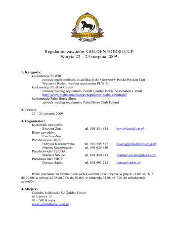 Regulamin zawodów GOLDEN HORSE CUP Koryta 22 – 23 sierpnia 2009 1. Kategoria: konkurencje PLWiR: zawody ogólnopolskie, kwalifikacje do Mistrzostw Polski Polskiej Ligi Western i Rodeo, według regulaminu PLWiR konkurencje PLQHA Circuit: zawody według regulaminu Polish Quarter Horse Association Circuit http://www.plqha.com/images/regulamin-plqha-circuit.pdf konkurencje Paint Horse Show: zawody według regulaminu Paint Horse Club Poland 2. Termin: 22 – 23 sierpnia 2009 3. Organizator: Kierownik zawodów: Ewelina Zoń Biuro zawodów: Ewelina Zoń Przedstawiciel stajni: Patrycja Kaczorowska Marcin Kaczorowski Przedstawiciel PLQHA: Mariusz Siwiec Przedstawiciel PHCP: Dariusz Sańko tel. 503 834 654 [email protected] tel. 502 545 577 tel. 501 625 430 [email protected] tel. 601 450 913 [email protected] tel. 602 691 212 [email protected] Biuro zawodów na terenie ośrodka KJ GoldenHorse, czynne w piątek 21.08 od 16.00 do 20.00, w sobotę 22.08 od 7.00 do 20.00 i w niedzielę 23.08 od 7.00 do zakończenia zawodów. 4. Miejsce: Ośrodek Jeździecki KJ Golden Horse ul. Lipowa 13 05 – 505 Koryta www.goldenhorse.com.pl 5. Warunki techniczne: arena zewnętrzna 40x90, rozprężania w hali 30x70, 6. Sędziowie zawodów: Sędziowie: Ring Stewardzi: Agnieszka Staniszewska-Bakuła, Aleksandra Misztak Michał Dobrowolski, Zbigniew Dąbrowski 7. Uczestnicy: zawody kwalifikacyjne PLWiR: a) zawodnicy PLWiR z opłaconą składką członkowską za rok 2009, b) zawodnicy niepełnoletni dopuszczeni zostaną do zawodów na podstawie pisemnej zgody rodziców lub opiekunów, c) zawodnicy są zobowiązani posiadać swoje numery startowe Uwaga! Juniorzy w konkurencjach barrel racing i pole bending zobowiązani są do startowania w kaskach i kamizelkach ochronnych. konkurencje PLQHA Circuit: a) członkowie Polish Quarter Horse Association b) konie rasy American Quarter Horse c) zawody według przepisów American Quarter Horse Association oraz regulaminu PLQHA http://www.plqha.com/images/regulamin-plqha-circuit.pdf konkurencje Paint Horse Show: a) konie rasy American Paint Horse 7. Konkurencje: konkurencje kwalifikacyjne do Mistrzostw Polski Polskiej Ligi Western i Rodeo: * Reining (dzieci, junior, amator, open, młode konie) * Western Pleasure (dzieci, junior, amator, open) * Western Horsemanship (dzieci, junior) * Trail (dzieci, junior, amator, open) * Western Riding (open) * Superhorse (open) * Barrel Racing (junior, open) * Pole Bending (junior, open) konkurencje w ramach Polish Quarter Horse Association Circuit: * Reining PLQHA (youth, open) * Western Pleasure PLQHA (youth, open) * Trail PLQHA (youth, open) * Western Horsemanship PLQHA (youth) Paint Horse Show: * klasy halter Rozegrany zostanie również Freestyle Reining o puchar Stowarzyszenia Western Riders. 8. Program zawodów: Sobota 22 sierpnia – rozpoczęcie zawodów o godzinie 9:00 * Trail dzieci * Trail junior * Superhorse open * Western Pleasure amator * Western Pleasure open * Western Pleasure PLQHA * Western Horsemanship dzieci * Paint Horse Show * Reining dzieci * Reining junior * Reining PLQHA * Barrel Racing junior * Barrel Racing open * Free Style Reining Na zakończenie dnia, około godziny 20:00 impreza integracyjna Niedziela 23 sierpnia – rozpoczęcie zawodów o godzinie 9:00 * Trail amator * Trail open * Trail PLQHA * Western Riding open * Paint Horse Show * Western Pleasure dzieci * Western Pleasure junior * Western Horsemanship junior * Western Horsemanship PLQHA * Reining amator * Reining młode konie * Reining open * Pole Bending junior * Pole Bending open Wręczenie nagród nastąpi bezpośrednio po każdej konkurencji. Organizator zastrzega sobie możliwość zmian w programie. 9. Opłaty: konkurencje kwalifikacyjne PLWiR: * wpisowe 50 zł od pary zawodnik/koń * startowe 40 zł od pary za konkurencję (juniorzy 20 zł) konkurencje PLQHA Circuit: * startowe 40 zł od pary za konkurencję (juniorzy 20 zł) konkurencje Paint Horse Show: * bez opłat Free Style Reining: * startowe 40 zł 10. Nagrody i Sponsorzy: * Starostwo Powiatowe w Piasecznie – patronat honorowy nad zawodami objęli Przewodnicząca Rady Powiatu Piaseczyńskiego Pani Barbara Rudzińska-Mękal oraz Starosta Pieseczyński Pan Jan Adam Dąbek * Gmina Prażmów – Wójt Gminy Prażmów Pan Sylwester Puchała * Stowarzyszenie Western Riders * Zakład Przetwórstwa Tworzyw Sztucznych ZPTS * Bank BGŻ * Etmika – www.horseseurope.com * Hipovet – www.hipovet.com * Animalia – www.animalia.pl * Kurier Południowy * Agencja Reklamowo Wydawnicza Graf Łączna pula nagród wynosi 25000 zł Pula nagród w PLQHA Circuit wynosi 1000 zł Dla zwycięzców przewidziano pamiątkowe puchary i floot’s. Patronami medialnymi imprezy są: Warszawski Ośrodek Telewizyjny WOT, TVN Warszawa, Radio Euro, Kurier Południowy 11. Boksy dla koni: Boksy w cenie 100zł/dzień dostępne od czwartku 20.08, w cenę wliczone podściółka (słoma) i woda. Możliwość zakupu siana w cenie 10zł/kostka. 12. Wymagane dokumenty koni: paszport + aktualne szczepienia, w zgłoszeniach do PLQHA Circuit – AQHA Certificate Of Registration, juniorzy – zgoda opiekuna 13. Opieka weterynaryjna i kowalska: dostępna na telefon 14. Zgłoszenia: Zgłoszenia prosimy nadsyłać mailem do Eweliny Zoń, tel. 503 834 654, e-mail [email protected] Termin nadsyłania zgłoszeń upływa 17 sierpnia 2009. Za zgłoszenia nadesłane po tym terminie Organizator zastrzega sobie możliwość pobrania dodatkowej opłaty w wysokości 100% startowego. 15. Postanowienia końcowe: * Organizator nie odpowiada za wypadki i kradzieże w czasie zawodów * Organizator przypomina, że za stwierdzone przypadki brutalnego traktowania konia zawodnik zostanie zdyskwalifikowany * Zgłoszenie się do zawodów jest równoznaczne z akceptacją niniejszego regulaminu 16. Inne: Proponowane noclegi: * Hotel „Georgea” ul. Piękna 9 Piaseczno tel. 22 7562379 kom. 603295725 www.hotel.neostrada.pl * Pensjonat ”Willa Staropolska” ul