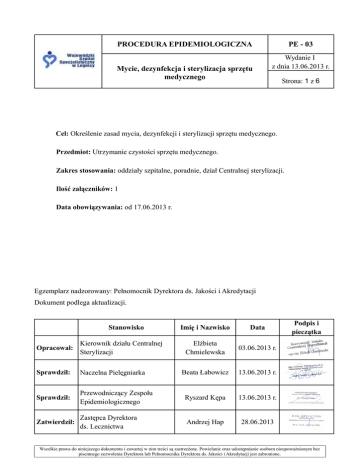 PROCEDURA EPIDEMIOLOGICZNA Mycie, dezynfekcja i sterylizacja sprzętu medycznego PE - 03 Wydanie I z dnia 13.06.2013 r. Strona: 1 z 6 Cel: Określenie zasad mycia, dezynfekcji i sterylizacji sprzętu medycznego. Przedmiot: Utrzymanie czystości sprzętu medycznego. Zakres stosowania: oddziały szpitalne, poradnie, dział Centralnej sterylizacji. Ilość załączników: 1 Data obowiązywania: od 17.06.2013 r. Egzemplarz nadzorowany: Pełnomocnik Dyrektora ds. Jakości i Akredytacji Dokument podlega aktualizacji. Stanowisko Imię i Nazwisko Data Elżbieta Chmielewska 03.06.2013 r. Beata Łabowicz 13.06.2013 r. Opracował: Kierownik działu Centralnej Sterylizacji Sprawdził: Naczelna Pielęgniarka Sprawdził: Przewodniczący Zespołu Epidemiologicznego Ryszard Kępa 13.06.2013 r. Zatwierdził: Zastępca Dyrektora ds. Lecznictwa Andrzej Hap 28.06.2013 Podpis i pieczątka Wszelkie prawa do niniejszego dokumentu i zawartej w nim treści są zastrzeżone. Powielanie oraz udostępnianie osobom nieupoważnionym bez pisemnego zezwolenia Dyrektora lub Pełnomocnika Dyrektora ds. Jakości i Akredytacji jest zabronione. PROCEDURA EPIDEMIOLOGICZNA Mycie, dezynfekcja i sterylizacja sprzętu medycznego PE - 03 Wydanie I z dnia 13.06.2013 r. Strona: 2 z 6 Spis treści: 1. Cel …………………………………………………………………………............... s. 3 2. Przedmiot i zakres stosowania ……………………………………………………. s. 3 3. Definicje i terminologia ………………………………………………………….... s. 3 4. Odpowiedzialność i uprawnienia ………………………………………………… s. 4 5. Opis postępowania ………………………………………………………………… s. 4 6. Załączniki ….............................................................................................................. s. 6 7. Dokumenty związane ……………………………………………………………... s. 6 Wszelkie prawa do niniejszego dokumentu i zawartej w nim treści są zastrzeżone. Powielanie oraz udostępnianie osobom nieupoważnionym bez pisemnego zezwolenia Dyrektora lub Pełnomocnika Dyrektora ds. Jakości i Akredytacji jest zabronione. PROCEDURA EPIDEMIOLOGICZNA Mycie, dezynfekcja i sterylizacja sprzętu medycznego PE - 03 Wydanie I z dnia 13.06.2013 r. Strona: 3 z 6 1. Cel. Celem procedury jest: określenie zasad postępowania z wielorazowymi narzędziami i sprzętem medycznym, wskazanie miejsc przeprowadzania dekontaminacji, określenie sposobów kontroli poprawności i skuteczności stosowania procedury, osób odpowiedzialnych za nadzór i dekontaminację. 2. Przedmiot i zakres stosowania. Przedmiotem procedury jest określenie sposobu postępowania z narzędziami i medycznym sprzętem z uwzględnieniem stopnia przeniesienia zakażenia w środowisku szpitalnym. Powtórne użycie odnosi się tylko do narzędzi i sprzętu medycznego wielorazowego użycia. Narzędzia określone przez producenta, jako jednorazowe po zużyciu są traktowane jako odpad medyczny. 3. Definicje i terminologia. Klasyfikacja Spaulinga dzieli sprzęt szpitalny na trzy kategorie: 1. Kategoria wysokiego ryzyka W grupie wysokiego ryzyka znajdują się narzędzia, które przy rutynowym stosowaniu uszkadzają skórę i błony śluzowe (np. igły, skalpele, większość narzędzi chirurgicznych). Narzędzia z tej grupy bezwzględnie muszą być jałowe (jednorazowe lub wysterylizowane). 2. Kategoria średniego ryzyka W grupie średniego ryzyka znajdują się narzędzia wchodzące przy rutynowym stosowaniu w kontakt z nieuszkodzonymi błonami śluzowymi. Do tej grupy należą m. in. endoskopy, zestawy do intubacji. Narzędzia z tej grupy powinny być poddane dezynfekcji wysokiego stopnia z użyciem preparatów dezynfekcyjnych lub należy poddać je sterylizacji. 3. Kategoria niskiego ryzyka W kategorii niskiego ryzyka znajdują się narzędzia wchodzące w kontakt jedynie z nieuszkodzoną skórą (aparaty do mierzenia ciśnienia, stetoskopy, wyposażenie sal). Sprzęt z tej grupy wymaga Wszelkie prawa do niniejszego dokumentu i zawartej w nim treści są zastrzeżone. Powielanie oraz udostępnianie osobom nieupoważnionym bez pisemnego zezwolenia Dyrektora lub Pełnomocnika Dyrektora ds. Jakości i Akredytacji jest zabronione. PROCEDURA EPIDEMIOLOGICZNA Mycie, dezynfekcja i sterylizacja sprzętu medycznego PE - 03 Wydanie I z dnia 13.06.2013 r. Strona: 4 z 6 mycia i okresowej dezynfekcji. Dekontaminacja - jest to proces niszczenia biologicznych czynników chorobotwórczych przez mycie, dezynfekcję lub sterylizację. Dezynfekcja – proces redukcji ilości biologicznych czynników chorobotwórczych przez zastosowanie metod fizycznych i chemicznych. Sterylizacja – proces zniszczenia zdolnych do namnażania się form biologicznych czynników chorobotwórczych. Produkt uznaje się za sterylny, jeżeli prawdopodobieństwo pozostania na nim żywych mikroorganizmów jest równe lub mniejsze niż 1 do miliona. 4. Odpowiedzialność i uprawnienia. Za prawidłowe postępowanie z narzędziami i sprzętem medycznym zgodnie z instrukcją producenta odpowiada użytkownik danego wyrobu. Za prawidłowe stosowanie procedury odpowiada każdy pracownik. Odpowiedzialnymi za wdrożenie i monitorowanie realizacji procedury czyni się kierowników komórek organizacyjnych. Opis postępowania. 5. Zapoznać się z instrukcją producenta dotyczącą metod i zasad dezynfekcji i zalecanej metody sterylizacji instrumentarium medycznego. Do dezynfekcji instrumentarium medycznego stosować preparaty o szerokim zakresie działania znajdujące się w wykazie preparatów stosowanych w WSzSL. Należy przestrzegać zalecanych stężeń i czasu działania preparatów dezynfekcyjnych. Dezynfekcja wstępna jest przeprowadzana bezpośrednio po użyciu i dotyczy narzędzi i sprzętu medycznego przekazywanych z oddziałów do dalszej obróbki w Dziale Centralne