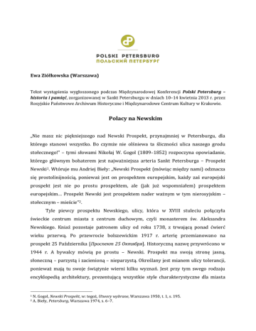 Ewa Ziółkowska (Warszawa) Tekst wystąpienia wygłoszonego podczas Międzynarodowej Konferencji Polski Petersburg – historia i pamięć, zorganizowanej w Sankt Petersburgu w dniach 10–14 kwietnia 2013 r. przez Rosyjskie Państwowe Archiwum Historyczne i Międzynarodowe Centrum Kultury w Krakowie. Polacy na Newskim „Nie masz nic piękniejszego nad Newski Prospekt, przynajmniej w Petersburgu, dla którego stanowi wszystko. Bo czymże nie olśniewa ta śliczności ulica naszego grodu stołecznego!” – tymi słowami Nikołaj W. Gogol (1809–1852) rozpoczyna opowiadanie, którego głównym bohaterem jest najważniejsza arteria Sankt Petersburga – Prospekt Newski1. Wtóruje mu Andriej Bieły: „Newski Prospekt (mówiąc między nami) odznacza się prostolinijnością, ponieważ jest on prospektem europejskim, każdy zaś europejski prospekt jest nie po prostu prospektem, ale (jak już wspomniałem) prospektem europejskim… Prospekt Newski jest prospektem nader ważnym w tym nierosyjskim – stołecznym – mieście”2. Tyle piewcy prospektu Newskiego, ulicy, która w XVIII stuleciu połączyła świeckie centrum miasta z centrum duchowym, czyli monasterem św. Aleksandra Newskiego. Kniaź pozostaje patronem ulicy od roku 1738, z trwającą ponad ćwierć wieku przerwą. Po przewrocie bolszewickim 1917 r. arterię przemianowano na prospekt 25 Października [Проспект 25 Октября]. Historyczną nazwę przywrócono w 1944 r. A bywalcy mówią po prostu – Newski. Prospekt ma swoją stronę jasną, słoneczną – parzystą i zacienioną – nieparzystą. Określany jest mianem ulicy tolerancji, ponieważ mają tu swoje świątynie wierni kilku wyznań. Jest przy tym swego rodzaju encyklopedią architektury, prezentującą wszystkie style charakterystyczne dla miasta 1 2 N. Gogol, Newski Prospekt, w: tegoż, Utwory wybrane, Warszawa 1950, t. 1, s. 195. A. Bieły, Petersburg, Warszawa 1974, s. 6–7. nad Newą. Ze swoimi pałacami, luksusowymi sklepami, restauracjami i kawiarniami stanowi reprezentacyjną promenadę, wizytówkę „północnej stolicy”. W ciągu 310-letniej historii Petersburga na prospekcie Newskim odcisnęło swoje piętno wiele nacji i kultur. Także Polacy3. W pierwszej połowie XIX stulecia, pod nr. 1 znajdował się hotel „Londyn”, w którym tuż po przyjeździe do Petersburga zatrzymał się Adam Mickiewicz (1798–1855) wraz z przyjaciółmi filomatami, skazanymi podobnie jak on na „osiedlenie w oddalonych od Polski guberniach”. W stolicy Rosji znaleźli się 9/21 listopada 1824 r., nazajutrz po katastrofalnej powodzi. Hotel okazał się dla nich zbyt drogi, przenieśli się więc do domu kupca I. F. Warwarina przy ul. Bolszoj Mieszczanskoj [Большая Мещанская ул.] (Wielkiej Mieszczańskiej, obecnie Kazańskiej [Казанская ул.]) 18. Jak odnotował Onufry Pietraszkiewicz (1793–1863), wielkomiejski rys prospektu Newskiego wywarł na nich silne wrażenie, spodobało im się zwłaszcza gazowe oświetlenie sklepów. Przejmującą wizję poetycką stolicy Imperium Rosyjskiego zawarł Mickiewicz w Ustępie III części Dziadów. Polski wieszcz został upamiętniony w Petersburgu tablicą na domu przy ul. Kazańskiej 39 (kolejny adres poety) oraz pomnikiem ustawionym w 1998 r. niedaleko prospektu Newskiego, w zaułku Grafskim [Графский переулок]. Gmach oblicowany ciemnoszarym granitem, przypominający florencki pałac Medyceuszy, to dawny bank Wawelberga (nr 7–9). Do dziś na szczycie fasady widnieją splecione litery „H” i „W”, będące inicjałami Hipolita Wawelberga (1844–1901), finansisty i filantropa, właściciela Domu Bankowego swojego imienia w Warszawie i Petersburgu, współzałożyciela tygodnika „Kraj”. Budowlę wzniósł jego syn, Michał Wawelberg (1880–po 1929). Konkurs na projekt wygrał polski architekt Marian Peretiatkowicz (1872–1916), absolwent Instytutu Inżynierów Cywilnych i Cesarskiej Akademii Sztuk Pięknych. W Petersburgu na jego dorobek architektoniczny złożyły się między innymi ostateczny kształt kościoła Notre Dame de France na Kowieńskim, Rosyjski Bank Handlowo-Przemysłowy (ul. Wielka Morska [Большая Морская ул.] 15) i tzw. Dom Kierbedzia (ul. Kiriłłowska [Кирилловская ул.] 19). W opracowaniu wykorzystałam m.in.: Б. M. Kириков, Л. A. Kирикова, O. В. Петрова, Невский проспект: Дoм зa дoмом, Санкт-Петербург-Москва 2009; Polski słownik biograficzny, Kraków 1935, t. 1; S. Łoza, Architekci i budowniczowie w Polsce, Warszawa 1954; I. Barenbaum, Książka w Petersburgu, Wrocław 1988; L. Gomolicki, Dziennik pobytu Adama Mickiewicza w Rosji 1824–1829, Warszawa 1949; R. Hankowska, Kościół Świętej Katarzyny Panny i Męczenniczki Aleksandryjskiej w Sankt Petersburgu, Warszawa 1997; T. M. Смирнова, Многонациональный Петербург, Санкт-Петербург 2010. 3 2 Szkoła nr 210 (nr 14) to szczególne miejsce pamięci o blokadzie Leningradu. Na fasadzie w latach sześćdziesiątych odtworzono napis z jesieni 1941 r.: „Obywatele, przy ostrzale artyleryjskim ta strona ulicy jest najbardziej niebezpieczna”. Tragedię Polaków – mieszkańców „blokadnego” Leningradu upamiętnia tablica „Polakom – obrońcom Leningradu”, odsłonięta 24 stycznia 2004 r. na największej na świecie nekropolii z czasów II wojny światowej – cmentarzu Piskariowskim. Cukiernia „Wolff i Béranger”, na rogu Newskiego i nabrzeża Mojki [Мойки p. наб.] (nr 18), znajdowała się w domu będącym na początku XIX stulecia własnością kupca K. B. Kotomina. Zasłynęła jako miejsce, gdzie Aleksandr S. Puszkin (1799–1837) wypił z sekundantem po szklance lemoniady, po czym wyruszyli na pojedynek z Georgesem d’Anthèsem (1812–1895). Od 1985 r. działa tu kawiarnia literacka. Mało kto wie, że była to je