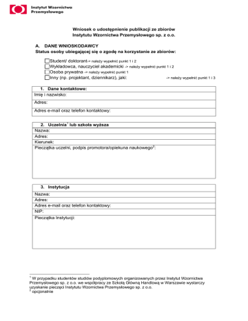Wniosek o udostępnienie publikacji ze zbiorów Instytutu Wzornictwa Przemysłowego sp. z o.o. A. DANE WNIOSKODAWCY Status osoby ubiegającej się o zgodę na korzystanie ze zbiorów: Student/ doktorant-> należy wypełnić punkt 1 i 2 Wykładowca, nauczyciel akademicki -> należy wypełnić punkt 1 i 2 Osoba prywatna -> należy wypełnić punkt 1 Inny (np. projektant, dziennikarz), jaki: -> należy wypełnić punkt 1 i 3 1. Dane kontaktowe: Imię i nazwisko: Adres: Adres e-mail oraz telefon kontaktowy: 2. Uczelnia1 lub szkoła wyższa Nazwa: Adres: Kierunek: Pieczątka uczelni, podpis promotora/opiekuna naukowego2: 3. Instytucja Nazwa: Adres: Adres e-mail oraz telefon kontaktowy: NIP: Pieczątka Instytucji: 1 W przypadku studentów studiów podyplomowych organizowanych przez Instytut Wzornictwa Przemysłowego sp. z o.o. we współpracy ze Szkołą Główną Handlową w Warszawie wystarczy uzyskanie pieczęci Instytutu Wzornictwa Przemysłowego sp. z o.o. 2 opcjonalnie B. ZAMÓWIENIE W przypadku gdy Wnioskodawca chce skorzystać z konkretnych publikacji -> należy wypełnić punkt 1 i 3 W przypadku gdy Wnioskodawca chce zlecić pracownikowi Instytutu Wzornictwa Przemysłowego sp. z o.o. wyszukiwanie publikacji na określony temat -> należy wypełnić punkt 2 i 3 1. Zamówienie publikacji: Książka – autor i tytuł lub sygnatura3; Artykuł z czasopisma –tytuł czasopisma, rok, numer; Materiały niepublikowane - temat 1. 2. 3. 4. 5. …. 2. Zamówienie wyszukiwania: Temat przedstawiony w taki sposób, aby była możliwa identyfikacja materiałów, jeżeli publikacje są nieznane: 3. Cel wykorzystania publikacji z uzasadnieniem: do celów naukowych + uzasadnienie + opinia opiekuna naukowego4 do celów zawodowych + uzasadnienie inny, jaki: + uzasadnienie C. INSTRUKCJA ZAMAWIANIA PUBLIKACJI ZE ZBIORÓW INSTYTUTU WZORNICTWA PRZEMYSŁOWEGO SP. Z O.O. 1. W celu skorzystania ze zbiorów Instytutu Wzornictwa Przemysłowego sp. z o.o. konieczne jest wypełnienie „Wniosku o udostępnienie publikacji ze zbiorów Instytutu Wzornictwa Przemysłowego sp. z o.o.” Złożenie wniosku jest równoznaczne z potwierdzeniem zapoznania się z regulaminem korzystania ze zbiorów Instytutu Wzornictwa Przemysłowego sp. z o.o. 2. Wypełniony wniosek należy przesłać pocztą lub dostarczyć osobiście do siedziby Instytutu Wzornictwa Przemysłowego sp. z o.o. lub przesłać drogą mailową na adres: [email protected] lub faxem: 22 831 64 78. W przypadku przesłania wniosku za pomocą 3 http://makwww.iwp‐tech.com.pl/cgi‐bin/makwww.exe opcjonalnie 4 3. 4. 5. 6. 7. elektronicznych środków przekazu oryginał dokumentu należy dostarczyć do siedziby Instytutu Wzornictwa Przemysłowego sp. z o.o. najpóźniej w dniu korzystania ze zbiorów. Instytut Wzornictwa Przemysłowego sp. z o.o. zastrzega sobie prawo do odmowy udostępnienia zbiorów bez podania przyczyny. Pracownik Instytutu Wzornictwa Przemysłowego sp. z o.o. skontaktuje się z Wnioskodawcą telefonicznie lub poprzez pocztę e-mail w celu: - powiadomienia Wnioskodawcy o zgodzie lub braku zgody na korzystanie ze zbiorów wskazanych we Wniosku, - uzgodnienia przewidywanego czasu i kosztu wykonania kwerendy (dotyczy tylko osób, które w części B formularza wybrały opcję wyszukiwania publikacji), - ustalenia z Wnioskodawcą terminu korzystania ze zbiorów Instytutu Wzornictwa Przemysłowego sp. z o.o. Wnioskodawca zobowiązany jest wpłacić, wynikającą z wniosku i/lub ustaleń z pracownikiem Instytutu Wzornictwa Przemysłowego sp. z o.o., zgodną z cennikiem usług opłatę za korzystanie ze zbiorów, przelewem na konto bankowe Raiffeisen Bank Polska S.A. 20 1750 0009 0000 0000 0636 0898: - przed rozpoczęciem wyszukiwania publikacji przez pracownika Instytutu Wzornictwa Przemysłowego sp. z o.o. - przed skorzystaniem ze zbiorów w siedzibie Prosimy o wcześniejsze dokonanie wpłaty, tak aby możliwe było stwierdzenie wpływu środków na konto bankowe. W przeciwnym wypadku pracownik Instytutu Wzornictwa Przemysłowego ma prawo zmienić termin korzystania ze zbiorów. Studenci studiów podyplomowych organizowanych przez Instytut Wzornictwa Przemysłowego sp. z o.o. we współpracy ze Szkołą Główną Handlową w Warszawie w trakcie trwania studiów mogą korzystać ze zbiorów Instytutu Wzornictwa Przemysłowego sp. z o.o. nieodpłatnie5. Punkty 1-4 Instrukcji stosuje się. Absolwenci studiów podyplomowych organizowanych przez Instytut Wzornictwa Przemysłowego sp. z o.o. we współpracy ze Szkołą Główną Handlową w Warszawie mogą korzystać ze zbiorów Instytutu Wzornictwa Przemysłowego sp. z o.o. uzyskując rabat na świadczone usługi6. Punkty 1-5 Instrukcji stosuje się. D. REGULAMIN KORZYSTANIA ZE ZBIORÓW INSTYTUTU WZORNICTWA PRZEMYSŁOWEGO SP. Z O.O. 1. Ze zbiorów Instytutu Wzornictwa Przemysłowego sp. z o.o. korzystać może tylko osoba wskazana w punkcie 1 części A wniosku. Korzystanie ze zbiorów Instytutu Wzornictwa Przemysłowego sp. z o.o. możliwe jest tylko na terenie siedziby Spółki – w miejscu wskazanym Wnioskodawcy przez pracownika Instytutu Wzornictwa Przemysłowego sp. z o.o. 2. Wszelkie zauważone uszkodzenia wydawnictw należy niezwłocznie zgłaszać pracownikowi Instytutu Wzornictwa Przemysłowego sp. z o.o. 3. Zabrania się niszczenia materiałów bibliotecznych, wycinania, wyrywania stron, podkreślania fragmentów itp. 4. W przypadku zniszczenia udostępnionej publikacji Czytelnik będzie musiał zapłacić karę w wysokości trzykrotnej obecnej ceny rynkowej tej publikacji lub odkupić identyczny egzemplarz. W przypadku publikacji niedostępnych na rynku Czytelnik będzie musiał zapłacić karę w wysokości trzykrotnej ceny antykwarycznej tej publikacji. 5. Zabrania się kserowania, fotografowania publikacji bez uzyskania zgody pracownika Instytutu Wzornictwa Przemysłowego sp. z o.o. E. CENNIK 1. Opłata za udostępnienie zamówionych publikacji (opcja zamówienia publikacji w części B): 