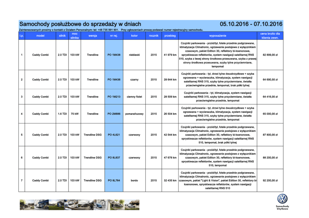 Samochody posłużbowe do sprzedaży w dniach 05.10.2016 - 07.10.2016 Zainteresowanych prosimy o kontakt z Działem Personalnym: tel: +48 735 991 901. Przy zgłoszeniach proszę podawać numer rejestracyjny samochodu. l.p. 1 2 3 4 5 6 7 model Caddy Combi Caddy Combi Caddy Combi Caddy Combi Caddy Combi Caddy Combi Caddy Combi silnik 2.0 TDI 2.0 TDI 2.0 TDI 1.6 TDI 2.0 TDI 2.0 TDI 2.0 TDI moc silnika 103 kW 103 kW 103 kW 75 kW 103 kW 103 kW 103 kW wersja Trendline Trendline Trendline Trendline Trendline DSG Trendline DSG Trendline DSG nr rej. PO 1M438 PO 1M436 PO 1M213 PO 2M886 PO 4L621 PO 8L837 PO 8L764 kolor niebieski czarny ciemny fiolet pomarańczowy czerwony czerwony bordo przebieg wyposażenie cena brutto dla klienta zewn. 41 979 km Czujniki parkowania - przód/tył, fotele przednie podgrzewane, klimatyzacja Climatronic, ogrzewanie postojowe z wyłącznikiem czasowym, pakiet Edition 30, reflektory bi-ksenonowe, spryskiwacze reflektorów, system nawigacji satelitarnej RNS 510, szyba z lewej strony środkowa przesuwana, szyba z prawej strony środkowa przesuwana, szyby tylne przyciemniane, tempomat 82 899,00 zł 28 644 km Czujniki parkowania - tył, drzwi tylne dwuskrzydłowe + szyba ogrzewana + wycieraczka, klimatyzacja, system nawigacji satelitarnej RNS 315, szyby tylne przyciemniane, światła przeciwmgielne przednie, tempomat, brak półki tylnej 64 690,50 zł 28 509 km Czujniki parkowania - tył, klimatyzacja, system nawigacji satelitarnej RNS 315, szyby tylne przyciemniane, światła przeciwmgielne przednie, tempomat 64 416,00 zł 26 504 km Czujniki parkowania - tył, drzwi tylne dwuskrzydłowe + szyba ogrzewana + wycieraczka, klimatyzacja, system nawigacji satelitarnej RNS 315, szyby tylne przyciemniane, światła przeciwmgielne przednie, tempomat 65 000,00 zł 42 544 km Czujniki parkowania - przód/tył, fotele przednie podgrzewane, klimatyzacja Climatronic, ogrzewanie postojowe z wyłącznikiem czasowym, pakiet Edition 30, reflektory bi-ksenonowe, spryskiwacze reflektorów, system nawigacji satelitarnej RNS 510, tempomat, brak półki tylnej 87 800,00 zł 2015 47 678 km Czujniki parkowania - przód/tył, fotele przednie podgrzewane, klimatyzacja Climatronic, ogrzewanie postojowe z wyłącznikiem czasowym, pakiet Edition 30, reflektory bi-ksenonowe, spryskiwacze reflektorów, system nawigacji satelitarnej RNS 510, tempomat 88 200,00 zł 2015 Czujniki parkowania - przód/tył, fotele przednie podgrzewane, klimatyzacja Climatronic, ogrzewanie postojowe z wyłącznikiem 32 435 km czasowym, pakiet "Light & Vision", pakiet Edition 30, reflektory biksenonowe, spryskiwacze reflektorów, system nawigacji satelitarnej RNS 510 rocznik 2015 2015 2015 2015 2015 92 200,00 zł 8 9 10 11 12 13 14 15 Caddy Combi Caddy Combi Caddy Combi Caddy Combi Caddy Combi Caddy Combi Caddy Combi Caddy Combi 2.0 TDI 2.0 TDI 2.0 TDI 2.0 TDI 2.0 TDI 2.0 TDI 1.6 TDI 2.0 TDI 103 kW 103 kW 103 kW 103 kW 125 kW 103 kW 75 kW 103 kW Trendline DSG Trendline DSG Trendline DSG Trendline Cross DSG Trendline Trendline Trendline DSG PO 9L162 PO 8L618 PO 8L732 PO 8L638 PO 8L639 PO 8L375 PO 2M441 PO 8L938 srebrny biały czerwony biały bordo srebrny czarny biały 2015 Czujniki parkowania - przód/tył, fotele przednie podgrzewane, klimatyzacja Climatronic, ogrzewanie postojowe z wyłącznikiem 33 699 km czasowym, pakiet "Light & Vision", pakiet Edition 30, reflektory biksenonowe, spryskiwacze reflektorów, system nawigacji satelitarnej RNS 510, tempomat Czujniki parkowania - przód/tył, fotele przednie podgrzewane, klimatyzacja Climatronic, ogrzewanie postojowe z wyłącznikiem czasowym, pakiet Edition 30, reflektory bi-ksenonowe, spryskiwacze reflektorów, system nawigacji satelitarnej RNS 510, tempomat, brak tylnej półki 92 600,00 zł 2015 38 965 km 2015 Czujniki parkowania - przód/tył, fotele przednie podgrzewane, klimatyzacja Climatronic, ogrzewanie postojowe z wyłącznikiem 52 313 km czasowym, pakiet "Light & Vision", pakiet Edition 30, reflektory biksenonowe, spryskiwacze reflektorów, system nawigacji satelitarnej RNS 510, tempomat, brak koła zapasowego 86 700,00 zł 2015 Czujniki parkowania - przód/tył, fotele przednie podgrzewane, klimatyzacja Climatronic, ogrzewanie postojowe z wyłącznikiem 11 095 km czasowym, pakiet "Light & Vision", pakiet Edition 30, reflektory biksenonowe, spryskiwacze reflektorów, system nawigacji satelitarnej RNS 510, tempomat, złączę AUX 92 400,00 zł 2015 2015 2015 2015 89 400,00 zł 70 486 km Czujniki parkowania - tył, kierownica wielofunkcyjna obszyta skórą, klimatyzacja Climatronic, system nawigacji satelitarnej RNS 510 78 300,00 zł 26 487 km Czujniki parkowania - tył, dodatkowe sakwy w bagażniku, fotele przednie podgrzewane, klimatyzacja Climatronic, ogrzewanie postojowe z wyłącznikiem czasowym, pakiet Edition 30, reflektory bi-ksenonowe, spryskiwacze reflektorów, system nawigacji satelitarnej RNS 510, tempomat 90 400,00 zł 32 906 km Czujniki parkowania - tył, drzwi tylne dwuskrzydłowe + szyba ogrzewana + wycieraczka, klimatyzacja, system nawigacji satelitarnej RNS 315, szyby tylne przyciemniane, światła przeciwmgielne przednie, tempomat 64 400,00 zł 53 850 km Czujniki parkowania - tył, fotele przednie podgrzewane, klimatyzacja Climatronic, ogrzewanie postojowe z wyłącznikiem czasowym, pakiet Edition 30, reflektory bi-ksenonowe, spryskiwacze reflektorów, system nawigacji satelitarnej RNS 510, tempomat, uszkodzona tabliczka znamionowa 86 100,00 zł 16 17 18 19 20 21 Caddy Combi Caddy Combi Caddy Combi Caddy Combi Caddy Combi Caddy Combi 2.0 TDI 2.0 TDI 2.0 TDI 1.6 TDI 1.6 TDI 2.0 TDI 103 kW 103 kW 103 kW 75 kW 75 kW 103 kW Trendline Trendline Trendline Trendline Trendline Cross DSG PO 2M426 PO 2M891 PO 3M020 PO 3M025 PO 3M024 PO 6L978 szary szary szary bordo niebieski czerwony 2015 2015 2015 2015 2015 2015 23 188 km Czujniki parkowania - tył, klimatyzacja, system nawigacji satelitarnej RNS 315, szyby tylne przyciemniane, światła przeciwmgielne przed