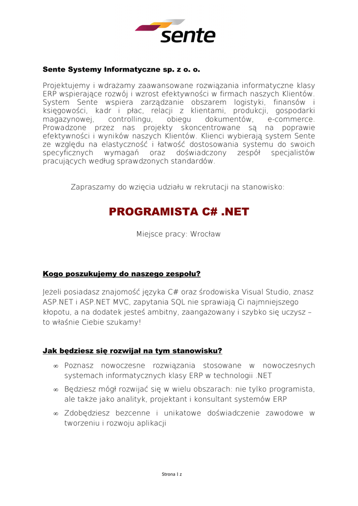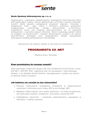 Sente Systemy Informatyczne sp. z o. o. Projektujemy i wdrażamy zaawansowane rozwiązania informatyczne klasy ERP wspierające rozwój i wzrost efektywności w firmach naszych Klientów. System Sente wspiera zarządzanie obszarem logistyki, finansów i księgowości, kadr i płac, relacji z klientami, produkcji, gospodarki magazynowej, controllingu, obiegu dokumentów, e-commerce. Prowadzone przez nas projekty skoncentrowane są na poprawie efektywności i wyników naszych Klientów. Klienci wybierają system Sente ze względu na elastyczność i łatwość dostosowania systemu do swoich specyficznych wymagań oraz doświadczony zespół specjalistów pracujących według sprawdzonych standardów. Zapraszamy do wzięcia udziału w rekrutacji na stanowisko: PROGRAMISTA C# .NET Miejsce pracy: Wrocław Kogo poszukujemy do naszego zespołu? Jeżeli posiadasz znajomość języka C# oraz środowiska Visual Studio, znasz ASP.NET i ASP.NET MVC, zapytania SQL nie sprawiają Ci najmniejszego kłopotu, a na dodatek jesteś ambitny, zaangażowany i szybko się uczysz – to właśnie Ciebie szukamy! Jak będziesz się rozwijał na tym stanowisku? • Poznasz nowoczesne rozwiązania stosowane w nowoczesnych systemach informatycznych klasy ERP w technologii .NET • Będziesz mógł rozwijać się w wielu obszarach: nie tylko programista, ale także jako analityk, projektant i konsultant systemów ERP • Zdobędziesz bezcenne i unikatowe doświadczenie zawodowe w tworzeniu i rozwoju aplikacji Strona 1 z Co zyskujesz dołączając do naszego zespołu? • Elastyczny wymiar czasu pracy – możesz pracować w różnym wymiarze etatu w kolejnych miesiącach (np. na 3/5 w trakcie roku akademickiego i na cały etat w trakcie wakacji i ferii) • Elastyczne godziny pracy – zaczynasz i kończysz pracę w dowolnych wybranych godzinach • Fantastyczną atmosferę w pracy • Doświadczenie w projektowaniu rozwiązań informatycznych wspierających prowadzenie biznesu • Poczucie, że robisz coś ważnego i masz wpływ na efekty końcowe • Udział w realizacji ciekawych projektów dla średnich i dużych firm • Partnerskie relacje – zarówno pomiędzy pracownikami, jak i pomiędzy przełożonymi • Coaching programistyczny – uczysz się od najlepszych • Ciekawy i zróżnicowany zakres zadań, który pozwoli Ci się rozwijać • …oraz oczywiście atrakcyjne wynagrodzenie adekwatne do realizowanych zadań i wyników! Zainteresowała Cię nasza oferta? Prosimy o aplikowanie za pomocą formularza: http://rekrutacja.sente.pl/Apply/Step1/201312001 Dołącz do naszego zespołu i przekonaj się, że praca może być pasjonująca. Inne oferty pracy, które także mogą Cię zainteresować, znajdziesz na naszej stronie: http://www.sente.pl/o-nas/praca-w-sente/ Wszystkie aplikacje będą przez nas traktowane jako poufne. Skontaktujemy się z Tobą, by poinformować Cię o naszych decyzjach dotyczących rekrutacji. Strona 2 z