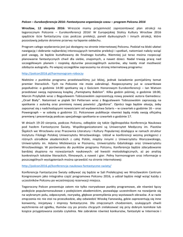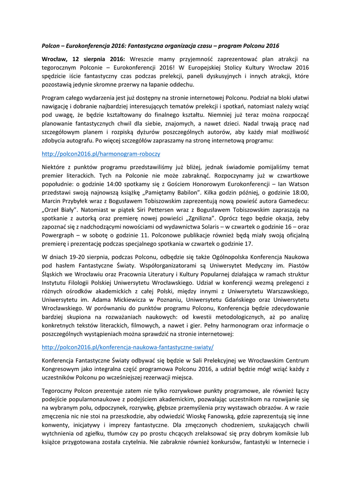 Polcon – Eurokonferencja 2016: Fantastyczna organizacja czasu – program Polconu 2016 Wrocław, 12 sierpnia 2016: Wreszcie mamy przyjemność zaprezentować plan atrakcji na tegorocznym Polconie – Eurokonferencji 2016! W Europejskiej Stolicy Kultury Wrocław 2016 spędzicie iście fantastyczny czas podczas prelekcji, paneli dyskusyjnych i innych atrakcji, które pozostawią jedynie skromne przerwy na łapanie oddechu. Program całego wydarzenia jest już dostępny na stronie internetowej Polconu. Podział na bloki ułatwi nawigację i dobranie najbardziej interesujących tematów prelekcji i spotkań, natomiast należy wziąć pod uwagę, że będzie kształtowany do finalnego kształtu. Niemniej już teraz można rozpocząć planowanie fantastycznych chwil dla siebie, znajomych, a nawet dzieci. Nadal trwają pracę nad szczegółowym planem i rozpiską dyżurów poszczególnych autorów, aby każdy miał możliwość zdobycia autografu. Po więcej szczegółów zapraszamy na stronę internetową programu: http://polcon2016.pl/harmonogram-roboczy Niektóre z punktów programu przedstawiliśmy już bliżej, jednak świadomie pomijaliśmy temat premier literackich. Tych na Polconie nie może zabraknąć. Rozpoczynamy już w czwartkowe popołudnie: o godzinie 14:00 spotkamy się z Gościem Honorowym Eurokonferencji – Ian Watson przedstawi swoją najnowszą książkę „Pamiętamy Babilon”. Kilka godzin później, o godzinie 18:00, Marcin Przybyłek wraz z Bogusławem Tobiszowskim zaprezentują nową powieść autora Gamedecu: „Orzeł Biały”. Natomiast w piątek Siri Pettersen wraz z Bogusławem Tobiszowskim zapraszają na spotkanie z autorką oraz premierę nowej powieści „Zgnilizna”. Oprócz tego będzie okazja, żeby zapoznać się z nadchodzącymi nowościami od wydawnictwa Solaris – w czwartek o godzinie 16 – oraz Powergraph – w sobotę o godzinie 11. Polconowe publikacje również będą miały swoją oficjalną premierę i prezentację podczas specjalnego spotkania w czwartek o godzinie 17. W dniach 19-20 sierpnia, podczas Polconu, odbędzie się także Ogólnopolska Konferencja Naukowa pod hasłem Fantastyczne Światy. Współorganizatorami są Uniwersytet Medyczny im. Piastów Śląskich we Wrocławiu oraz Pracownia Literatury i Kultury Popularnej działająca w ramach struktur Instytutu Filologii Polskiej Uniwersytetu Wrocławskiego. Udział w konferencji wezmą prelegenci z różnych ośrodków akademickich z całej Polski, między innymi z Uniwersytetu Warszawskiego, Uniwersytetu im. Adama Mickiewicza w Poznaniu, Uniwersytetu Gdańskiego oraz Uniwersytetu Wrocławskiego. W porównaniu do punktów programu Polconu, Konferencja będzie zdecydowanie bardziej skupiona na rozważaniach naukowych: od kwestii metodologicznych, aż po analizę konkretnych tekstów literackich, filmowych, a nawet i gier. Pełny harmonogram oraz informacje o poszczególnych wystąpieniach można sprawdzić na stronie internetowej: http://polcon2016.pl/konferencja-naukowa-fantastyczne-swiaty/ Konferencja Fantastyczne Światy odbywać się będzie w Sali Prelekcyjnej we Wrocławskim Centrum Kongresowym jako integralna część programowa Polconu 2016, a udział będzie mógł wziąć każdy z uczestników Polconu po wcześniejszej rezerwacji miejsca. Tegoroczny Polcon prezentuje zatem nie tylko rozrywkowe punkty programowe, ale również łączy podejście popularnonaukowe z podejściem akademickim, pozwalając uczestnikom na rozwijanie się na wybranym polu, odpoczynek, rozrywkę, głębsze przemyślenia przy wystawach obrazów. A w razie zmęczenia nic nie stoi na przeszkodzie, aby odwiedzić Wioskę Fanowską, gdzie zaprezentują się inne konwenty, inicjatywy i imprezy fantastyczne. Dla zmęczonych chodzeniem, szukających chwili wytchnienia od zgiełku, tłumów czy po prostu chcących zrelaksować się przy dobrym komiksie lub książce przygotowana została czytelnia. Nie zabraknie również konkursów, fantastyki w Internecie i innych atrakcji, o których więcej w kolejnej informacji prasowej. Tymczasem zapraszamy do sprawdzenia harmonogramu i szykowania fantastycznego czasu na Polconie! ### O Polconie Najstarszy, bo odbywający się od 1985 roku ogólnopolski festiwal literatury i fantastyki . Wydarzenie co roku organizowane jest w innym miejscu, a o wyborze organizatora decyduje Forum Fandomu dwa lata wcześniej. Częścią Polconu jest przyznawana na nim podczas specjalnej gali Nagroda Literacka Fandomu Polskiego im. Janusza A. Zajdla – najstarsza i najbardziej prestiżowa nagroda dla twórców literatury fantastycznej. W 2016 roku wydarzenie powraca do Wrocławia po 4 latach wędrówki. O Europejskiej Stolicy Kultury ESK to miasto wybrane przez Unię Europejską. Jego zadaniem jest w ciągu roku zaprezentować życie kulturalne nie tylko całego miasta, ale również regionu i kraju. Ideą Europejskiej Stolicy Kultury jest wzajemne poznanie, zbliżenie i otwarcie dialogu międzykulturowego wśród Europejczyków. Miasta noszące tytuł ESK skupiają na sobie uwagę całej Europy – daje to niepowtarzalną szansę nie tylko na wniesienie wkładu w rozwiązania kwestii istotnych dla naszego kontynentu, ale również możliwość przyspieszenia rozwoju oraz promocję miasta. W 2016 roku Wrocław dołączył do chlubnego grona ESK, gdzie już wcześniej pojawiły się Berlin, Florencja, Paryż, Madryt czy Praga.