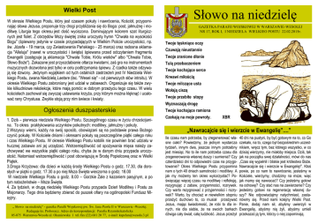 Wielki Post W okresie Wielkiego Postu, który jest czasem pokuty i nawrócenia, Kościół, przypominając słowa Jezusa, proponuje trzy drogi przybliżania się do Boga: post, jałmużnę i modlitwę. Liturgia tego okresu jest dość wyciszona. Dominującym kolorem szat liturgicznych jest fiolet. Z obrzędów Mszy świętej znika uroczysty hymn "Chwała na wysokości Bogu" (śpiewany jedynie w czasie przypadających w Wielkim Poście uroczystości, np. św. Józefa - 19 marca, czy Zwiastowania Pańskiego - 25 marca) oraz radosna aklamacja "Alleluja" (nawet w uroczystości i święta) śpiewana przed odczytaniem fragmentu Ewangelii (zastępuje ją aklamacja "Chwała Tobie, Królu wieków" albo "Chwała Tobie, Słowo Boże"). Zakazane jest przyozdabianie ołtarza kwiatami, zaś gra na instrumentach muzycznych dozwolona jest tylko w celu podtrzymania śpiewu. Z rzadka także odzywają się dzwony. Jedynym wyjątkiem od tych ostatnich zastrzeżeń jest IV Niedziela Wielkiego Postu, zwana Niedzielą Laetare (łac. "Wesel się" - od pierwszych słów introitu). W okresie Wielkiego Postu zabroniony jest udział w zabawach. Organizuje się także zwykle kilkudniowe rekolekcje, które mają pomóc w dobrym przeżyciu tego czasu. W wielu kościołach zachował się zwyczaj ustawiania krzyża, przy którym można klęknąć i ucałować rany Chrystusa. Zwykle stoją przy nim świece i kwiaty. Ogłoszenia duszpasterskie 1. Dziś – pierwsza niedziela Wielkiego Postu. Szczególnego czasu w życiu chrześcijanina. To okres praktykowania uczynków pokutnych: modlitwy, jałmużny i pokuty. 2.Wszyscy wierni, każdy na swój sposób, obowiązani są na podstawie prawa Bożego czynić pokutę. W Kościele dniami i okresami pokuty są poszczególne piątki całego roku i czas Wielkiego Postu. W okresie Wielkiego Postu katolik nie powinien brać udziału w hucznej zabawie ani jej urządzać. Wstrzemięźliwość od spożywania mięsa należy zachowywać we wszystkie piątki całego roku, chyba że w danym dniu przypada uroczystość. Natomiast wstrzemięźliwość i post obowiązują w Środę Popielcową oraz w Wielki Piątek. 3.Droga Krzyżowa: dla dzieci w każdą środę Wielkiego Postu o godz. 17.30, dla dorosłych w piątki o godz. 17.30 a po niej Msza Święta wieczorna o godz. 18.00 W niedziele Wielkiego Postu o godz. 8.00 – Gorzkie Żale z kazaniem pasyjnym, a po tym nabożeństwie – Msza Święta. 4. Za tydzień, w drugą niedzielę Wielkiego Postu przypada Dzień Modlitwy i Postu za Misjonarzy. Tego dnia będziemy zbierać do puszek ofiary na ogólnopolski Fundusz Misyjny. „ Słowo na niedzielę” - gazetka Parafii Wojskowej pw. Św. Jana Pawła II w Warszawie -Wesołej. Redaguje ks. Proboszcz. Adres do korespondencji: Parafia Rzymskokatolicka 05-075 Warszawa-Wesoła ul. Okuniewska 1 tel./fax (22) 681 20 77, e-mail: kapelan@wesoła.3.pl Słowo na niedzielę GAZETKA PARAFII WOJSKOWEJ W WARSZAWIE-WESOŁEJ NR 17, ROK I, I NIEDZIELA WIELKIEO POSTU 22.02.2015r. Twoje tęskniące oczy Czuwają nieustannie Twoje zranione dłonie Tulą przebaczeniem Twoje kochające serce Krwawi miłością Twoje milczące usta Wołają ciszą Twoje przebite stopy Wyznaczają drogę Twoje kochające ramiona Czekają na moje powroty. XBR „Nawracajcie się i wierzcie w Ewangelię”....” Ile czasu nam potrzeba, by zregenerować własne ciało? Powiedzmy, że jednym wystarcza tydzień, innym dwa, jeszcze innym potrzebny jest miesiąc. No to ile nam potrzeba czasu dla zregenerowania własnej duszy i sumienia? Czy czterdzieści dni to odpowiedni czas na przygotowanie? Okres Wielkiego Postu przypomina nam o tych 40 dniach samotności i modlitwy. A jak my możemy ten okres wykorzystać? Poświęcając więcej czasu na modlitwę i refleksję, rezygnując z zabaw, przyjemności, rozrywek. Czy warto rezygnować z przyjemności i rozrywek? Warto, by chociaż w niewielkim stopniu przeżyć duchowo to, co musiał przeżywać Jezus, mając świadomość, że robi to dla innych, nie dla siebie, że na swoich barkach dźwiga cały świat, całą ludzkość. Jezus przeżył 40 dni na pustyni, by być gotowym na to, co Go czekało, na to, czego był bezpośrednim uczestnikiem, wręcz tym, bez którego wszystko, w co dzisiaj wierzymy, nie miałoby miejsca. Dziś, tak jak na początku swej działalności, mówi do nas „Czas się wypełnił i bliskie jest królestwo Boże. Nawracajcie się i wierzcie w Ewangelię!”. Ktoś powie, po co nam to nawrócenie, jesteśmy w Kościele, wierzymy, chodzimy na msze, więc jak mamy się nawracać? Czy jesteśmy gotowi na odnowę? Czy stać nas na zawierzenie? Czy jesteśmy gotowi na regenerację własnej duszy? Nie odpowiadajmy natychmiast, zastanówmy się. Przed nami kolejny Wielki Post. Panie, dodaj nam sił, abyśmy uwierzyli w Ewangelię, abyśmy nią żyli, abyśmy umieli przekazać ją tym, którzy o niej zapominają. Liturgia Słowa na I Niedzielę Wielkiego Postu B I Czytanie Rdz 9,8-15 II Czytanie 1 P 3,18-22 Czytanie z Księgi Rodzaju: Tak rzekł Bóg do Noego i do jego synów: „Oto Ja zawieram przymierze z wami i z waszym potomstwem, które po was będzie; z wszelką istotą żywą, która jest z wami: z ptactwem, ze zwierzętami domowymi i polnymi, jakie są przy was, ze wszystkimi, które wyszły z arki, z wszelkim zwierzęciem na ziemi. Zawieram z wami przymierze tak, iż nigdy już nie zostanie zgładzona żadna istota żywa wodami potopu i już nigdy nie będzie potopu niszczącego ziemię”. Po czym Bóg dodał: „A to jest znak przymierza, które Ja zawieram z wami i każdą istotą żywą, jaka jest z wami, na wieczne czasy: Łuk mój kładę na obłoki, aby był znakiem przymierza między Mną i ziemią. A gdy rozciągnę obłoki nad ziemią i gdy ukaże się ten łuk na obłokach, wtedy wspomnę na moje przymierze, które zawarłem z wami i z wszelką istotą żywą, z każdym człowiekiem; i nie będzie już nigdy wód potopu na zniszczenie jakiegokolwiek jestes