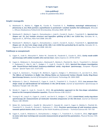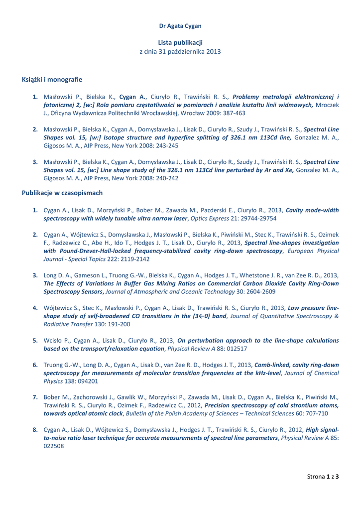 Dr Agata Cygan Lista publikacji z dnia 31 października 2013 Książki i monografie 1. Masłowski P., Bielska K., Cygan A., Ciuryło R., Trawiński R. S., Problemy metrologii elektronicznej i fotonicznej 2, [w:] Rola pomiaru częstotliwości w pomiarach i analizie kształtu linii widmowych, Mroczek J., Oficyna Wydawnicza Politechniki Wrocławskiej, Wrocław 2009: 387-463 2. Masłowski P., Bielska K., Cygan A., Domysławska J., Lisak D., Ciuryło R., Szudy J., Trawiński R. S., Spectral Line Shapes vol. 15, [w:] Isotope structure and hyperfine splitting of 326.1 nm 113Cd line, Gonzalez M. A., Gigosos M. A., AIP Press, New York 2008: 243-245 3. Masłowski P., Bielska K., Cygan A., Domysławska J., Lisak D., Ciuryło R., Szudy J., Trawiński R. S., Spectral Line Shapes vol. 15, [w:] Line shape study of the 326.1 nm 113Cd line perturbed by Ar and Xe, Gonzalez M. A., Gigosos M. A., AIP Press, New York 2008: 240-242 Publikacje w czasopismach 1. Cygan A., Lisak D., Morzyński P., Bober M., Zawada M., Pazderski E., Ciuryło R., 2013, Cavity mode-width spectroscopy with widely tunable ultra narrow laser, Optics Express 21: 29744-29754 2. Cygan A., Wójtewicz S., Domysławska J., Masłowski P., Bielska K., Piwiński M., Stec K., Trawiński R. S., Ozimek F., Radzewicz C., Abe H., Ido T., Hodges J. T., Lisak D., Ciuryło R., 2013, Spectral line-shapes investigation with Pound-Drever-Hall-locked frequency-stabilized cavity ring-down spectroscopy, European Physical Journal - Special Topics 222: 2119-2142 3. Long D. A., Gameson L., Truong G.-W., Bielska K., Cygan A., Hodges J. T., Whetstone J. R., van Zee R. D., 2013, The Effects of Variations in Buffer Gas Mixing Ratios on Commercial Carbon Dioxide Cavity Ring-Down Spectroscopy Sensors, Journal of Atmospheric and Oceanic Technology 30: 2604-2609 4. Wójtewicz S., Stec K., Masłowski P., Cygan A., Lisak D., Trawiński R. S., Ciuryło R., 2013, Low pressure lineshape study of self-broadened CO transitions in the (3←0) band, Journal of Quantitative Spectroscopy & Radiative Transfer 130: 191-200 5. Wcisło P., Cygan A., Lisak D., Ciuryło R., 2013, On perturbation approach to the line-shape calculations based on the transport/relaxation equation, Physical Review A 88: 012517 6. Truong G.-W., Long D. A., Cygan A., Lisak D., van Zee R. D., Hodges J. T., 2013, Comb-linked, cavity ring-down spectroscopy for measurements of molecular transition frequencies at the kHz-level, Journal of Chemical Physics 138: 094201 7. Bober M., Zachorowski J., Gawlik W., Morzyński P., Zawada M., Lisak D., Cygan A., Bielska K., Piwiński M., Trawiński R. S., Ciuryło R., Ozimek F., Radzewicz C., 2012, Precision spectroscopy of cold strontium atoms, towards optical atomic clock, Bulletin of the Polish Academy of Sciences – Technical Sciences 60: 707-710 8. Cygan A., Lisak D., Wójtewicz S., Domysławska J., Hodges J. T., Trawiński R. S., Ciuryło R., 2012, High signalto-noise ratio laser technique for accurate measurements of spectral line parameters, Physical Review A 85: 022508 Strona 1 z 3 9. Long D., Cygan A., van Zee R. D., Okumura M., Miller C. E., Lisak D., Hodges J. T., 2012, Frequency-stabilized cavity ring-down spectroscopy, Chemical Physics Letters 536: 1 10. Lisak D., Cygan A., Bielska K., Piwiński M., Ozimek F., Ido T., Trawiński R. S., Ciuryło R., 2012, Ultra narrow laser for optical frequency reference, Acta Physica Polonica A 121: 614 11. Domysławska J., Wójtewicz S., Lisak D., Cygan A., Ozimek F., Stec K., Radzewicz Cz., Trawiński R. S., Ciuryło R., 2012, Cavity ring-down spectroscopy of the oxygen B-band with absolute frequency reference to the optical frequency comb, Journal of Chemical Physics 136: 024201 12. Cygan A., Lisak D., Wójtewicz S., Domysławska J., Hodges J. T., Trawiński R. S., Ciuryło R., 2012, Demonstration of the extremely high signal-to-noise ratio and advanced O2 B-band lines shape analysis in PDH-locked FS-CRDS experiment, Journal of Physics: Conference Series 397: 012046 13. Domysławska J., Wójtewicz S., Lisak D., Cygan A., Ozimek F., Stec K., Bielska K., Masłowski P., Radzewicz Cz., Trawiński R. S., Ciuryło R., 2012, Transition frequencies of oxygen B-band lines measured with optical frequency comb assisted cavity ring-down spectroscopy, Journal of Physics: Conference Series 397: 012045 14. Bober M., Zachorowski J., Gawlik W., Morzyński P., Zawada M., Cygan A., Bielska K., Piwiński M., Trawiński R. S., Ciuryło R., Ozimek F., Radzewicz C., 2012, Towards polish optical clock with cold strontium atoms, present status and performance, 2012 European Frequency and Time Forum proceedings: 400-403 15. Wójtewicz S., Stec K., Masłowski P., Cygan A., Lisak D., Trawiński R. S., Ciuryło R., 2012, Application of near infrared cavity ring-down spectroscopy to line-shape study of carbon monoxide second overtone transitions, 12th International HITRAN Conference, Reims, Francja 16. Cygan A., Lisak D., Wójtewicz S., Domysławska J., Trawiński R. S., Ciuryło R., 2011, Active control of the Pound-Drever-Hall error signal offset in high-repetition-rate cavity ring-down spectroscopy, Measurement Science and Technology 22: 115303 17. Wójtewicz S., Lisak D., Cygan A., Domysławska J., Trawiński R. S., Ciuryło R., 2011, Line-shape study of selfbroadened O2 transitions measured by Pound-Drever-Hall-locked frequency-stabilized cavity ring-down spectroscopy, Physical Review A 84: 032511 18. Cygan A., Lisak D., Masłowski P., Bielska K., Wójtewicz S., Domysławska J., Trawiński R. S., Ciuryło R., Abe H., Hodges J. T., 2011, Pound-Drever-Hall-locked, frequency-stabilized cavity ring-down spectrometer, Review of Scientific Instruments 82: 063107 19. Long D. A., Bielska K., Cygan A., Havey D. K., Okumura M., Miller C., Lisak D., Hodges J. T., 2011, High accuracy laboratory spectroscopy to support active greenhouse gas sensing, American Geophysical Union, Fall Meeting, San Francisco, USA 20. Cygan A., Lisak D., Trawiński R. S., Ciurył