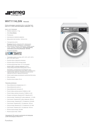 WHT1114LSIN Nowość Pralka wolnostojąca, szerokość: 60 cm, seria High Tech, klasa: A+++ (-10%), silnik Direct Motion, załadunek: 11 kg EAN13: 8017709209490 Wielkość załadunku: 11 kg Silnik Direct Motion Funkcja pary Automatyczne rozłożenie załadunku Maksymalna ilość obrotów: 1400 obr./min. 16 programów prania Programy: Bawełna, Bawełna ECO, Odwirowanie, Sport, Mix, Koszule, Antyalergiczny, Ultradelikatny, Ciemne tkaniny, Pierzyna, Pranie ręczne, Jedwab, Szybki 14 min., Syntetyki, Odświeżanie, Cykl prania bawełny zatwierdzony przez firmę Woolmark - M14104 Programy specjalne: Temperatury prania: na zimno, 20°C, 30°C, 40°C, 50°C, 60°C, 70°C, 80°C, 90°C Przycisk wyboru wyłączenia wirowania Przycisk wyboru funkcji zimnego prania Funkcja opóźnionego startu: od 1 do 24 godzin Pranie w 20°C z ręcznym wyborem (cykl ten oferuje efektywność prania równą praniu w 40°C) Wyświetlacz: przedstawienie pozostającego czasu, programowanie opóźnionego czasu startu, przedstawienie sugerowanego załadunku, wskazanie procesu prania, regulacja wirowania, regulacja temperatury System ograniczający powstawanie nadmiernej ilości piany Pełny Acquastop Średnica otworu bębna: 34 cm Parametry techniczne Klasa efektywności energetycznej: A+++ Klasa efektywności prania: A Klasa efektywności wirowania: B Poziom hałasu podczas prania: 59 dB(A) re 1pW Poziom hałasu podczas wirowania: 76 dB(A) re 1pW Program normatywny: Bawełna 60°C i Bawełna 40°C Zużycie energii - Bawełna 60°C pełny załadunek: 1.21 kWh Czas trwania - Bawełna 60°C pełny załadunek: 236 min. Zużycie energii - Bawełna 60°C 1/2 załadunku: 0.92 kWh Czas trwania - Bawełna 60°C 1/2 załadunku: 190 min. Zużycie energii- Bawełna 40°C 1/2 załadunek: 0.91 kWh Czas trwania - Bawełna 40°C 1/2 załadunek: 190 min. Roczne zużycie energii: 233 kWh Roczne zużycie wody: 13200 l Oszczędność 10% energii w porównaniu do tradycyjnej pralki wolnostojącej w klasie A+++ Functions Smeg Polska Sp. z o.o. ul. Cybernetyki 9 02-677 Warszawa Tel. +48 22 276 14 00 WHT1114LSIN pralki wolnostojące ładowane od przodu A+++-10%: Le lavabiancheria Maxi si distinguono per l’alta tecnologia in classe A++, +++, A+++-10%, A+++-50%, a seconda dei modelli, che permette il maggior risparmio di energia elettrica senza compromettere le prestazioni. Capacità di carico 11 kg: L’attenta progettazione della vasca e del cestello ha permesso di raggiungere una capacità di carico sino a 11 Kg di bucato nella lavabiancheria. Maxi oblò 34 cm: Le grandi dimensioni dell’oblò da 34 cm rendono le operazioni di carico e scarico del bucato ancora più agevoli e veloci favorendo la massima praticità d’uso. Direct Motion: La particolare posizione del motore inverter, collegato direttamente al cestello, aumenta la qualità del lavaggio, riduce le vibrazioni e incrementa la silenziosità della macchina. DUŻY ZAŁADUNEK: Niektóre modele pomieszczą 8 kg prania, przy zachowaniu najlepszych rezultatów i wysokiej klasie energetycznej. AUTOMATYCZNE ROZŁOŻENIE PRANIA: Pranie zostaje równo rozłożone w bębnie, system tak długo układa tkaniny w bębnie aż do osiągnięcia zupełnego zrównoważenia. Controllo dei consumi idrici: In tutti i modelli di lavabiancheria è presente il sistema di carico variabile, in base al quale la macchina diversifica automaticamente il ciclo di lavaggio e i tempi di funzionamento a seconda della quantità e del tipo di biancheria introdotta, consentendo un significativo risparmio di acqua e di energia elettrica. Regolazione centrifuga: Sui principali modelli di lavatrici e lavasciuga Smeg è possibile impostare la velocità di centrifuga, in alcuni sino a 1600 giri/min., o addirittura escluderla. WYŚWIETLACZ LCD: W celu optymalizacji wydajności oraz uproszczenia codziennej obsługi, wybrane urządzenia zostały wyposażone w przejrzysty wyświetlacz LCD, przedstawiający wybrane funkcje oraz stan pracy. Partenza differita: Consente di posticipare fino a 24 ore l’avvio del programma, in base alle proprie esigenze, e di effettuare quindi il lavaggio anche nelle fasce orarie in cui il costo dell’energia è minore. BLOKADA BEZPIECZEŃSTWA: Blokady przeciwko dzieciom są stosowane w takich urządzeniach jak kuchenki, płyty grzewcze i zmywarki. Gdy opcja jest włączona wszystkie funkcje i programy są zablokowane, włącznie z funkcjami włączania i wyłączania urządzenia, co zapewnia pełne bezpieczeństwo dla dzieci. ОПЦИЯ "ПРОТИВ СКЛАДОК" : При выборе этой опции изменяются фазы стирки и полоскания, уменьшается скорость окончательного отжима - это позволяет предотвратить образование складок на деликатных тканях, и делает процесс глажения проще. Risciacquo aggiuntivo: Opzione che aggiunge un ulteriore risciacquo a quello già previsto nel programma scelto, per eliminare ogni residuo di detersivo. Questa funzione è particolarmente indicata per chi soffre di allergie o problemi cutanei. Opzione Vapore: L’opzione vapore disponibile su alcuni programmi è indicata per distendere le pieghe, rinfrescare i tessuti, neutralizzare gli odori e sciogliere lo sporco distruggendo gli allergeni in meno tempo rispetto al lavaggio del capo con immersione in acqua. Opzione prelavaggio: Opzione prelavaggio Smeg Polska Sp. z o.o. ul. Cybernetyki 9 02-677 Warszawa Tel. +48 22 276 14 00 WHT1114LSIN pralki wolnostojące ładowane od przodu Smeg Polska Sp. z o.o. ul. Cybernetyki 9 02-677 Warszawa Tel. +48 22 276 14 00