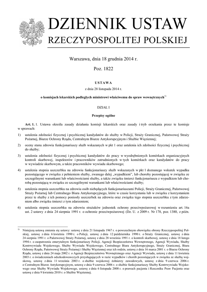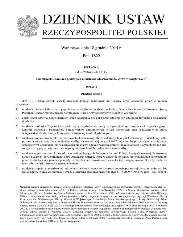 DZIENNIK USTAW RZECZYPOSPOLITEJ POLSKIEJ Warszawa, dnia 18 grudnia 2014 r. Poz. 1822 US T AW A z dnia 28 listopada 2014 r. o komisjach lekarskich podległych ministrowi właściwemu do spraw wewnętrznych1) DZIAŁ I Przepisy ogólne Art. 1. 1. Ustawa określa zasady działania komisji lekarskich oraz zasady i tryb orzekania przez te komisje w sprawach: 1) ustalenia zdolności fizycznej i psychicznej kandydatów do służby w Policji, Straży Granicznej, Państwowej Straży Pożarnej, Biurze Ochrony Rządu, Centralnym Biurze Antykorupcyjnym i Służbie Więziennej; 2) oceny stanu zdrowia funkcjonariuszy służb wskazanych w pkt 1 oraz ustalenia ich zdolności fizycznej i psychicznej do służby; 3) ustalenia zdolności fizycznej i psychicznej kandydatów do pracy w wyodrębnionych komórkach organizacyjnych kontroli skarbowej, inspektorów i pracowników zatrudnionych w tych komórkach oraz kandydatów do pracy w wywiadzie skarbowym, a także pracowników wywiadu skarbowego; 4) ustalenia stopnia uszczerbku na zdrowiu funkcjonariuszy służb wskazanych w pkt 1 doznanego wskutek wypadku pozostającego w związku z pełnieniem służby, zwanego dalej „wypadkiem”, lub choroby pozostającej w związku ze szczególnymi warunkami lub właściwościami służby, a także związku śmierci funkcjonariusza z wypadkiem lub chorobą pozostającą w związku ze szczególnymi warunkami lub właściwościami służby; 5) ustalenia stopnia uszczerbku na zdrowiu osób niebędących funkcjonariuszami Policji, Straży Granicznej, Państwowej Straży Pożarnej lub Centralnego Biura Antykorupcyjnego, które w czasie korzystania lub w związku z korzystaniem przez te służby z ich pomocy poniosły uszczerbek na zdrowiu oraz związku tego stopnia uszczerbku z tym zdarzeniem albo związku śmierci z tym zdarzeniem; 6) ustalenia stopnia uszczerbku na zdrowiu strażaków jednostek ochrony przeciwpożarowej w rozumieniu art. 16a ust. 2 ustawy z dnia 24 sierpnia 1991 r. o ochronie przeciwpożarowej (Dz. U. z 2009 r. Nr 178, poz. 1380, z późn. 1) Niniejszą ustawą zmienia się ustawy: ustawę z dnia 21 listopada 1967 r. o powszechnym obowiązku obrony Rzeczypospolitej Polskiej, ustawę z dnia 6 kwietnia 1990 r. o Policji, ustawę z dnia 12 października 1990 r. o Straży Granicznej, ustawę z dnia 24 sierpnia 1991 r. o Państwowej Straży Pożarnej, ustawę z dnia 28 września 1991 r. o kontroli skarbowej, ustawę z dnia 18 lutego 1994 r. o zaopatrzeniu emerytalnym funkcjonariuszy Policji, Agencji Bezpieczeństwa Wewnętrznego, Agencji Wywiadu, Służby Kontrwywiadu Wojskowego, Służby Wywiadu Wojskowego, Centralnego Biura Antykorupcyjnego, Straży Granicznej, Biura Ochrony Rządu, Państwowej Straży Pożarnej i Służby Więziennej oraz ich rodzin, ustawę z dnia 16 marca 2001 r. o Biurze Ochrony Rządu, ustawę z dnia 24 maja 2002 r. o Agencji Bezpieczeństwa Wewnętrznego oraz Agencji Wywiadu, ustawę z dnia 11 kwietnia 2003 r. o świadczeniach odszkodowawczych przysługujących w razie wypadków i chorób pozostających w związku ze służbą wojskową, ustawę z dnia 11 września 2003 r. o służbie wojskowej żołnierzy zawodowych, ustawę z dnia 9 czerwca 2006 r. o Centralnym Biurze Antykorupcyjnym, ustawę z dnia 9 czerwca 2006 r. o służbie funkcjonariuszy Służby Kontrwywiadu Wojskowego oraz Służby Wywiadu Wojskowego, ustawę z dnia 6 listopada 2008 r. o prawach pacjenta i Rzeczniku Praw Pacjenta oraz ustawę z dnia 9 kwietnia 2010 r. o Służbie Więziennej. Dziennik Ustaw –2– Poz. 1822 zm.2)) oraz członków ochotniczej straży pożarnej, którzy doznali uszczerbku na zdrowiu w związku z udziałem w działaniach ratowniczych lub ćwiczeniach; 7) ustalenia stopnia uszczerbku na zdrowiu osób udzielających pomocy pracownikom wywiadu skarbowego w wykonywaniu czynności operacyjno-rozpoznawczych, które w czasie udzielania tej pomocy lub w związku z jej udzielaniem poniosły uszczerbek na zdrowiu albo związku śmierci z tym zdarzeniem; 8) uznania funkcjonariuszy służb wskazanych w pkt 1, funkcjonariuszy zwolnionych z tych służb za inwalidów lub uznania ich za niezdolnych do samodzielnej egzystencji, jak również ustalenia związku albo braku związku inwalidztwa ze służbą albo ustalenia związku albo braku związku śmierci ze służbą funkcjonariuszy i funkcjonariuszy zwolnionych ze służby; 9) ustalenia zdolności do pracy funkcjonariuszy służb, o których mowa w pkt 1, zwolnionych ze służby, w celu określenia grupy inwalidzkiej; 10) potrzeby udzielenia urlopu zdrowotnego funkcjonariuszowi Policji, Straży Granicznej, Państwowej Straży Pożarnej i Służby Więziennej; 11) kontroli prawidłowości orzekania o czasowej niezdolności do służby z powodu choroby lub prawidłowości wykorzystania zwolnienia lekarskiego przez funkcjonariuszy służb, o których mowa w pkt 1. 2. Komisje lekarskie podlegają ministrowi właściwemu do spraw wewnętrznych. Art. 2. 1. Komisje lekarskie są właściwe do orzekania wobec: 1) kandydatów do służby w Policji, Straży Granicznej, Państwowej Straży Pożarnej, Biurze Ochrony Rządu, Centralnym Biurze Antykorupcyjnym i Służbie Więziennej; 2) funkcjonariuszy Policji, Straży Granicznej, Państwowej Straży Pożarnej, Biura Ochrony Rządu, Centralnego Biura Antykorupcyjnego i Służby Więziennej; 3) funkcjonariuszy Policji, Straży Granicznej, Państwowej Straży Pożarnej, Biura Ochrony Rządu, Centralnego Biura Antykorupcyjnego i Służby Więziennej zwolnionych ze służby lub których stosunek służbowy wygasł; 4) emerytów i rencistów. 2. Komisje lekarskie są właściwe również do orzekania wobec: 1) kandydatów do pracy w wyodrębnionych komórkach organizacyjnych kontroli skarbowej, inspektorów i pracowników zatrudnionych w tych komórkach oraz kandydatów do pracy w wywiadzie skarbowym, a także pracowników wywiadu skarbowego; 2) osób niebędących funkcjonariuszami Policji, Straży Granicznej, Państwowej St