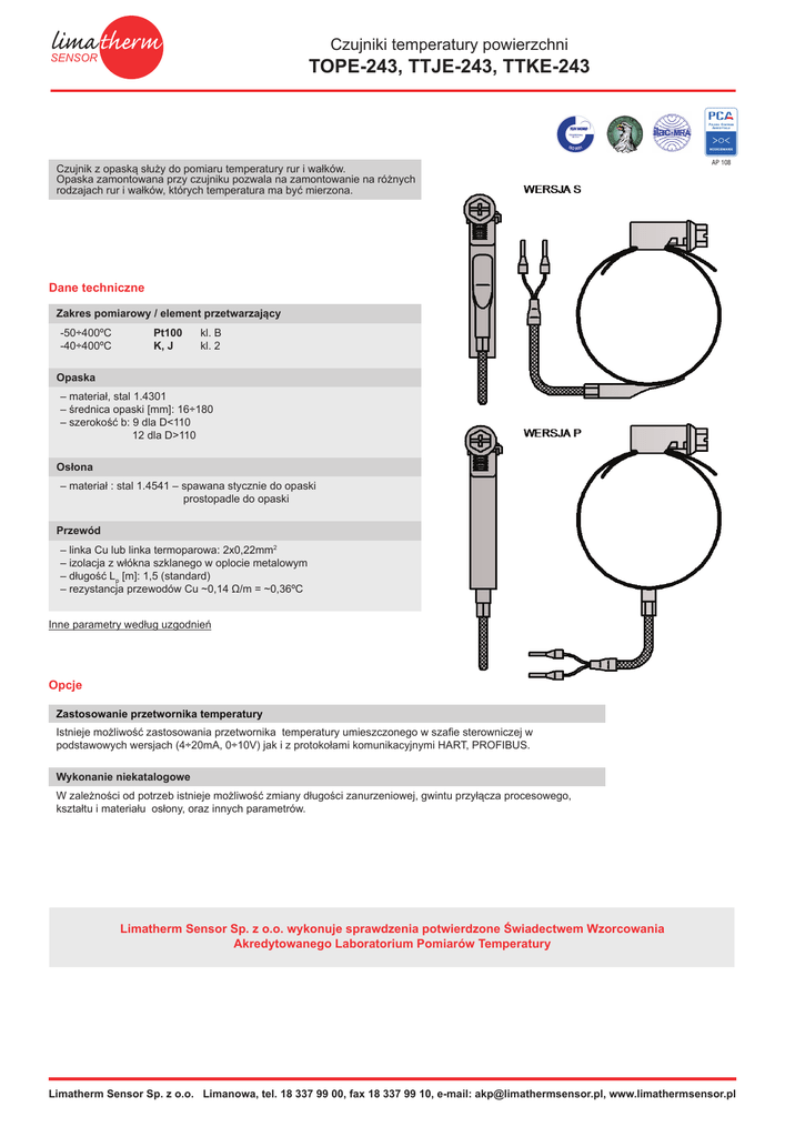 Czujniki temperatury powierzchni SENSOR TOPE-243, TTJE-243, TTKE-243 Czujnik z opaską służy do pomiaru temperatury rur i wałków. Opaska zamontowana przy czujniku pozwala na zamontowanie na różnych rodzajach rur i wałków, których temperatura ma być mierzona. Dane techniczne Zakres pomiarowy / element przetwarzający -50÷400ºC -40÷400ºC Pt100 K, J kl. B kl. 2 Opaska – materiał, stal 1.4301 – średnica opaski [mm]: 16÷180 – szerokość b: 9 dla D<110 12 dla D>110 Osłona – materiał : stal 1.4541 – spawana stycznie do opaski prostopadle do opaski Przewód – linka Cu lub linka termoparowa: 2x0,22mm2 – izolacja z włókna szklanego w oplocie metalowym – długość Lp [m]: 1,5 (standard) – rezystancja przewodów Cu ~0,14 Ω/m = ~0,36ºC Inne parametry według uzgodnień Opcje Zastosowanie przetwornika temperatury Istnieje możliwość zastosowania przetwornika temperatury umieszczonego w szafie sterowniczej w podstawowych wersjach (4÷20mA, 0÷10V) jak i z protokołami komunikacyjnymi HART, PROFIBUS. Wykonanie niekatalogowe W zależności od potrzeb istnieje możliwość zmiany długości zanurzeniowej, gwintu przyłącza procesowego, kształtu i materiału osłony, oraz innych parametrów. Limatherm Sensor Sp. z o.o. wykonuje sprawdzenia potwierdzone Świadectwem Wzorcowania Akredytowanego Laboratorium Pomiarów Temperatury Limatherm Sensor Sp. z o.o. Limanowa, tel. 18 337 99 00, fax 18 337 99 10, e-mail: [email protected], www.limathermsensor.pl Czujniki temperatury powierzchni SENSOR TOPE-243, TTJE-243, TTKE-243 WERSJA S Izolacje przewodów kompensacyjnych / termoelektrycznych Zakres temperatury pracy [°C] Właściwości PCW (PCV) -10÷105 Stosowany w łagodnych warunkach otoczenia. Wodoodporny i elastyczny Yc-polwinit -10÷105 Stosowany w łagodnych warunkach otoczenia. Wodoodporny i elastyczny FEP-teflon -50÷200 Odporny na działanie olejów, kwasów i innych agresywnych cieczy. Dobra elastyczność giętkość. Si-silikon -50÷180 Wodoodporny, elastyczny stosowany w warunkach podwyższonej wilgotności. Ws-włókno szklane -60÷400 Dobra odporność na wysoką temperaturę. Słaba odporność na wnikanie cieczy. D Lp Materiał izolacji Uwagi: Dodatkowo na przewody zakładane są oploty/ekrany/miedziane lub stalowe zapobiegające zakłóceniom elektrycznym, równocześnie podwyższające odporność izolacji przewodów na uszkodzenia mechaniczne. W przypadku dłuższego odcinka przewodu, aplikacja może wymagać uziemienia, aby zminimalizować ingerencję "hałasu" w obwodzie pomiarowym. WERSJA P D 9 Tolerancje klas rezystorów i czujników z rezystorami Pt wg normy PN-EN 60751 Klasy czujników Lp Wzór na obliczenie dopuszczalnych odchyłek [°C] Zakres stosowania dla rezystorów [°C] AA 0÷150 T = ±(0,10 + 0,0017 |t|) A -30÷300 T = ±(0,15 + 0,002 |t|) B -50÷500 T = ±(0,3 + 0,005 |t|) | t |- wartość bezwzględna temperatury Obwód pomiarowy 1 x Pt100 2-przew 2 x Pt100 3-przew 4-przew 2-przew 3-przew 4-przew x x x 1 x TC 2 x TC 2-przew 2-przew x Tolerancja dla klas termoelementów wg normy PN-EN 60584 Typ termoelementu Klasa 1 Klasa 2 Zakres stosowania [°C] Tolerancja [°C] Zakres stosowania [°C] Tolerancja [°C] J Fe-CuNi od -40 do +375 od +375 do +750 ±1,5 ±0,004 |t| od -40 do +333 od +333 do +750 ±2,5 ±0,0075 |t| K NiCr-NiAl od -40 do +375 od +375 do +1000 ±1,5 ±0,004 |t| od -40 do +333 od +333 do +1200 ±2,5 ±0,0075 |t| | t |- wartość bezwzględna temperatury Limatherm Sensor Sp. z o.o. Limanowa, tel. 18 337 99 00, fax 18 337 99 10, e-mail: [email protected], www.limathermsensor.pl Czujniki temperatury powierzchni SENSOR TOPE-243, TTJE-243, TTKE-243 Schematy połączeń Pt100 (rezystor termometryczny) 2-przewodowy 3-przewodowy biały 2-przewodowy 4-przewodowy biały biały żółty biały czerwony czerwony białły żółty 2xPt100/3 2xPt100/2 Pt100/4 Pt100/3 Pt100/2 biały czerwony 3-przewodowy czarny czerwony czerwony czerwony czarny czarny czerwony TC (termoelement) + czerwony + czarny FeCu-Ni /J/ - zielony NiCr-NiAl /K/ - biały biały Rodzaje i kolorystyka przewodów według normy EU D GB F USA Termoelement typu J czarny czarny niebieski czerwony czarny biały niebieski niebieski czerwony czerwony brązowy zielony niebieski żółty czarny żółty czarny czarny biały czerwony Termoelement typu K zielony zielony zielony biały fioletowy żółty fioletowy żółty żółty czerwony Kod wyrobu Element pomiarowy 1 OP rezystor Pt (tylko dla wersji S) TJ termoelement Fe-CuNi /J/ TK termoelement NiCr-NiAl /K/ Sposób umiejscowienia osłony 2 P promieniowo S stycznie Średnica rurociągu 40 40mm 25÷40 wyznaczony zakres średnicy dla opaski 3 inne parametry wg uzgodnień Rodzaj rezystora Pt100 4 Pt100/Pt500/Pt1000 inne parametry wg uzgodnień Limatherm Sensor Sp. z o.o. Limanowa, tel. 18 337 99 00, fax 18 337 99 10, e-mail: [email protected], www.limathermsensor.pl Czujniki temperatury powierzchni SENSOR TOPE-243, TTJE-243, TTKE-243 Dokładność 5 A lub B dla rezystora pomiarowego 1 lub 2 dla termoelementu Obwód pomiarowy 6 2 2 - przewodowy 3 3 - przewodowy 4 4 - przewodowy Długość przewodu 1,5 7 1,5m inne parametry wg uzgodnień Izolacja przewodu 8 silikon Ws włókno szklane w oplocie stalowym F teflon 2 1 T Si E-243 Przykład zamówienia: 3 – 4 – 5 – 6 – 7 – 8 – TTJE-243S–25÷40–2–1,5m–Si oznacza pojedynczy czujnik termoelektryczny Fe–CuNi kl. 2, z osłoną spawaną stycznie do opaski, średnica opaski 25÷40mm, z przewodem silikonowym o długości Lp=1,5m Limatherm Sensor Sp. z o.o. Limanowa, tel. 18 337 99 00, fax 18 337 99 10, e-mail: [email protected], www.limathermsensor.pl