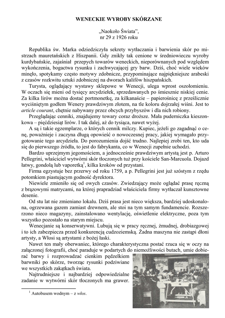 WENECKIE WYROBY SKÓRZANE „Naokoło Świata”, nr 29 z 1926 roku Republika św. Marka odziedziczyła sekrety wytłaczania i barwienia skór po mistrzach mauretańskich z Hiszpanii. Gdy znikły tak cenione w średniowieczu wyroby kurdybańskie, zajaśniał przepych towarów weneckich, nieporównanych pod względem wykończenia, bogactwa rysunku i zachwycającej gry barw. Dziś, choć wiele wieków minęło, spotykamy często motywy zdobnicze, przypominające najpiękniejsze arabeski z czasów rozkwitu sztuki zdobniczej na dworach kalifów hiszpańskich. Turysta, oglądający wystawy sklepowe w Wenecji, ulega wprost oszołomieniu. W oczach się mieni od tysięcy arcydziełek, sprzedawanych po śmiesznie niskiej cenie. Za kilka lirów można dostać portmonetkę, za kilkanaście – papierośnicę z prześlicznie wyciśniętym godłem Wenery prawdziwym złotem, na tle koloru dojrzałej wiśni. Jest to article courant, chętnie nabywany przez obcych przybyszów i dla nich robiony. Przeglądając cenniki, znajdujemy towary coraz droższe. Mała puderniczka kieszonkowa – pięćdziesiąt lirów. I tak dalej, aż do tysiąca, nawet wyżej. A są i takie egzemplarze, o których cennik milczy. Kupiec, jeżeli go zagadnąć o cenę, poważnieje i zaczyna długą opowieść o nowoczesnej pracy, jakiej wymagało przygotowanie tego arcydzieła. Do porozumienia dojść trudno. Najlepiej zrobi ten, kto uda się do pierwszego źródła, to jest do fabrykanta, co w Wenecji zupełnie uchodzi. Bardzo uprzejmym jegomościem, a jednocześnie prawdziwym artystą jest p. Arturo Pellegrini, właściciel wytwórni skór tłoczonych tuż przy kościele San-Marcuola. Dojazd łatwy, gondolą lub vaporetką1, kilka kroków od przystani. Firma egzystuje bez przerwy od roku 1759, a p. Pellegrini jest już szóstym z rzędu potomkiem piastującym godność dyrektora. Niewiele zmieniło się od owych czasów. Zwiedzający może oglądać prasę ręczną z brązowymi matrycami, na której prapradziad właściciela firmy wytłaczał kunsztowne desenie. Od stu lat nie zmieniano lokalu. Dziś prasa jest nieco większa, bardziej udoskonalona, ogrzewana gazem zamiast drewnem, ale stoi na tym samym fundamencie. Rozszerzono nieco magazyny, zainstalowano wentylację, oświetlenie elektryczne, poza tym wszystko pozostało na starym miejscu. Wenecjanie są konserwatywni. Lubują się w pracy ręcznej, żmudnej, drobiazgowej i to ich zabezpiecza przed konkurencją cudzoziemską. Żadna maszyna nie zastąpi dłoni artysty, a Włosi są artystami z bożej łaski. Nawet ten mały oberwaniec, którego charakterystyczna postać rzuca się w oczy na załączonej fotografii, choć paraduje w podartych do niemożliwości butach, umie dobierać barwy i rozprowadzać cienkim pędzelkiem barwniki po skórze, tworząc rysunki podziwiane we wszystkich zakątkach świata. Najtrudniejsze i najbardziej odpowiedzialne zadanie w wytwórni skór tłoczonych ma grawer. 1 Autobusem wodnym – z włos. Większe firmy zatrudniają po kilku takich specjalistów, w mniejszych jeden wystarcza. Grawer musi być przede wszystkim dobrym rysownikiem, artystą w całym znaczeniu tego słowa. Nie wolno mu popełnić błędu. Maleńka skaza na matrycy, jedno niebaczne uderzenie młotkiem może uszkodzić mozolną pracę, a brąz jest kosztownym stopem. Matryce rzeźbi się ręcznie w płytach grubości półtora centymetra. Są to niesłychanie subtelne bas-reliefy, w których motyw należy sobie wyobrazić odwrotnie. To, co na negatywie jest wklęsłe, na skórze otrzymuje się wypukłe. Jeżeli weźmiemy pod uwagę wymiary matryc, które dochodzą częstokroć do ośmiuset centymetrów kwadratowych, to zrozumiemy łatwo, ile pracy pochłonęło przygotowanie takiego negatywu i dlaczego w cennikach sklepowych nie wspomniano o cenie. Nabywcami takich majstersztyków są przeważnie bogaci Amerykanie. Dolar drogi, liry tanie, potargować się warto. Wytłaczanie odbywa się na gorąco. Ogrzaną do temperatury 70 stopni matrycę umieszcza robotnik w prasie i, nie zwlekając, podsuwa odcinek skóry. Ciśnienie reguluje dźwignia ręczna lub przyrząd automatyczny. Skóra nie może być zbyt sucha ani wilgotna, gdyż po pewnym czasie stałaby się łamliwa. Po wyjęciu spod prasy egzemplarze „dojrzewają” przez kilka godzin, po czym majster bada je przy pomocy szkła powiększającego. Egzamin cenniejszych jednostek bywa wyjątkowo skrupulatny. Po ich zakwalifikowaniu do pracy przystępują malarze. Jest ich cały legion. Malują starzy, młodzi, chłopcy, dziewczęta. Stoły zastawione setkami miseczek z barwnikami. Gwar panuje nieustający, choć na ścianach wiszą tabliczki z napisem „Lavorare in silenzio” – pracuj w ciszy. Od czasu do czasu ktoś zanuci arię z jakiejś opery, a wtedy cała sala nagle wybucha chóralnym śpiewem. Rytm doskonały, podzielili się na głosy. Nawet pan dyrektor, który wywiesił tabliczkę z napomnieniem, nie może się powstrzymać i potężnym basem wtóruje robotnikom. Szczegół godny uwagi. Wenecjanki, dumne ze swych wspaniałych włosów, zignorowały modę i czeszą się nadal jak przed laty. – W mojej wytwórni – oświadcza p. Pellegrini – ani jedna panna nie obcięła sobie włosów. Były wprawdzie sporadyczne zachcianki, ale ogół pracowników nie dopuścił do czegoś podobnego. Córeczka fabrykanta, grzeczna mała osóbka, nosi długie warkocze. Widzimy ją na zdjęciu. Trzyma na kolanach świeżo odciśnięty pozytyw, a obok, na stołku, widać brązową matrycę. Panna Pellegrini pracuje w malarni skór na równi z robotnicami. Zdradza duże zdolności rysunkowe. Nie mniejszy gwar panuje w introligatorni. Tu już trudno o nucenie pieśni. Stuk młotków wybije z taktu najlepszego śpiewaka. W ciemnej, dość skąpo oświetlonej żarówkami sali powstają ze skrawków skór tysiące przedziwnych cacek. Notesy, których szkoda nosić w kieszeni, przybory toaletowe, zastawy na biurka, serwety, podusz