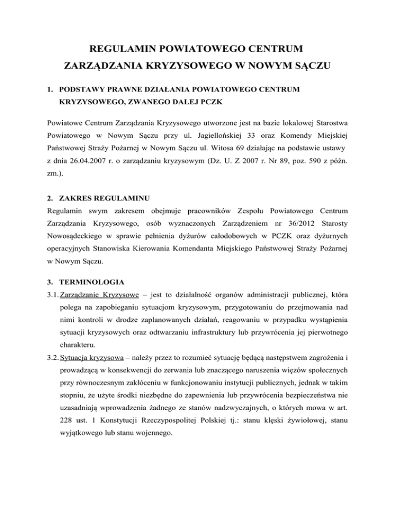 REGULAMIN POWIATOWEGO CENTRUM ZARZĄDZANIA KRYZYSOWEGO W NOWYM SĄCZU 1. PODSTAWY PRAWNE DZIAŁANIA POWIATOWEGO CENTRUM KRYZYSOWEGO, ZWANEGO DALEJ PCZK Powiatowe Centrum Zarządzania Kryzysowego utworzone jest na bazie lokalowej Starostwa Powiatowego w Nowym Sączu przy ul. Jagiellońskiej 33 oraz Komendy Miejskiej Państwowej Straży Pożarnej w Nowym Sączu ul. Witosa 69 działając na podstawie ustawy z dnia 26.04.2007 r. o zarządzaniu kryzysowym (Dz. U. Z 2007 r. Nr 89, poz. 590 z późn. zm.). 2. ZAKRES REGULAMINU Regulamin swym zakresem obejmuje pracowników Zespołu Powiatowego Centrum Zarządzania Kryzysowego, osób wyznaczonych Zarządzeniem nr 36/2012 Starosty Nowosądeckiego w sprawie pełnienia dyżurów całodobowych w PCZK oraz dyżurnych operacyjnych Stanowiska Kierowania Komendanta Miejskiego Państwowej Straży Pożarnej w Nowym Sączu. 3. TERMINOLOGIA 3.1. Zarządzanie Kryzysowe – jest to działalność organów administracji publicznej, która polega na zapobieganiu sytuacjom kryzysowym, przygotowaniu do przejmowania nad nimi kontroli w drodze zaplanowanych działań, reagowaniu w przypadku wystąpienia sytuacji kryzysowych oraz odtwarzaniu infrastruktury lub przywrócenia jej pierwotnego charakteru. 3.2. Sytuacja kryzysowa – należy przez to rozumieć sytuację będącą następstwem zagrożenia i prowadzącą w konsekwencji do zerwania lub znaczącego naruszenia więzów społecznych przy równoczesnym zakłóceniu w funkcjonowaniu instytucji publicznych, jednak w takim stopniu, że użyte środki niezbędne do zapewnienia lub przywrócenia bezpieczeństwa nie uzasadniają wprowadzenia żadnego ze stanów nadzwyczajnych, o których mowa w art. 228 ust. 1 Konstytucji Rzeczypospolitej Polskiej tj.: stanu klęski żywiołowej, stanu wyjątkowego lub stanu wojennego. 3.3. Infrastruktura krytyczna – należy przez to rozumieć systemy oraz wchodzące w ich skład powiązane ze sobą funkcjonalnie obiekty, w tym obiekty budowlane, urządzenia, instytucje, usługi kluczowe dla bezpieczeństwa państwa i jego obywateli oraz służące zapewnieniu sprawnego funkcjonowania organów administracji publicznej, a także instytucji i przedsiębiorców. Infrastruktura krytyczna obejmuje systemy: • zaopatrzenia w energię i paliwa, • łączności i sieci teleinformatycznych, • finansowe, • zaopatrzenie w żywność i wodę, • ochrony zdrowia, • transportowe i komunikacyjne • ratownicze • zapewniające ciągłość działania administracji publicznej, • produkcji, składowania, przechowywania i stosowania substancji chemicznych i promieniotwórczych, w tym rurociągi substancji niebezpiecznych. 4. ODPOWIEDZIALNOŚĆ I UPRAWNIENIA 4.1.Starosta Nowosądecki jest organem właściwym w sprawach zarządzania kryzysowego na terenie powiatu i jemu bezpośrednio podlega PCZK, kierowane przez Kierownika PCZK Starostwa Powiatowego w Nowym Sączu Kierownik PCZK odpowiada za organizacje i prawidłowe funkcjonowanie PCZK. 4.2.Naczelnik Wydziału Operacyjnego – Szkoleniowego KM PSP w Nowym Sączu – odpowiada za organizację i prawidłowe funkcjonowanie służby dyżurnej SKKMPSP oraz w zakresie realizacji zadań PCZK określonych w pkt. 6.3 5. SPOSÓB REALIZACJI ZADAŃ PRZEZ PCZK Do czasu uruchomienia przez Starostę Nowosądeckiego całodobowego dyżuru pracowników Powiatowego Centrum Zarządzania Kryzysowego, zadania o których mowa w pkt. 6.1, realizowane będą w następujący sposób: 5.1 w godzinach pracy Starostwa Powiatowego w Nowym Sączu – przez pracowników Zespołu Powiatowe Centrum Zarządzania Kryzysowego, zwanych dalej pracownikami PCZK 5.2 po godzinach pracy Starostwa Powiatowego w Nowym Sączu oraz w dni ustawowo wolne od pracy przez dyżurnych operacyjnych Stanowiska Kierowania Komendanta Miejskiego Państwowej Straży Pożarnej w Nowym Sączu, zwanych dalej dyżurnymi operacyjnymi SKKMPSP – na zasadach określonych w odrębnym porozumieniu. 5.3 Dyżurni operacyjni SKKMPSP, w razie kolizji zadań, w pierwszej kolejności realizują zadania własne po czym niezwłocznie przystępują do realizacji zadań PCZK. W przypadku braku możliwości realizacji zadań PCZK przez dyżurnych operacyjnych SKKMPSP, powiadamiają oni Kierownika PCZK, który podejmuje decyzję o przejęciu służby dyżurnej PCZK. 6. ZADANIA PCZK 6.1. Do podstawowych zadań PCZK należy: a) pełnienie całodobowego dyżuru w celu zapewnienia przepływu informacji na potrzeby zarządzania kryzysowego, b) współdziałanie z centrami zarządzania kryzysowego administracji publicznej, c) nadzór nad funkcjonowaniem systemu wykrywania i alarmowania oraz systemu wczesnego ostrzegania ludności, d) współpraca z podmiotami realizującymi monitoring środowiska, e) współdziałanie z podmiotami prowadzącymi działania ratownicze, poszukiwawcze i humanitarne, f) dokumentowanie działań podejmowanych przez centrum, g) realizacja zadań stałego dyżuru na potrzeby podwyższenia gotowości obronnej państwa. 6.2. Do podstawowych zadań PCZK realizowanych w godzinach pracy Starostwa przez pracowników PCZK, należy realizacja wszystkich zadań, o których mowa w pkt. 6.1, a w szczególności: a) pełnienie dyżuru w celu zapewnienia przepływu informacji na potrzeby zarządzania kryzysowego. W przypadku otrzymania informacji o powstaniu sytuacji kryzysowej lub innego rodzaju nadzwyczajnego zagrożenia na terenie powiatu, niezwłoczne powiadomienie Starosty Nowosądeckiego. b) współdziałanie z centrami zarządzania kryzysowego organów administracji publicznej tj. Wojewódzkim Centrum Zarządzania Kryzysowego w Krakowie (zwanej dalej WCZK), powiatów sąsiednich oraz gmin powiatu nowosądeckiego. Do zadań w tym zakresie należy w szczególności: przyjmowanie i przesyłanie: meldunków meteorologicznych, hydrologicznych, informacji o zagrożeniach oraz innych danych mających wpływ na bezpieczeństwo mieszkańców powiatu, przekazywanie meldunków dobowych, okresowych i sytuacyjnych d