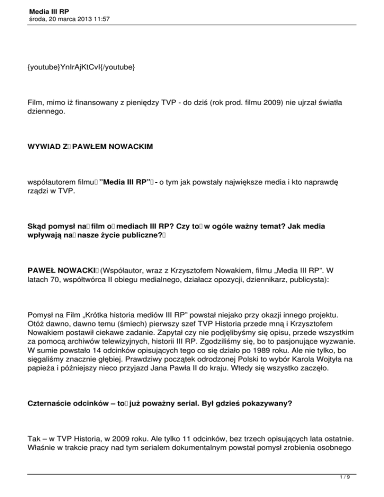 wpływają na nasze życie publiczne? PAWEŁ NOWACKI (Współautor, wraz z Krzysztofem Nowakiem, filmu „Media III RP”. W