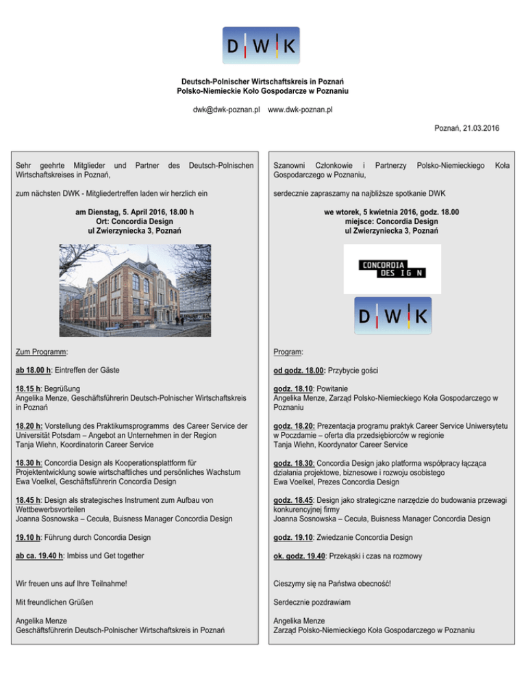 Deutsch-Polnischer Wirtschaftskreis in Poznań Polsko-Niemieckie Koło Gospodarcze w Poznaniu [email protected] www.dwk-poznan.pl Poznań, 21.03.2016 Sehr geehrte Mitglieder und Wirtschaftskreises in Poznań, Partner des Deutsch-Polnischen zum nächsten DWK - Mitgliedertreffen laden wir herzlich ein Szanowni Członkowie i Gospodarczego w Poznaniu, Partnerzy Polsko-Niemieckiego Koła serdecznie zapraszamy na najbliższe spotkanie DWK am Dienstag, 5. April 2016, 18.00 h Ort: Concordia Design ul Zwierzyniecka 3, Poznań we wtorek, 5 kwietnia 2016, godz. 18.00 miejsce: Concordia Design ul Zwierzyniecka 3, Poznań Zum Programm: Program: ab 18.00 h: Eintreffen der Gäste od godz. 18.00: Przybycie gości 18.15 h: Begrüßung Angelika Menze, Geschäftsführerin Deutsch-Polnischer Wirtschaftskreis in Poznań godz. 18.10: Powitanie Angelika Menze, Zarząd Polsko-Niemieckiego Koła Gospodarczego w Poznaniu 18.20 h: Vorstellung des Praktikumsprogramms des Career Service der Universität Potsdam – Angebot an Unternehmen in der Region Tanja Wiehn, Koordinatorin Career Service godz. 18.20: Prezentacja programu praktyk Career Service Uniwersytetu w Poczdamie – oferta dla przedsiębiorców w regionie Tanja Wiehn, Koordynator Career Service 18.30 h: Concordia Design als Kooperationsplattform für Projektentwicklung sowie wirtschaftliches und persönliches Wachstum Ewa Voelkel, Geschäftsführerin Concordia Design godz. 18.30: Concordia Design jako platforma współpracy łącząca działania projektowe, biznesowe i rozwoju osobistego Ewa Voelkel, Prezes Concordia Design 18.45 h: Design als strategisches Instrument zum Aufbau von Wettbewerbsvorteilen Joanna Sosnowska – Cecuła, Buisness Manager Concordia Design godz. 18.45: Design jako strategiczne narzędzie do budowania przewagi konkurencyjnej firmy Joanna Sosnowska – Cecuła, Buisness Manager Concordia Design 19.10 h: Führung durch Concordia Design godz. 19.10: Zwiedzanie Concordia Design ab ca. 19.40 h: Imbiss und Get together ok. godz. 19.40: Przekąski i czas na rozmowy Wir freuen uns auf Ihre Teilnahme! Cieszymy się na Państwa obecność! Mit freundlichen Grüßen Serdecznie pozdrawiam Angelika Menze Geschäftsführerin Deutsch-Polnischer Wirtschaftskreis in Poznań Angelika Menze Zarząd Polsko-Niemieckiego Koła Gospodarczego w Poznaniu