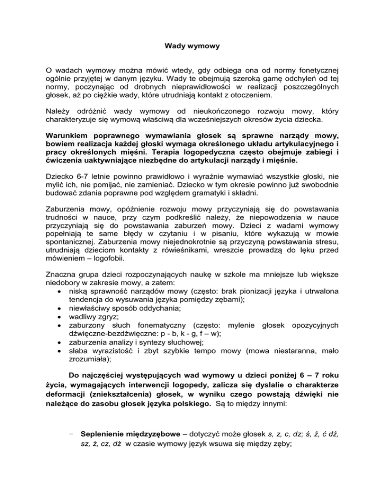 Wady wymowy O wadach wymowy można mówić wtedy, gdy