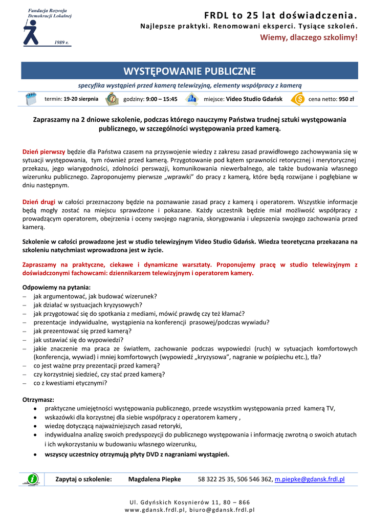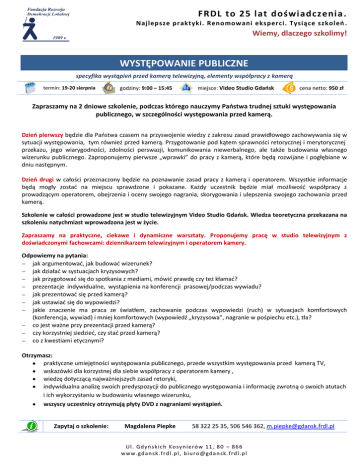 FRDL to 25 lat doświadczenia . Najlepsze praktyki. Renomowani eksperci. Tysiące szkoleń . Wiemy, dlaczego szkolimy! WYSTĘPOWANIE PUBLICZNE specyfika wystąpień przed kamerą telewizyjną, elementy współpracy z kamerą termin: 19-20 sierpnia godziny: 9:00 – 15:45 miejsce: Video Studio Gdańsk cena netto: 950 zł Zapraszamy na 2 dniowe szkolenie, podczas którego nauczymy Państwa trudnej sztuki występowania publicznego, w szczególności występowania przed kamerą. Dzień pierwszy będzie dla Państwa czasem na przyswojenie wiedzy z zakresu zasad prawidłowego zachowywania się w sytuacji występowania, tym również przed kamerą. Przygotowanie pod kątem sprawności retorycznej i merytorycznej przekazu, jego wiarygodności, zdolności perswazji, komunikowania niewerbalnego, ale także budowania własnego wizerunku publicznego. Zaproponujemy pierwsze „wprawki” do pracy z kamerą, które będą rozwijane i pogłębiane w dniu następnym. Dzień drugi w całości przeznaczony będzie na poznawanie zasad pracy z kamerą i operatorem. Wszystkie informacje będą mogły zostać na miejscu sprawdzone i pokazane. Każdy uczestnik będzie miał możliwość współpracy z prowadzącym operatorem, obejrzenia i oceny swojego nagrania, skorygowania i ulepszenia swojego zachowania przed kamerą. Szkolenie w całości prowadzone jest w studio telewizyjnym Video Studio Gdańsk. Wiedza teoretyczna przekazana na szkoleniu natychmiast wprowadzona jest w życie. Zapraszamy na praktyczne, ciekawe i dynamiczne warsztaty. Proponujemy pracę w studio telewizyjnym z doświadczonymi fachowcami: dziennikarzem telewizyjnym i operatorem kamery. Odpowiemy na pytania: jak argumentować, jak budować wizerunek? jak działać w systuacjach kryzysowych? jak przygotować się do spotkania z mediami, mówić prawdę czy też kłamać? prezentacje indywidualne, wystąpienia na konferencji prasowej/podczas wywiadu? jak prezentować się przed kamerą? jak ustawiać się do wypowiedzi? jakie znaczenie ma praca ze światłem, zachowanie podczas wypowiedzi (ruch) w sytuacjach komfortowych (konferencja, wywiad) i mniej komfortowych (wypowiedź „kryzysowa”, nagranie w pośpiechu etc.), tła? co jest ważne przy prezentacji przed kamerą? czy korzystniej siedzieć, czy stać przed kamerą? co z kwestiami etycznymi? Otrzymasz: praktyczne umiejętności występowania publicznego, przede wszystkim występowania przed kamerą TV, wskazówki dla korzystnej dla siebie współpracy z operatorem kamery , wiedzę dotyczącą najważniejszych zasad retoryki, indywidualna analizę swoich predyspozycji do publicznego występowania i informację zwrotną o swoich atutach i ich wykorzystaniu w budowaniu własnego wizerunku, wszyscy uczestnicy otrzymują płyty DVD z nagraniami wystąpień. Zapytaj o szkolenie: Magdalena Piepke 58 322 25 35, 506 546 362, [email protected] Ul . Gd y ń sk ich Ko sy n i eró w 11, 8 0 – 8 6 6 w w w. gd an sk .f rd l .p l , b iu ro @gd a n sk. frd l.p l PROWADZĄCY: Wojciech Suleciński - Dziennikarz oddziału gdańskiego TVP S.A. W telewizji od 24 lat i w tym czasie był reporterem, prezenterem, wydawcą programów informacyjnych, wydawcą dnia, kierownikiem redakcji programów informacyjnych, autorem reportaży i filmów dokumentalnych, autorem i prowadzącym programy publicystyczne oraz przez 5 lat sekretarzem programu. Zrealizował m.in. serię filmów dokumentalnych „Ludzie z pierwszych stron gazet”, film o stanie wojennym w Polsce i kilka reportaży ilustrujących wejście Wojska Polskiego do NATO. Prowadził i przygotowywał wiele cyklicznych programów telewizyjnych, realizowanych w związku z akcesją Polski do UE, m.in. „Rozmowy kontynentalne”, ale także programy edukacyjne m.in. w ramach kampanii społecznej „Ojczysty-dodaj do ulubionych”, produkowane przez Video Studio Gdańsk odpowiednio dla Urzędu Komitetu Integracji Europejskiej i Narodowego Centrum Kultury. produkowane przez Video Studio Gdańsk dla Urzędu Komitetu Integracji Europejskiej. Dziennikarstwem zajmuje się od 29 lat. Był uczestnikiem programu Know How Fund rządu brytyjskiego, co oznaczało m.in. szkolenie dziennikarskie w Wielkiej Brytanii w BBC i telewizjach niezależnych. Wojciech Ostrowski – Operator kamery, Absolwent Uniwersytetu Gdańskiego. W latach 1986-1990 brał udział w rejestracji wydarzeń społeczno-politycznych współtworząc archiwum Video Studio Gdańsk wykorzystane później do realizacji wielu filmów dokumentalnych dotyczących tego okresu takich jak: ''Lider'' w reż. Andrzeja TrzosaRastawieckiego /pełnometrażowy film dokumentalny o Lechu Wałęsie/ , ''Ostatki'' reż Andrzej Fidyk , ''Popiełuszko'' reż. Marian Terlecki. Uczestniczył z kamerą w wyprawach na Spitsbergen , Ziemię Franciszka Józefa oraz Wyspy Sołowieckie, gdzie powstały filmy ''Ślad na lodzie'' , ''Ziemia Franciszka Józefa'' ,''Sołowki - Ziemia Obiecana, Ziemia Przeklęta'' , ''Polonica Arktyczne'' /reż. Iwona Bartólewska/..Towarzyszył z kamerą polskim zdobywcom Bieguna Północnego i trzykrotnie Markowi Kamińskiemu. Współpracował przy realizacji spektakli telewizyjnych z takimi operatorami jak: Julian Szczerkowski , Krzysztof Pakulski , Tomasz Wert, Andrzej Jaroszewicz. METODOLOGIA: Praca warsztatowa w studio telewizyjnym, TV Video Studio Gdańsk, ul. Grodzka 20, Gdańsk, Nagrywanie wystąpień na kamerę, Ćwiczenia, konsultacje, WYŚLIJ ZGŁOSZENIE DO: 12.08.14, 15:00 [email protected] 58 550 32 39 FORMULARZ ZGŁOSZENIOWY: WYSTĘPOWANIE PUBLICZNE Nazwa Instytucji/Firmy (dane do FV): Adres: NIP: Telefon: Faks: 1. Imię, nazwisko , stanowisko e-mail Imię, nazwisko , stanowisko e-mail Imię, nazwisko , stanowisko e-mail 2. 3. Cena netto: 950 zł Udział w szkoleniu jest finansowane przynajmniej w 70 % ze środków publicznych TAK / NIE TAK / NIE Należność należy zapłacić przelewem po szkoleniu po otrzymaniu faktury VAT: Bank BPH, 21 10600076 0000 3210 0019 7591. Zgodnie z Ust. o Ochr